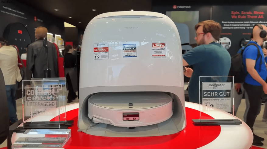 В сегменте роботов-пылесосов Roborock представил сверхтонкую модель Curevo Curve 2 Pro высотой всего 7,98 см. Устройство обладает мощностью всасывания 25 000 Па и оснащено адаптивным шасси. Станция для швабры очищает и сушит насадки водой, нагретой до 100°C. Стоимость модели составляет 1299 евро.