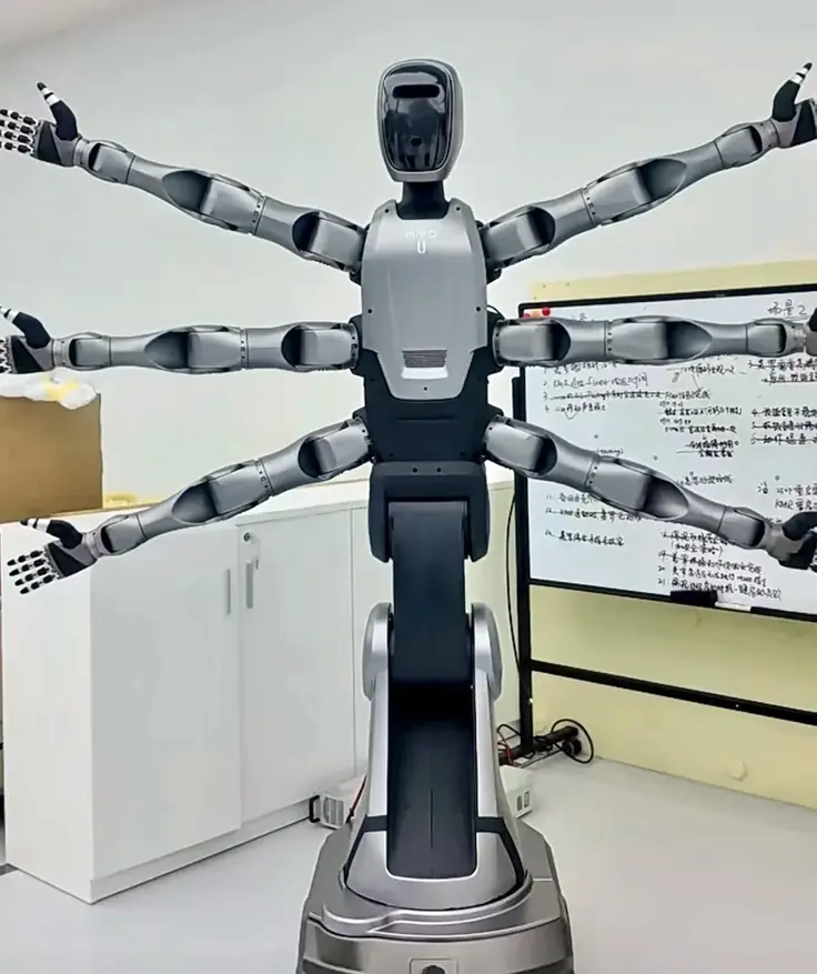 Miro U представляет собой третье поколение в линейке человекоподобных роботов Midea. Его конструкция разработана для выполнения конкретных промышленных задач. Вместо двуногой ходьбы робот оснащен колесной базой, обеспечивающей вращение на 360 градусов на месте и стабильное передвижение по ровным заводским полам. Ключевой особенностью модели являются шесть скоординированных манипуляторов, закрепленных на центральном корпусе. Такая конфигурация позволяет выполнять несколько операций параллельно. Например, одна пара рук может удерживать деталь, другая — менять оснастку на оборудовании, а третья — работать с кабелями или другими элементами.