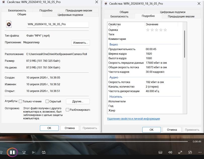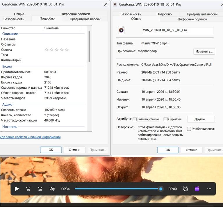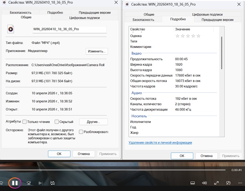 Видео сохраняется в формате MP4. В разрешении 3840*2160 30 FPS видео на 34 секунды заняло 289 МБ. 1080 30FPS длиной 41 секунду заняло 97 МБ. В качестве между 30 и 60 FPS разницы нет, разве что резкие движения при бОльшей частоте выглядят более плавными.