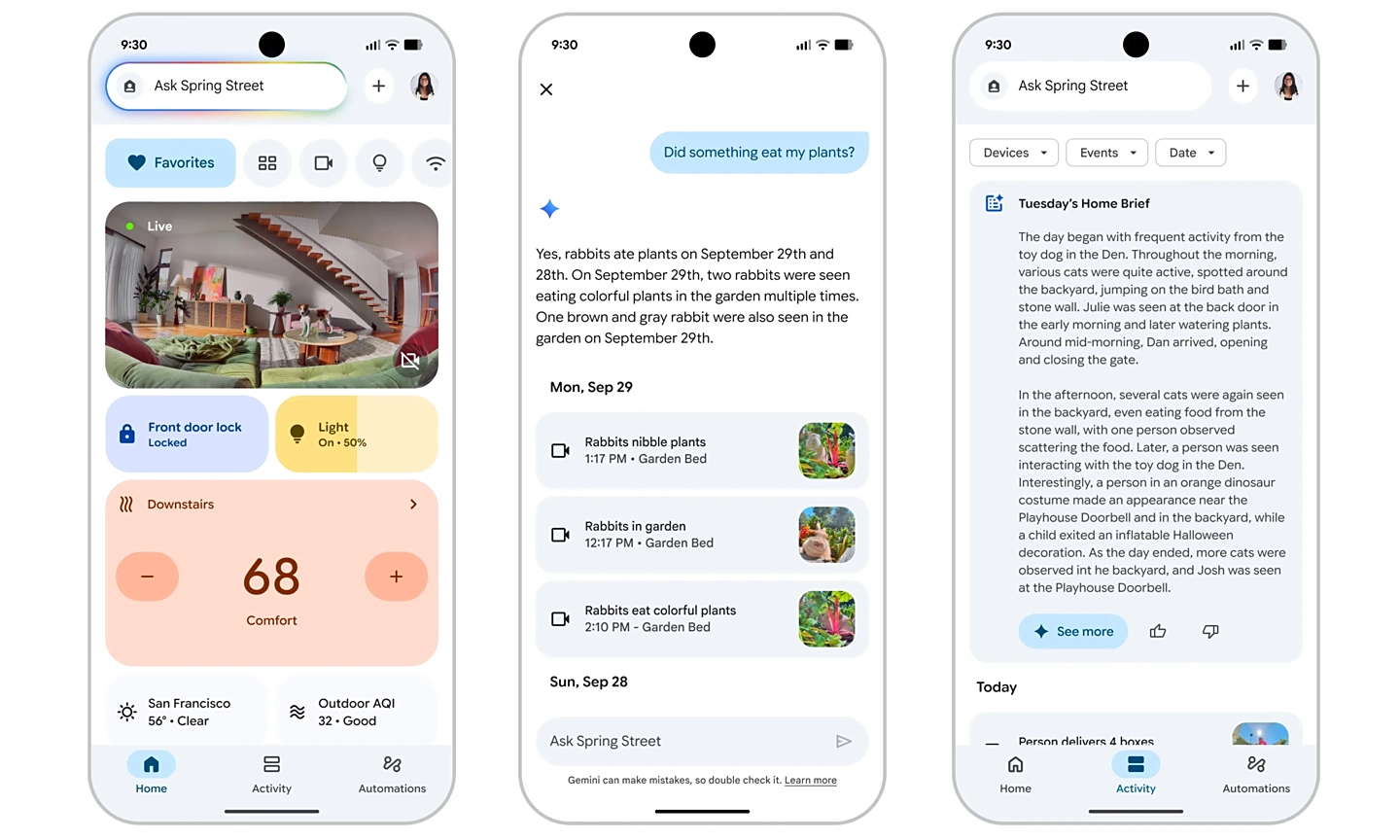 Ключевая особенность — ИИ-платформа Gemini for Home, способная понимать сложные команды на естественном языке. Например, пользователь может сказать: «Выключи все лампы, кроме тех, что в спальне», и система выполнит запрос корректно. Также доступна функция Ask Home: достаточно спросить «Как разбился вазон?», и Gemini автоматически найдёт и покажет соответствующий фрагмент записи.