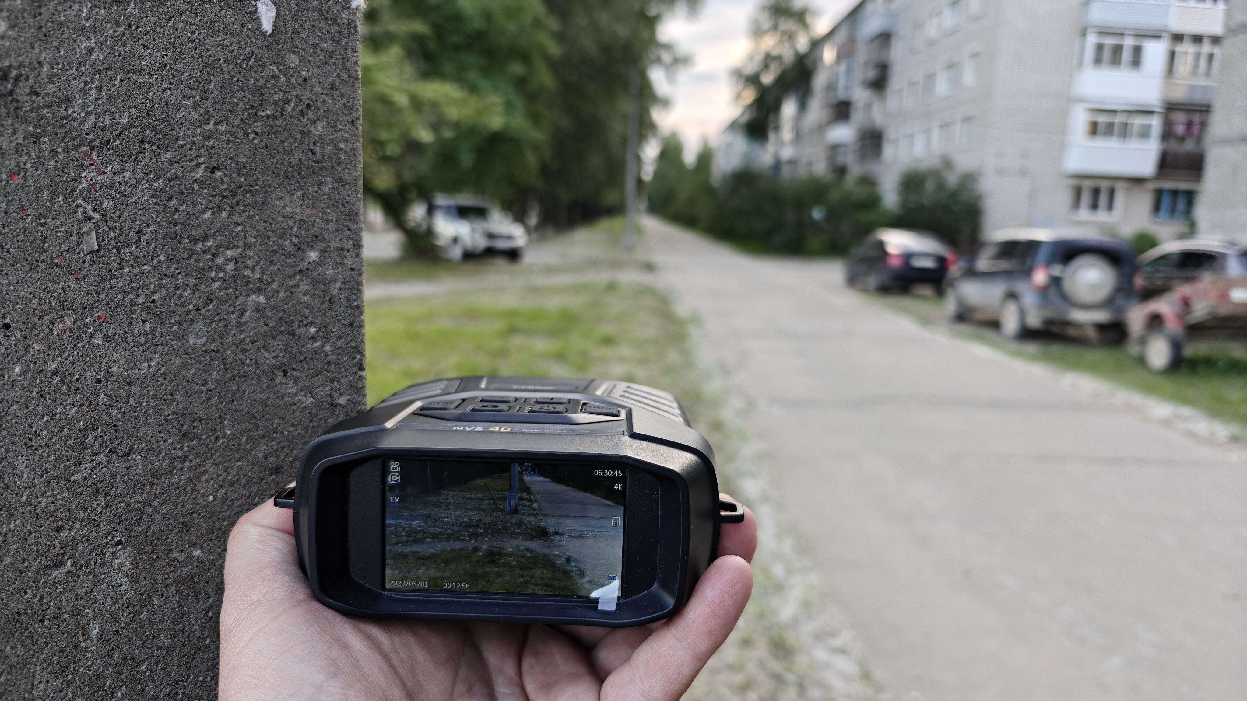 Прибор ночного видения идет сразу с линзой на приближение, к примеру на фото расстояние до человека около 45 метров, а вы видите его прям тут. Это такой оптический зум, который вы не сможете отрегулировать, к этому стоит просто привыкнуть. Близкие объекты фотографировать при этом довольно неудобно, нужно постоянно выкручивать фокус. А ночная подсветка оказывается очень даже заметна невооруженным взглядом. Еще стоит уточнить, что стабилизация довольно слаба, поэтому нужно избегать тряски. Но настоятельно рекомендую включить опцию стабилизации в настройках. Она реально выручает.