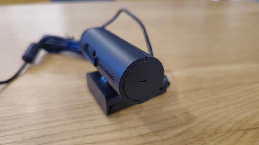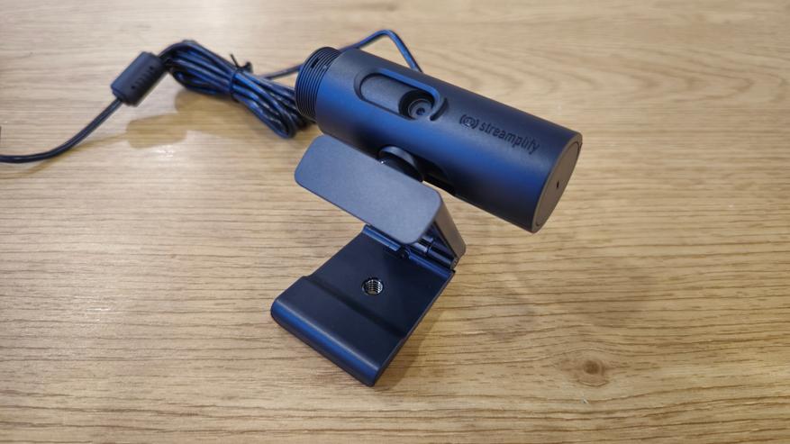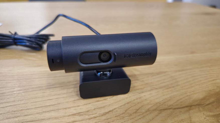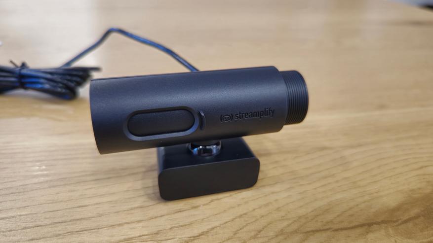 На лицевой стороне веб-камеры Streamplify CAM расположена основная линза, окруженная небольшим углублением овальной формы, которое служит для защиты линзы от повреждений и грязи. Рядом с линзой находится встроенный светодиодный индикатор, который показывает статус работы камеры. На корпусе, ближе к правому краю, расположен логотип компании Streamplify. Важно отметить, что в камере предусмотрена возможность полного закрытия объектива, что способствует обеспечению конфиденциальности, в моменты, когда в использовании камеры нет необходимости.