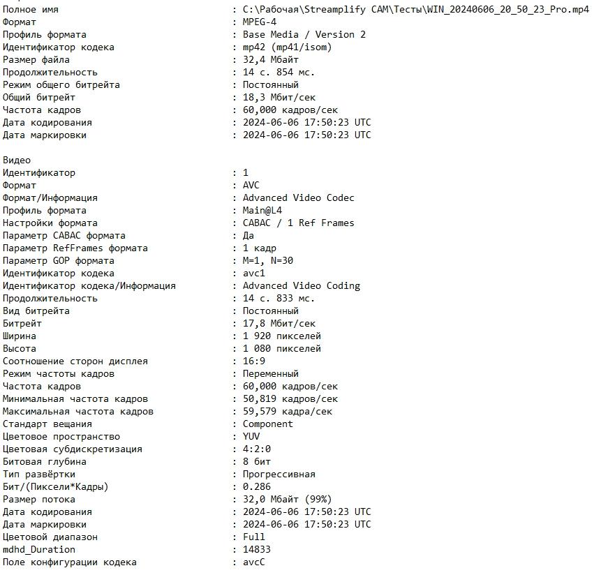Видео, снятое веб-камерой Streamplify CAM, хранится в формате MPEG-4 с профилем Base Media / Version 2. Видео закодировано с использованием кодека AVC (Advanced Video Codec) с профилем Main@L4 и настройками CABAC для улучшенного сжатия, что обеспечивает высокую эффективность кодирования и сохранение деталей изображения.