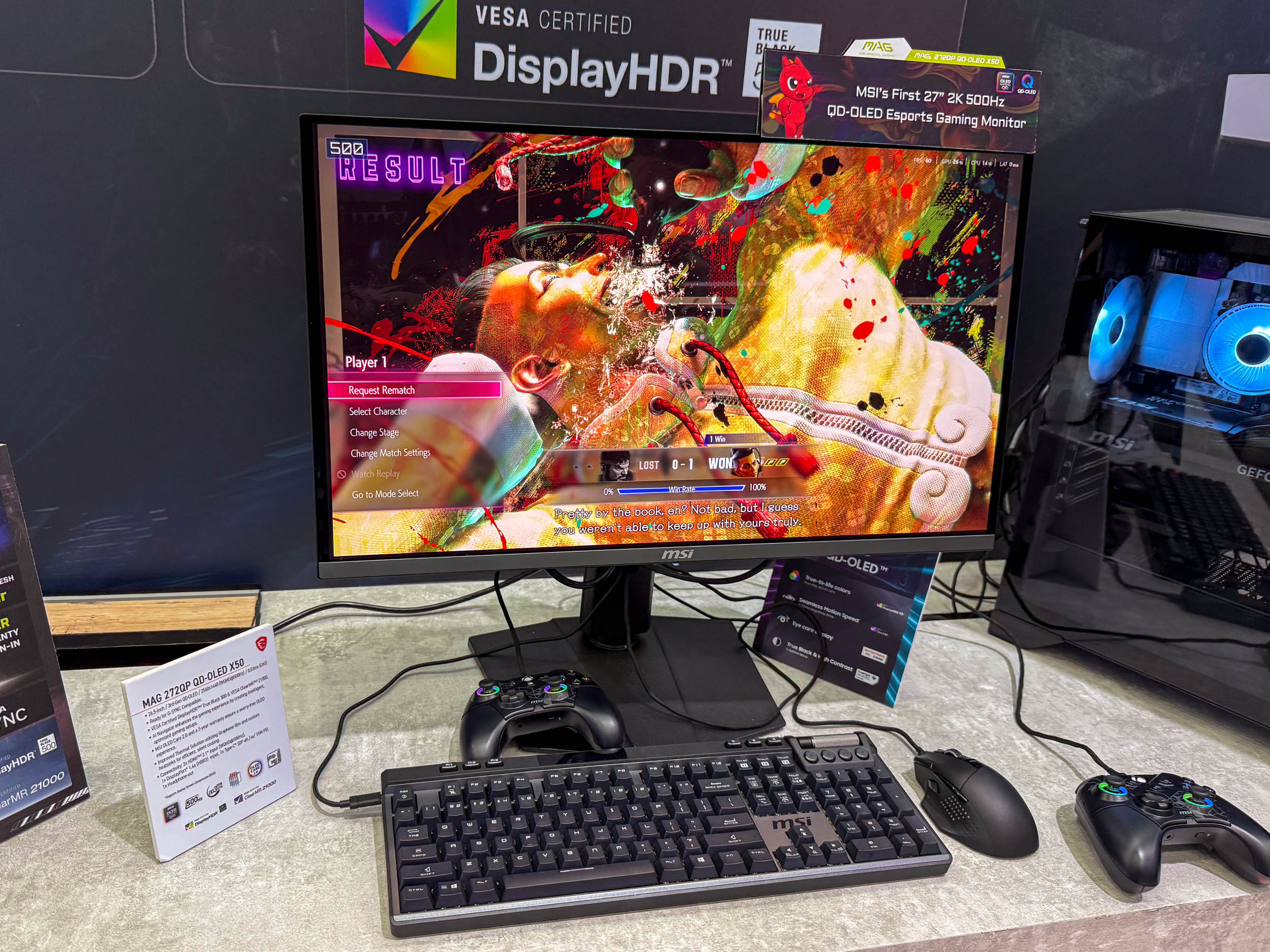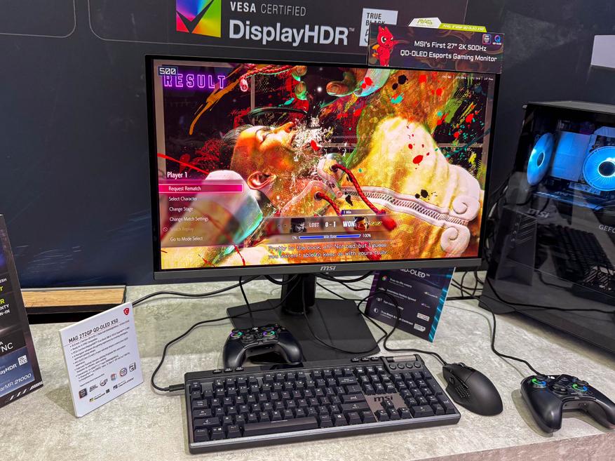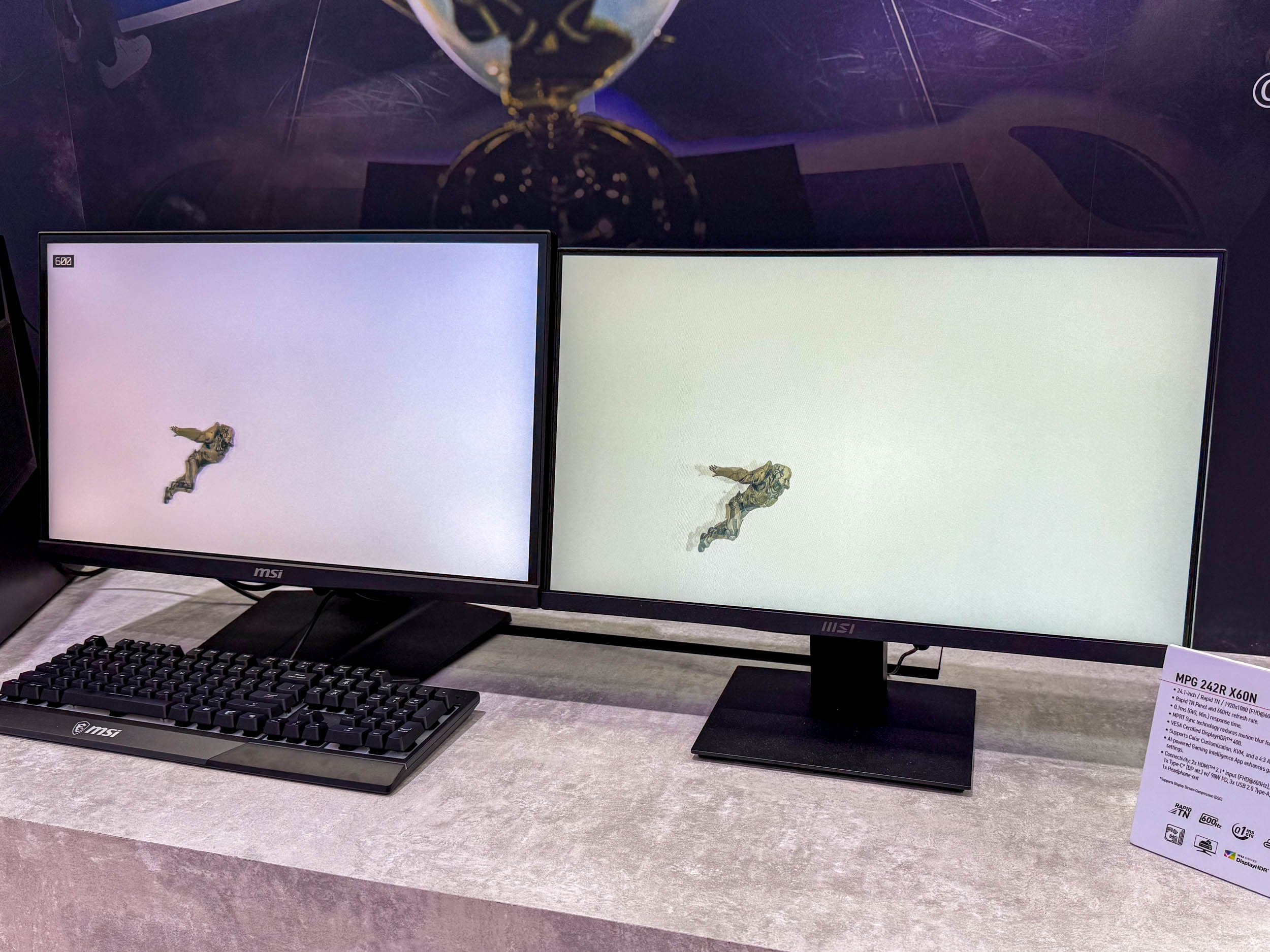 Отдельного внимания заслуживает монитор с рекордной для MSI частотой 600 Гц. На выставке неподалеку можно было найти монитор с частотой 610 Гц, разница в 10 Гц, конечно, не играет особой роли. Монитор MSI оснащён разогнанной TN-матрицей диагональю 24,1 дюйма с разрешением Full HD. Время отклика — 0,1 мс. Также есть поддержка HDR 400 и USB Type-C, способный выдавать до 98 Вт.