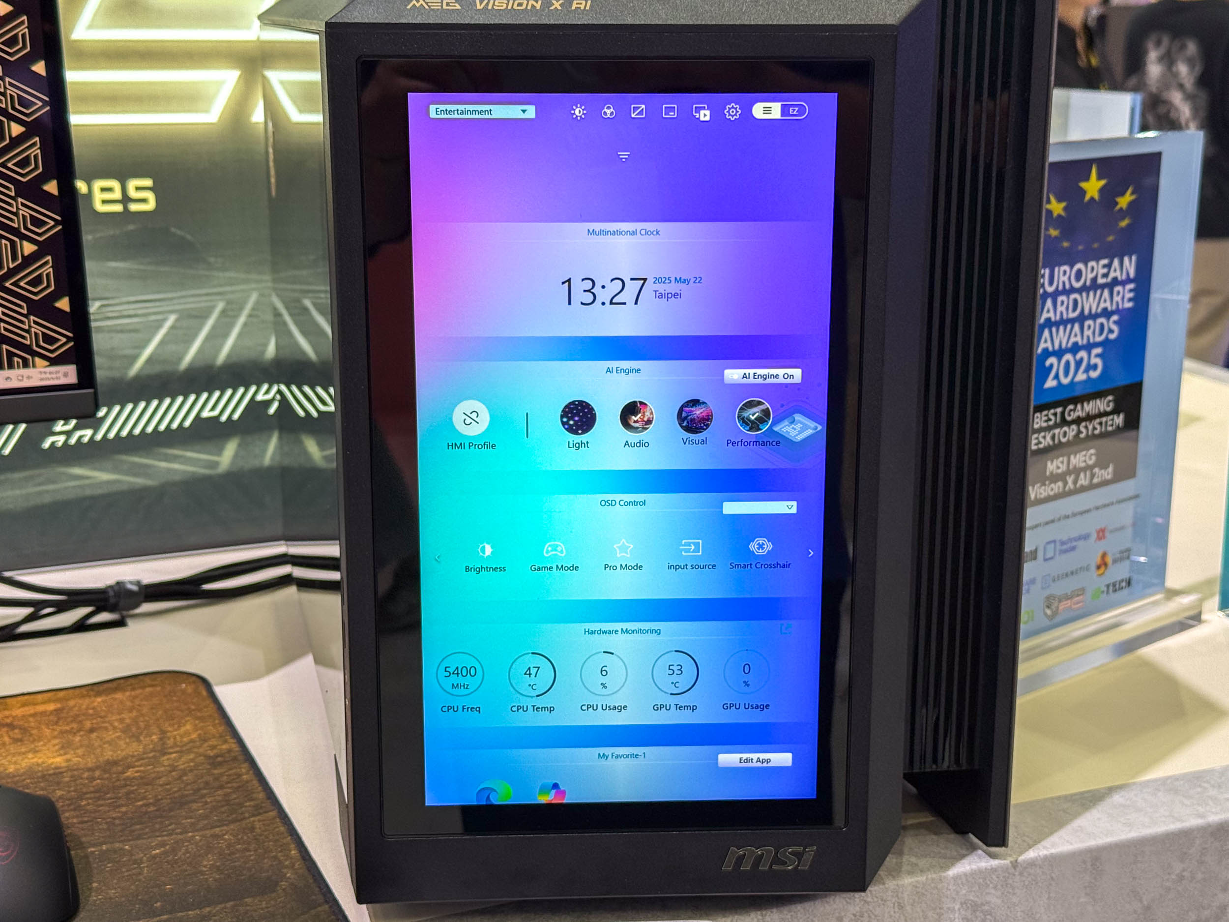 Главной звездой стенда MEG Vision X AI был в прошлом году, а в этом представили второе его поколение. Причем в названии было даже не «2», а «2nd». Как император. Но нас интересует прежде всего начинка и функциональность. Компьютер теперь оснащается топовым процессором Intel Core Ultra 9 285K и видеокартой RTX 5090. Но самая важная деталь — 12-дюймовый сенсорный дисплей на передней панели, который выступает в роли второго экрана и центра управления различными функциями системы.