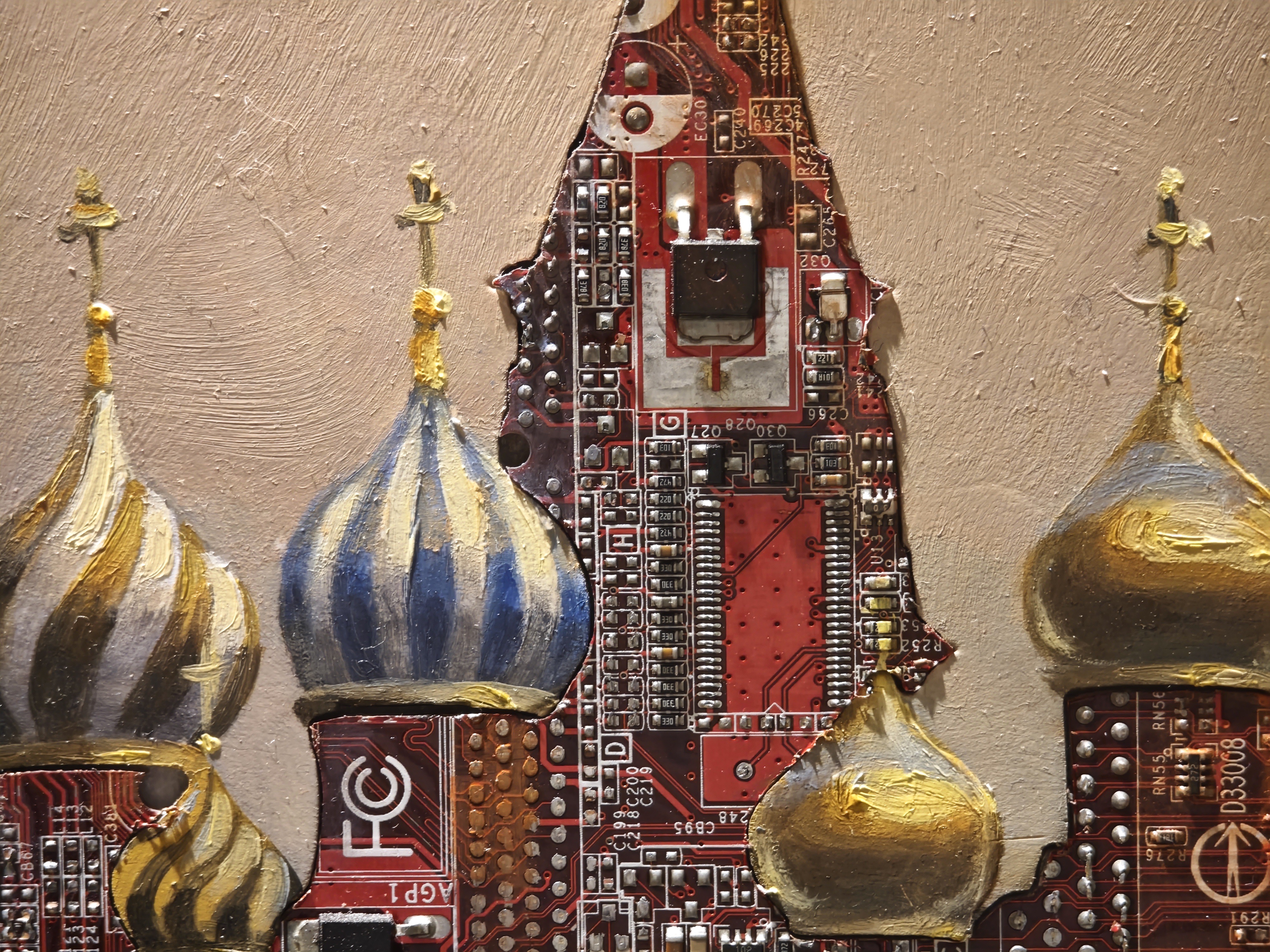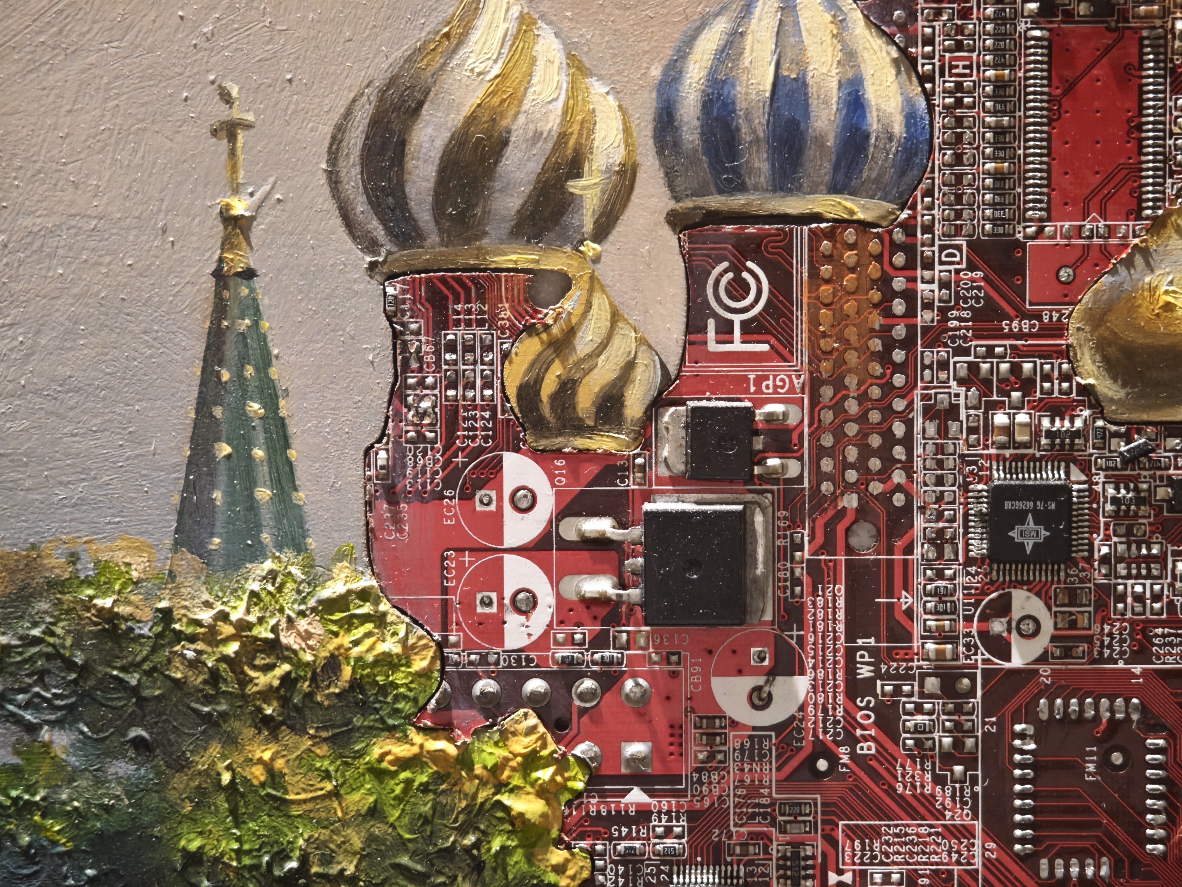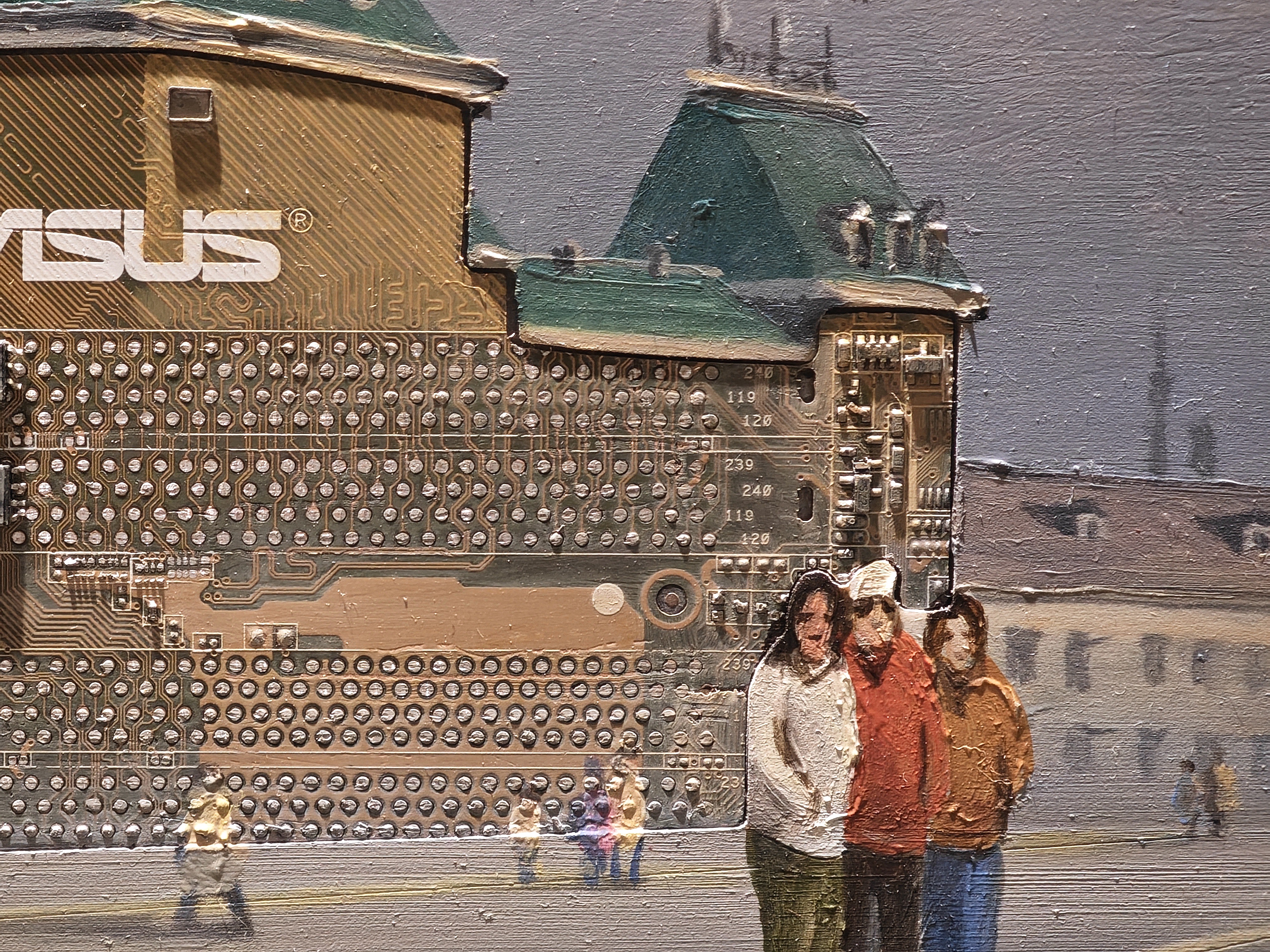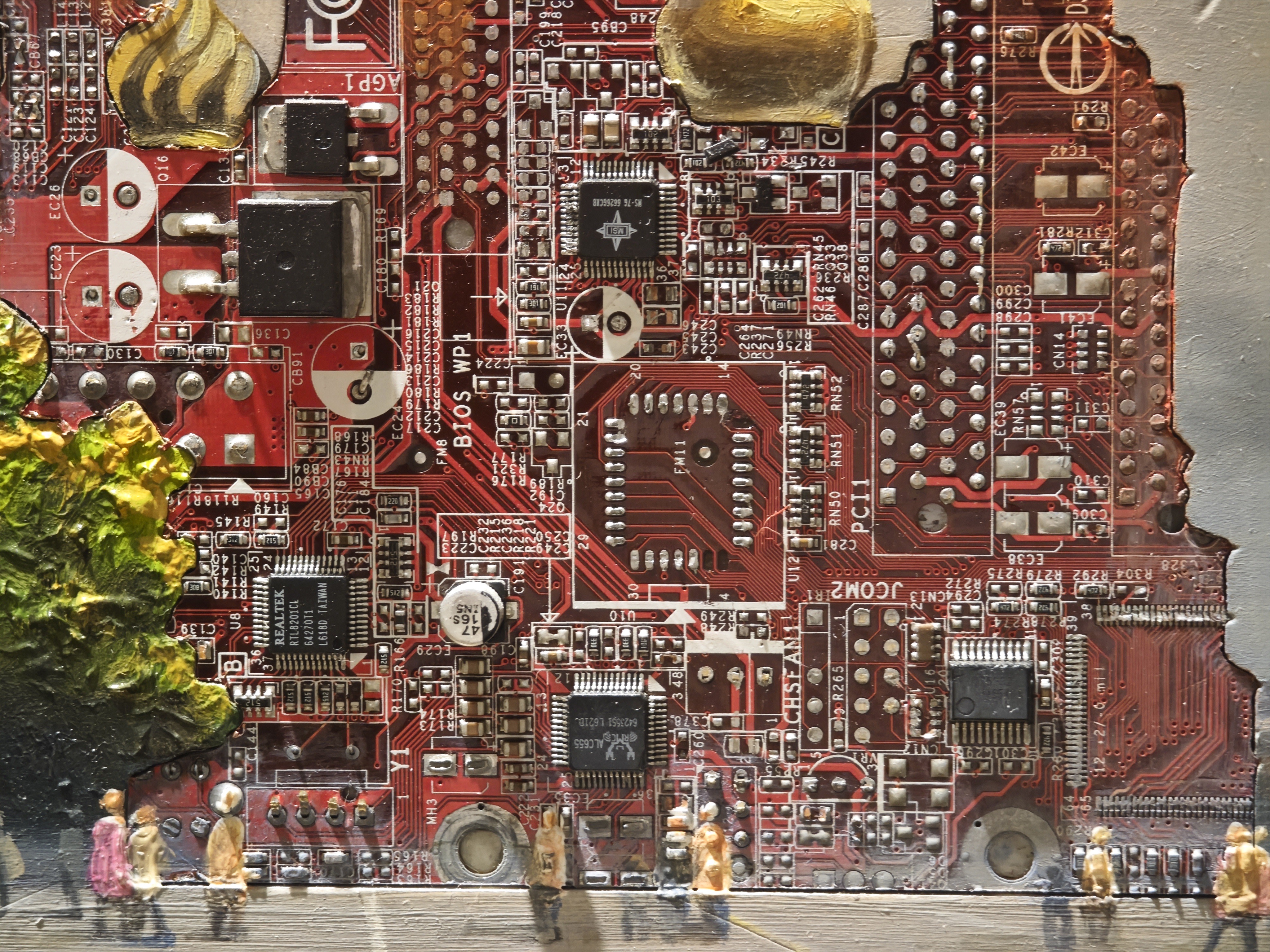 Итак, перед нами картина, частично собранная из микросхем. Причем, это именно «живопись», а не коллаж или аппликация. Здесь есть выверенная композиция, хороший рисунок, а части, из которых выполнены здания, подобраны весьма точно.