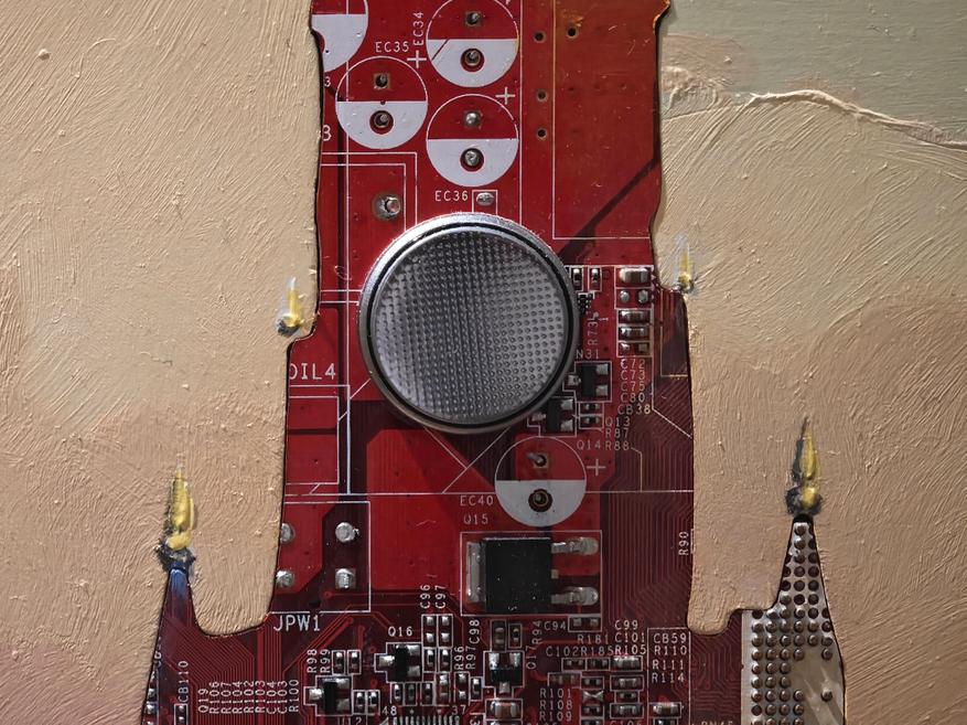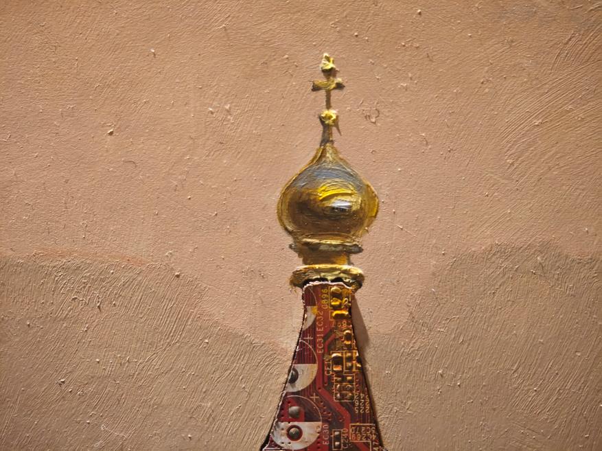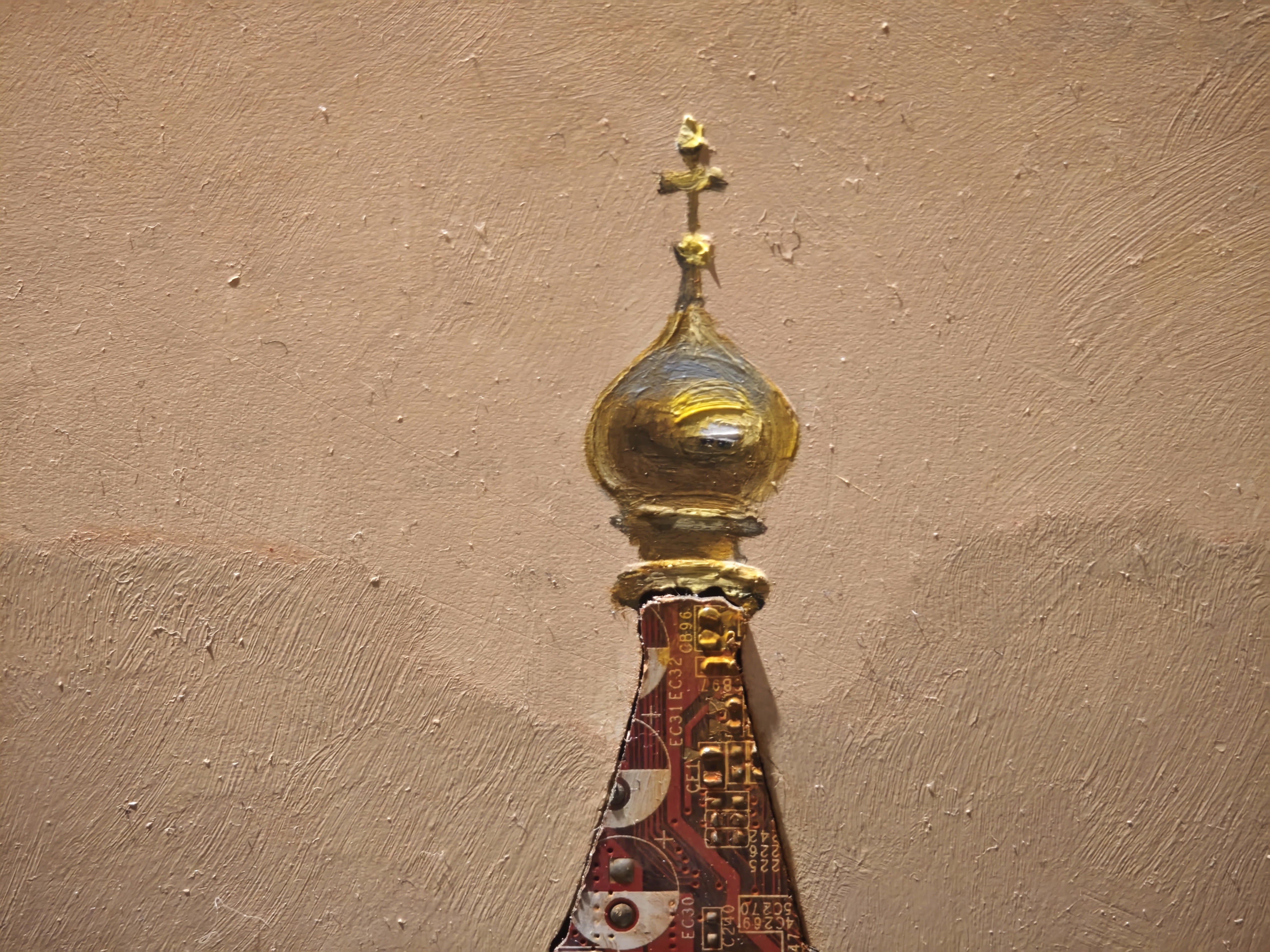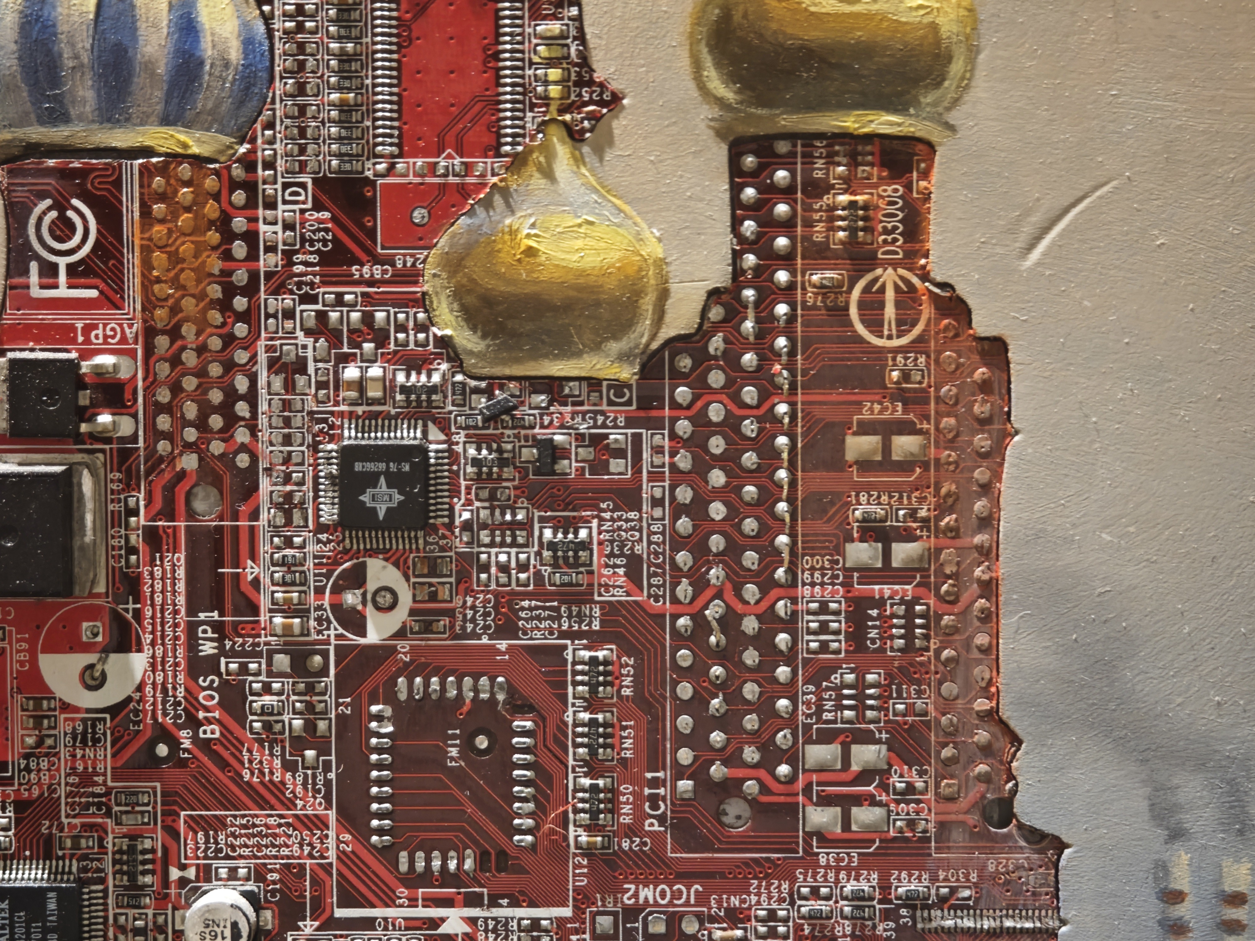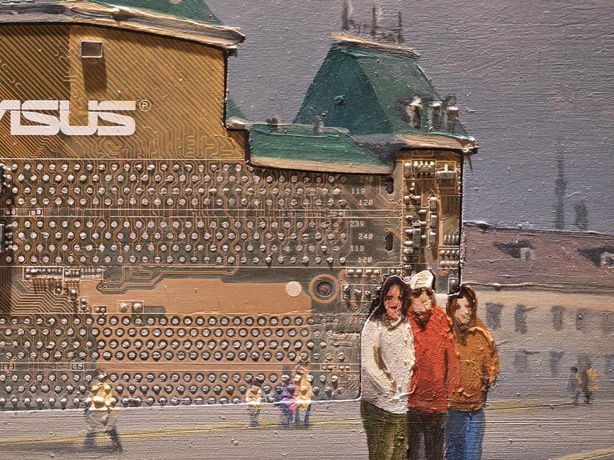 Итак, перед нами картина, частично собранная из микросхем. Причем, это именно «живопись», а не коллаж или аппликация. Здесь есть выверенная композиция, хороший рисунок, а части, из которых выполнены здания, подобраны весьма точно.