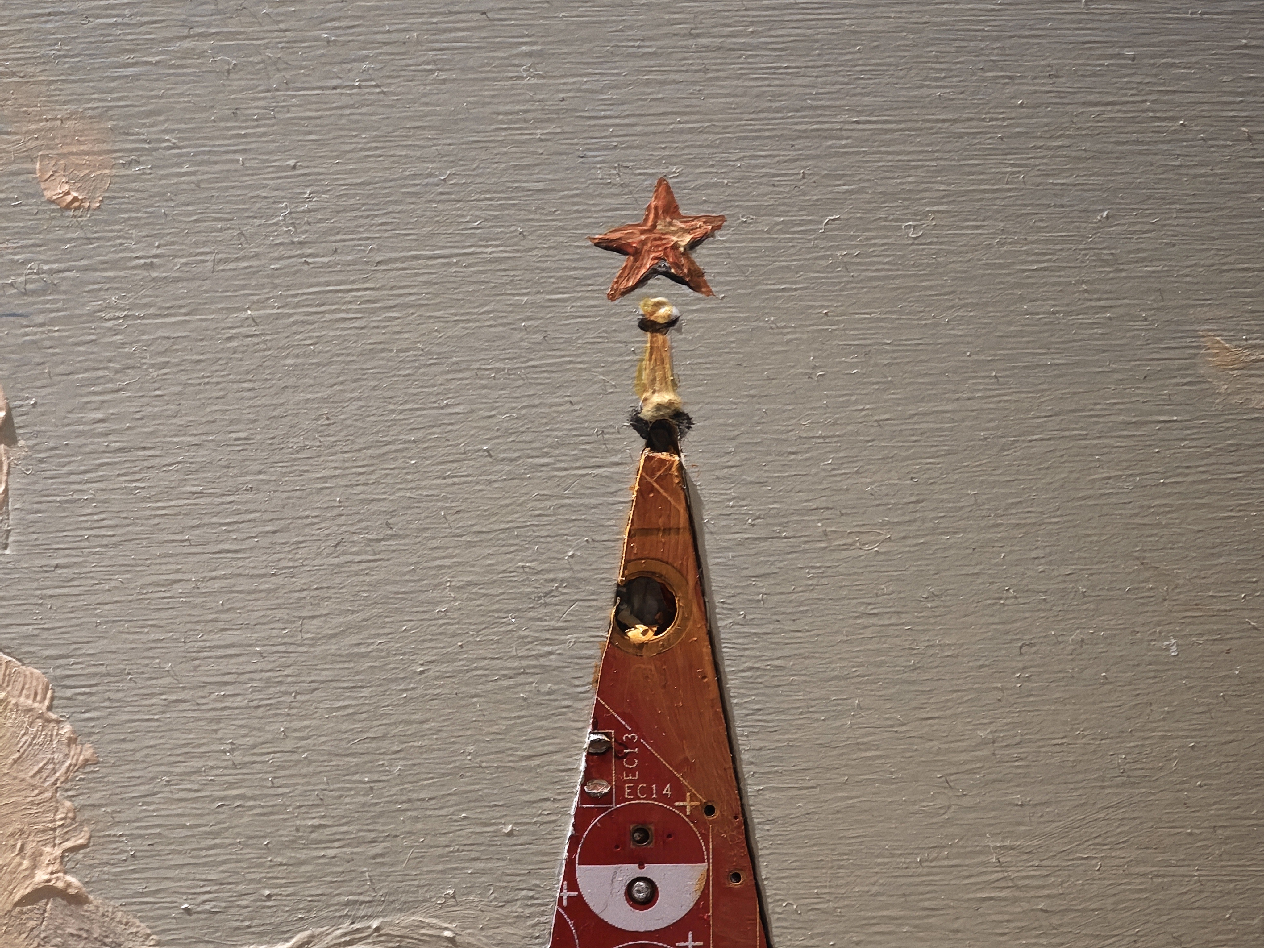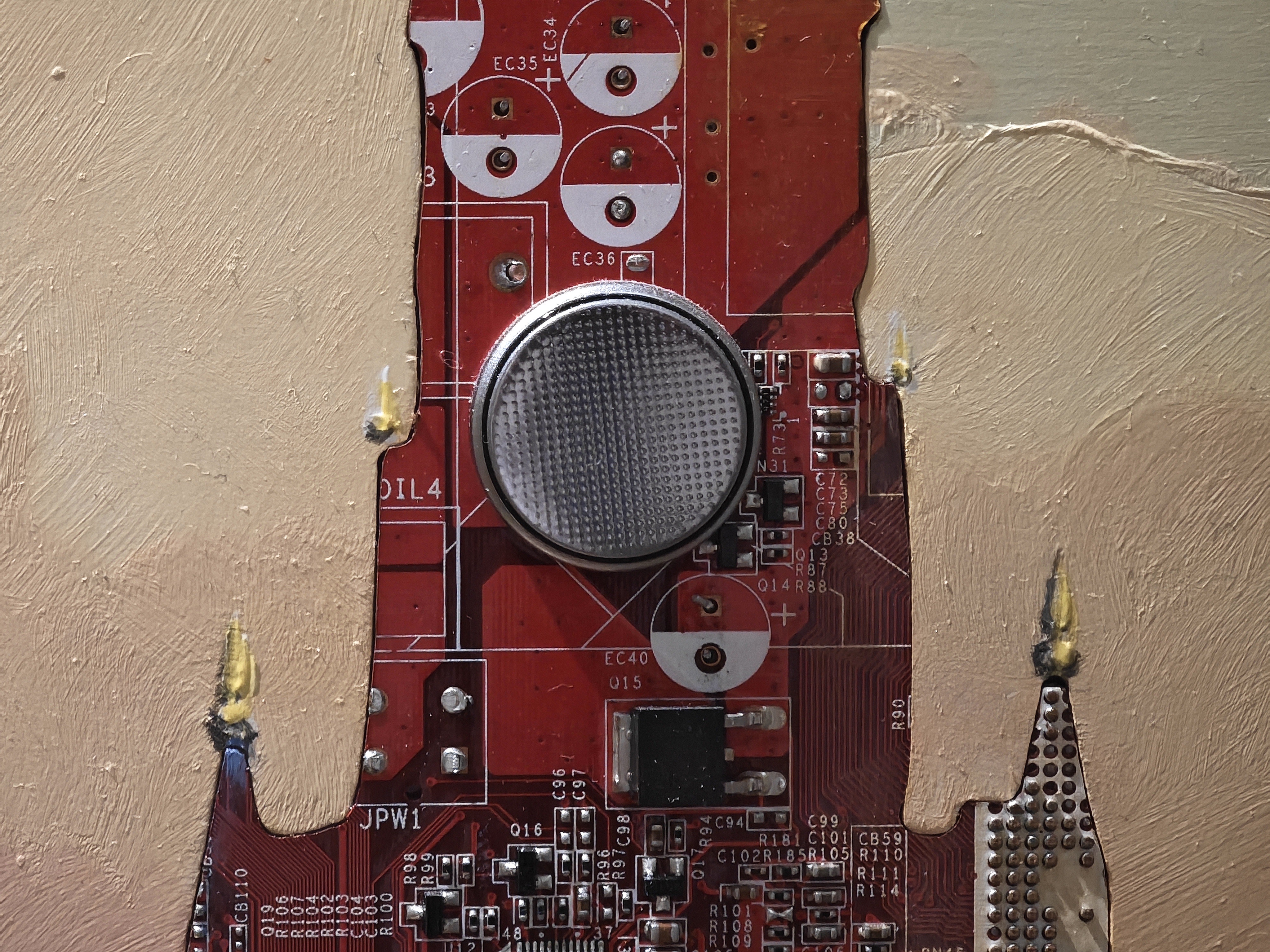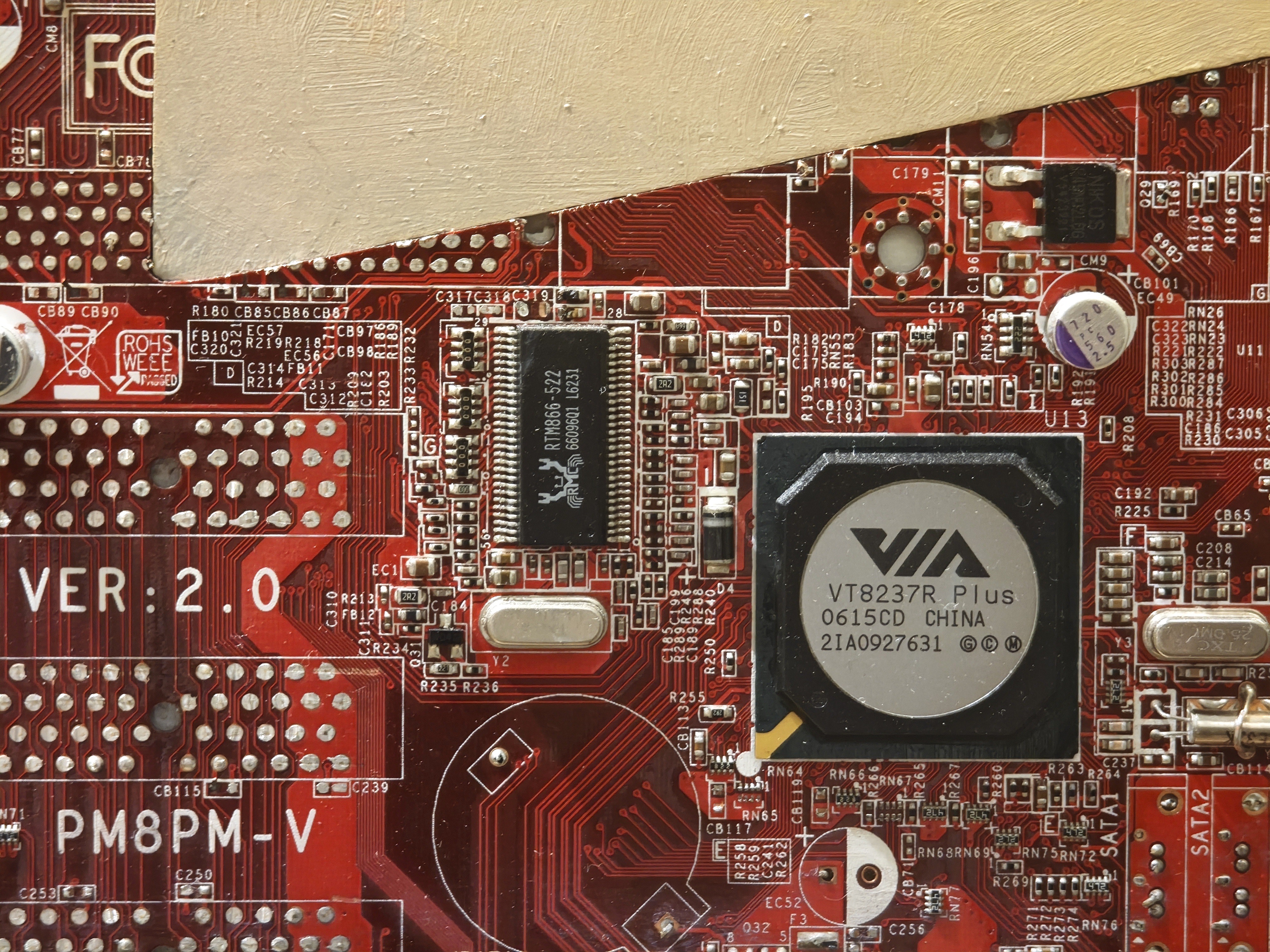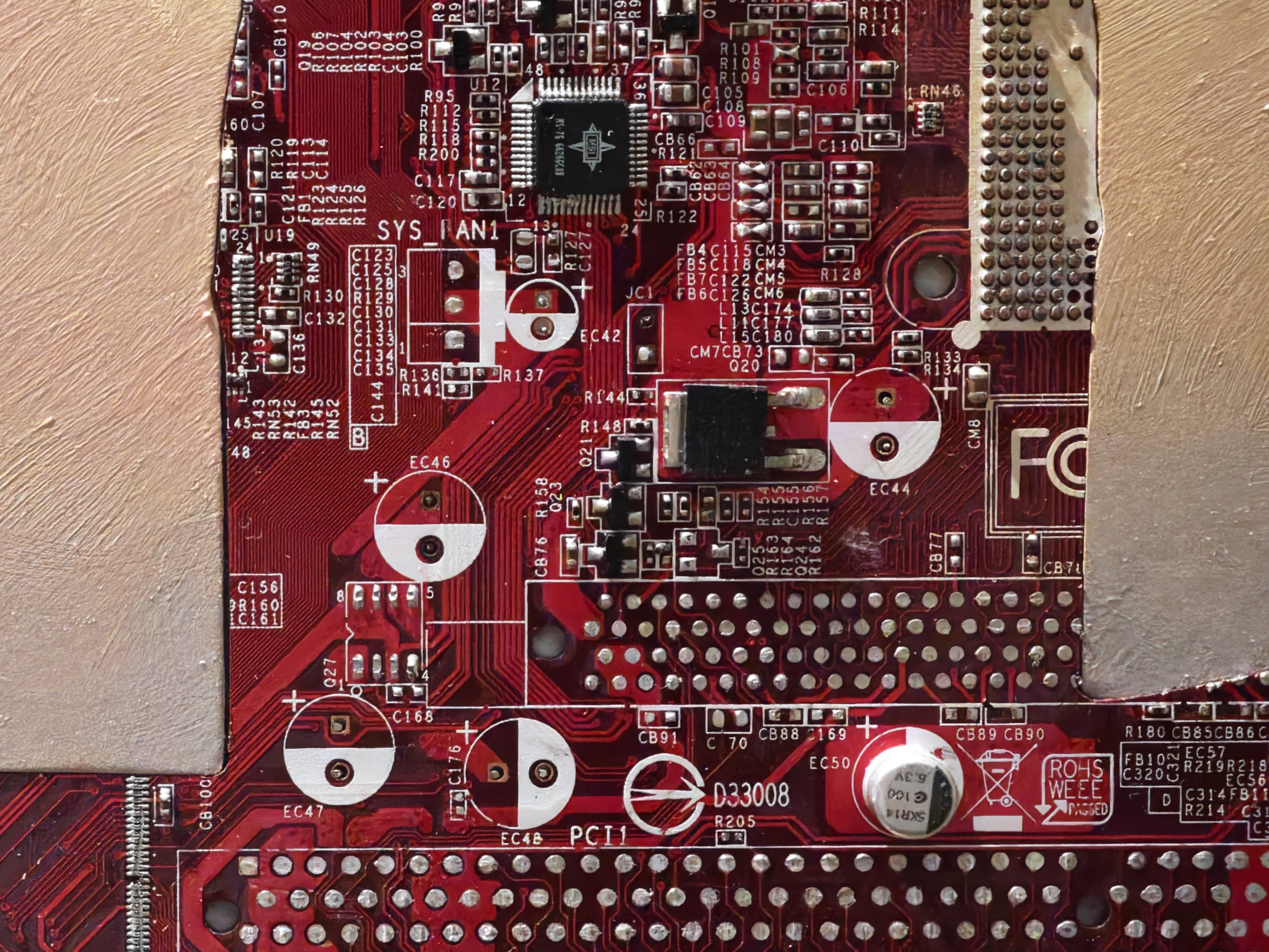Итак, перед нами картина, частично собранная из микросхем. Причем, это именно «живопись», а не коллаж или аппликация. Здесь есть выверенная композиция, хороший рисунок, а части, из которых выполнены здания, подобраны весьма точно.