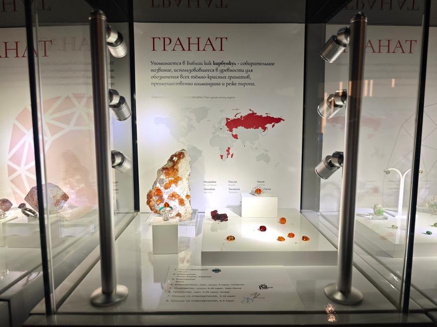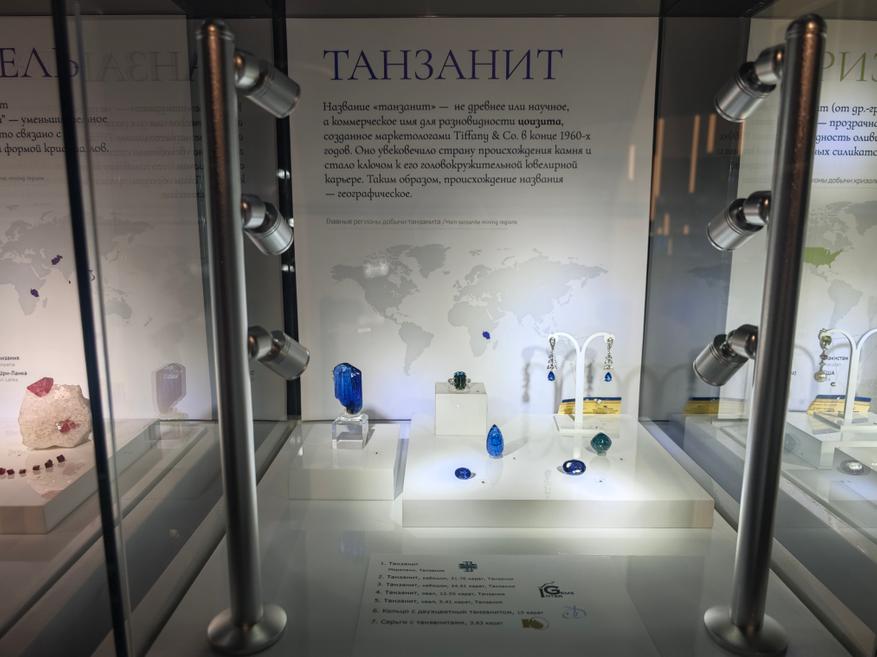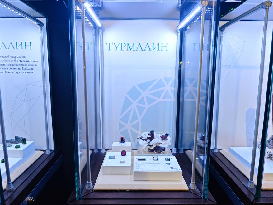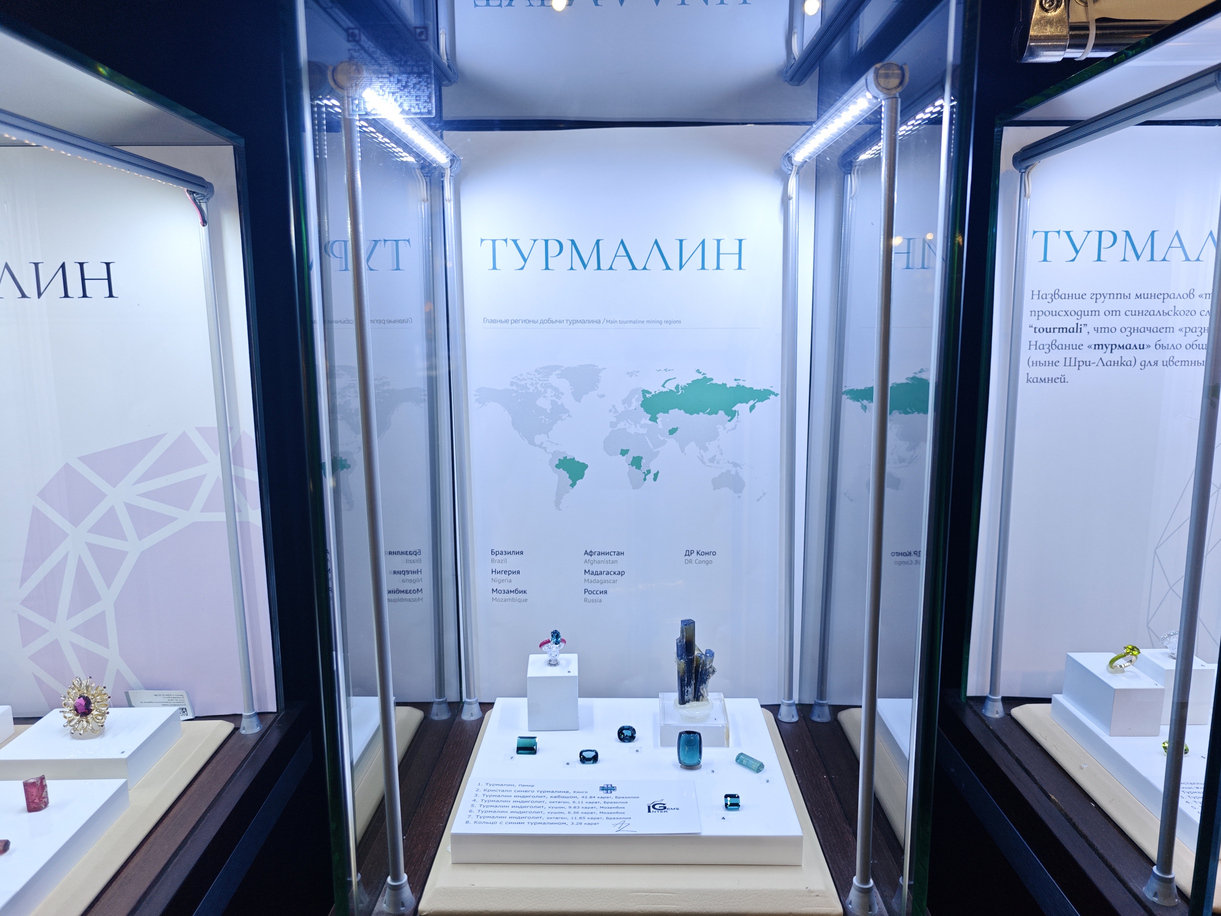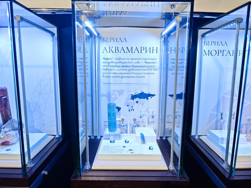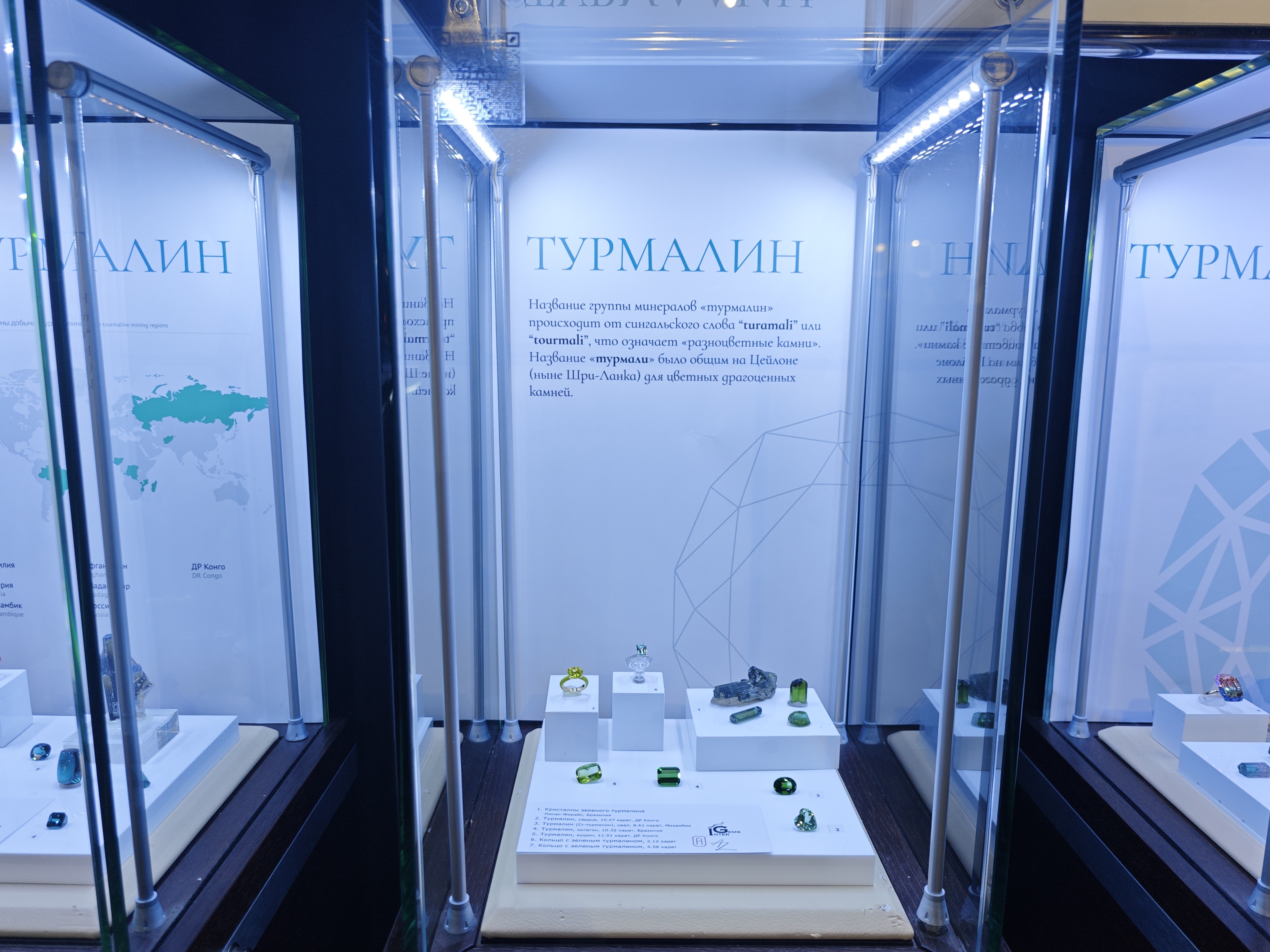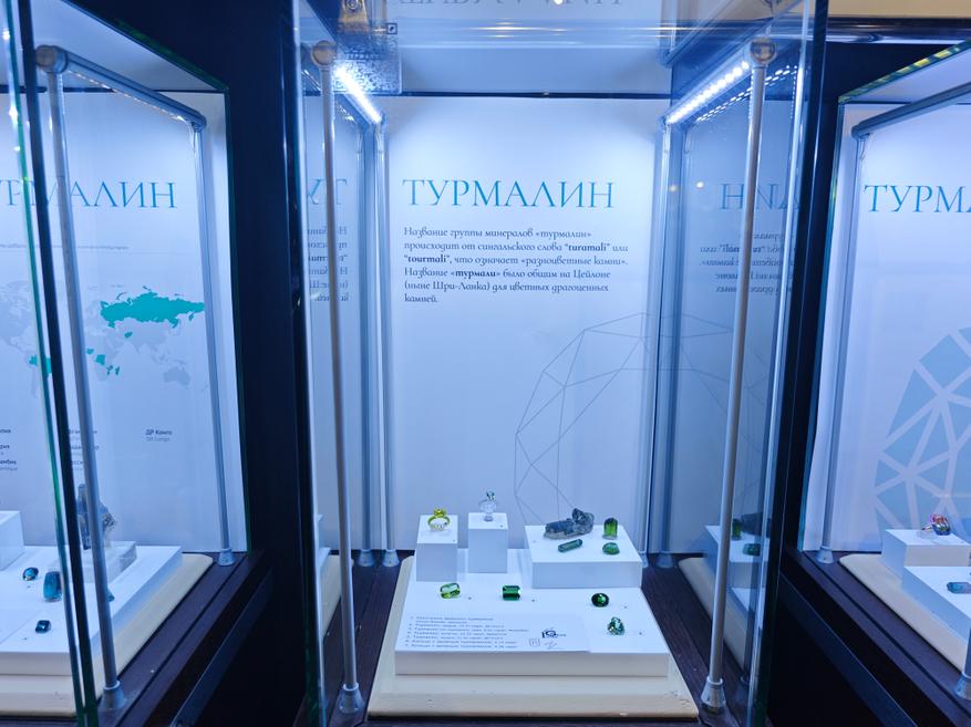 Вертикальные витрины здесь включают краткое описание камня, небольшие сведения о его добыче и малой родине.