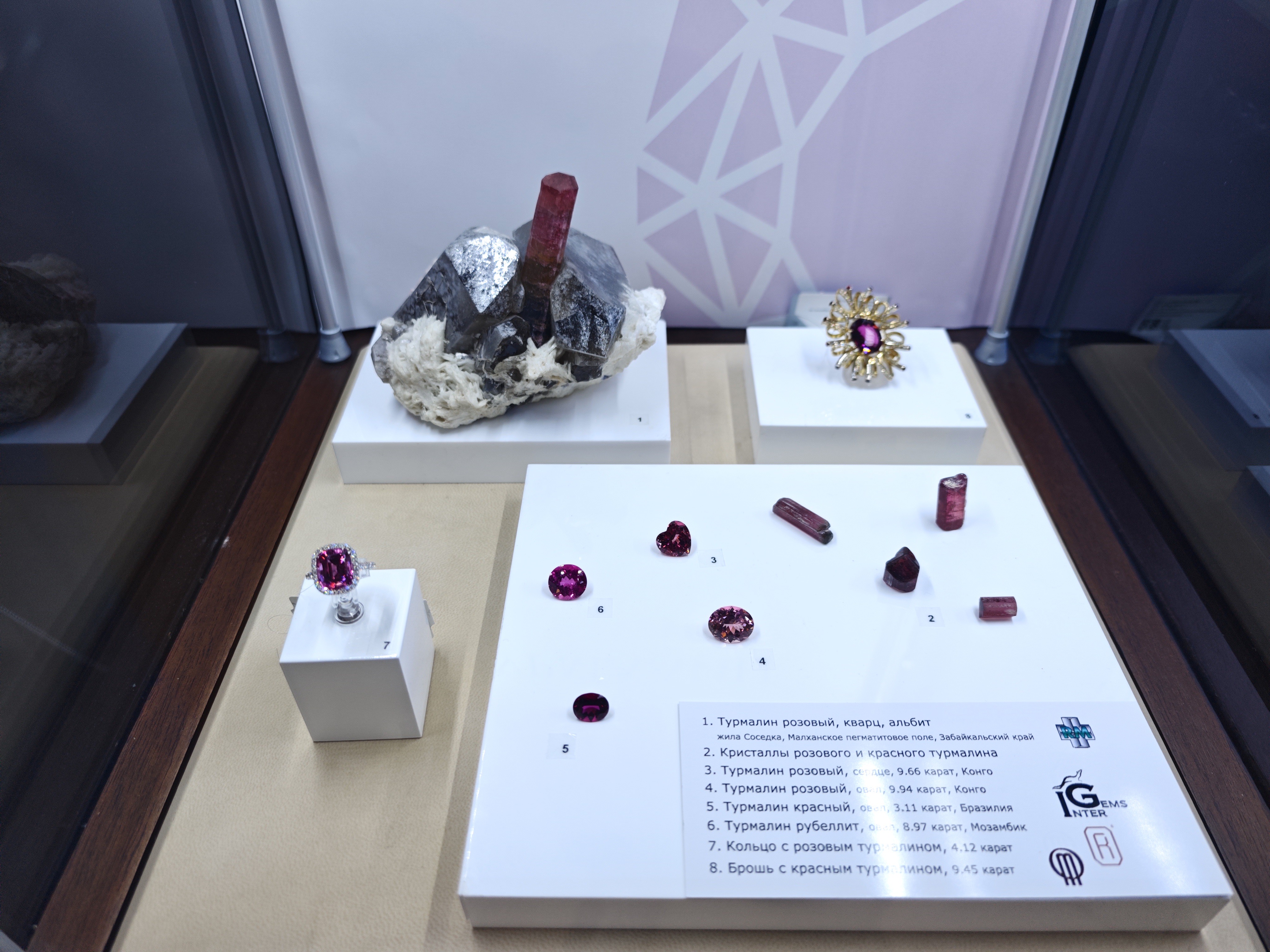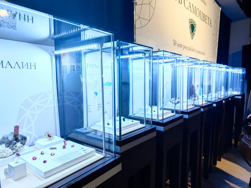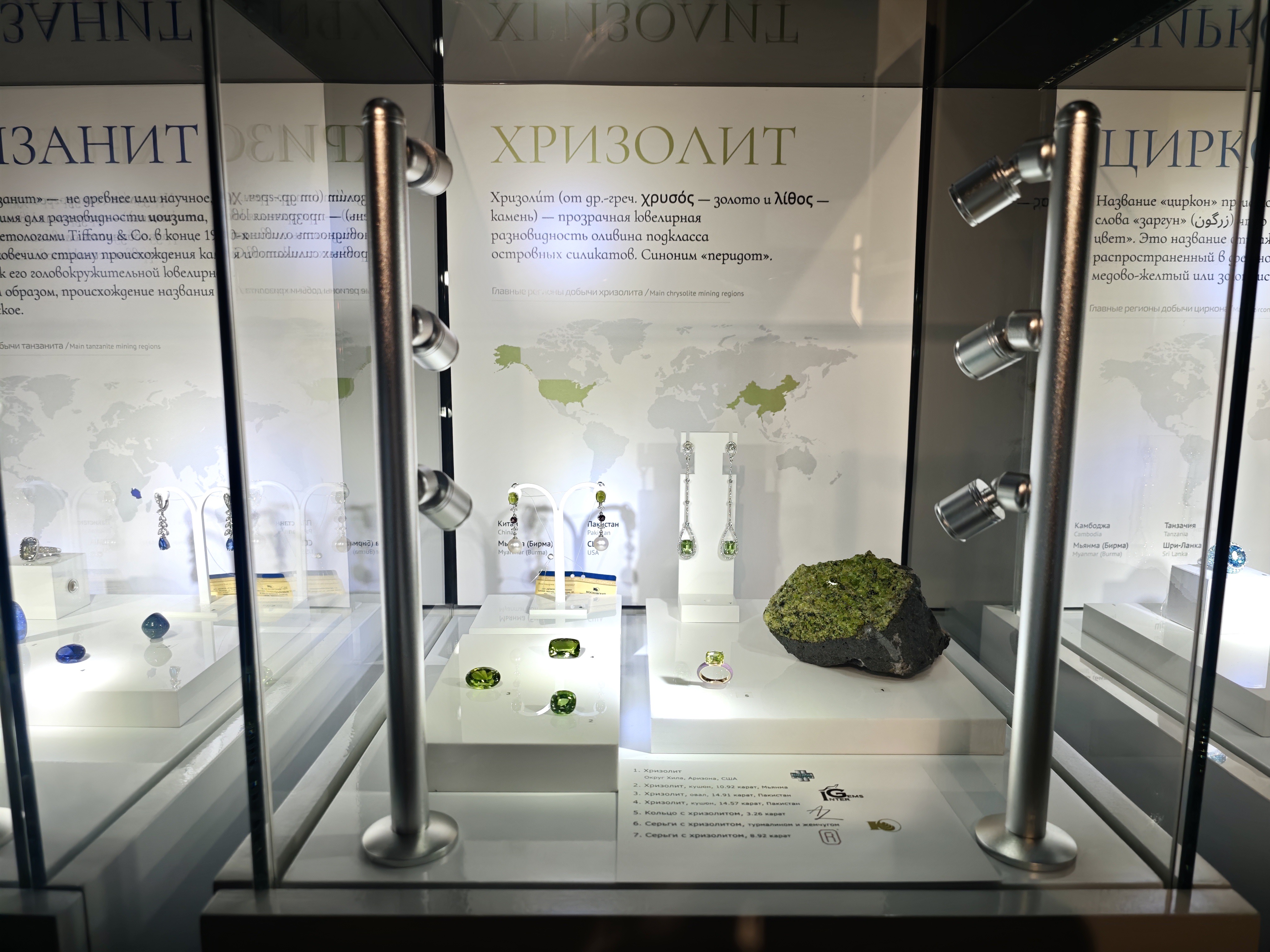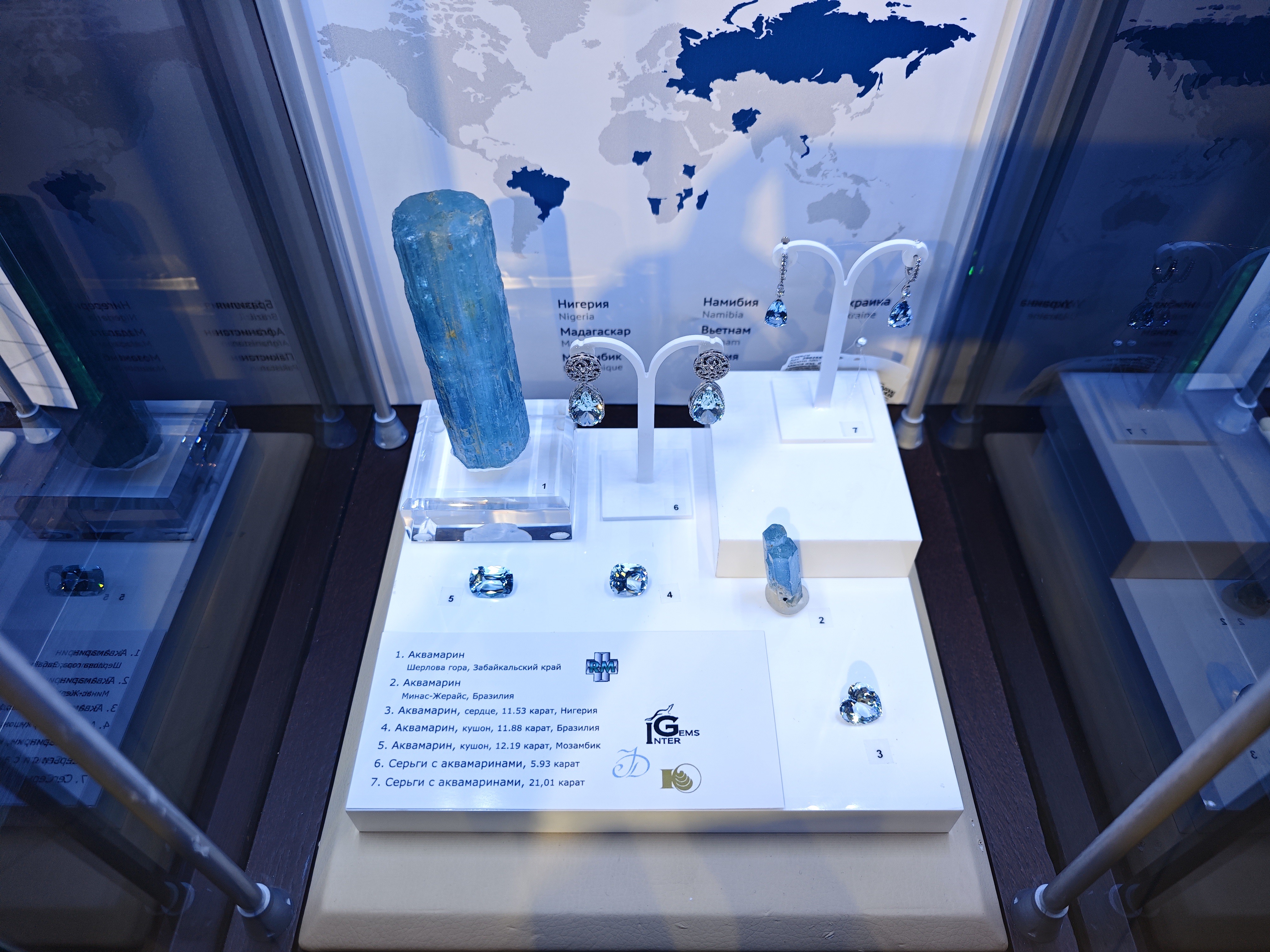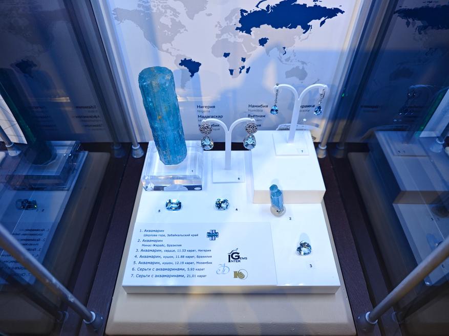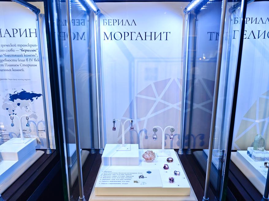 Вертикальные витрины здесь включают краткое описание камня, небольшие сведения о его добыче и малой родине.