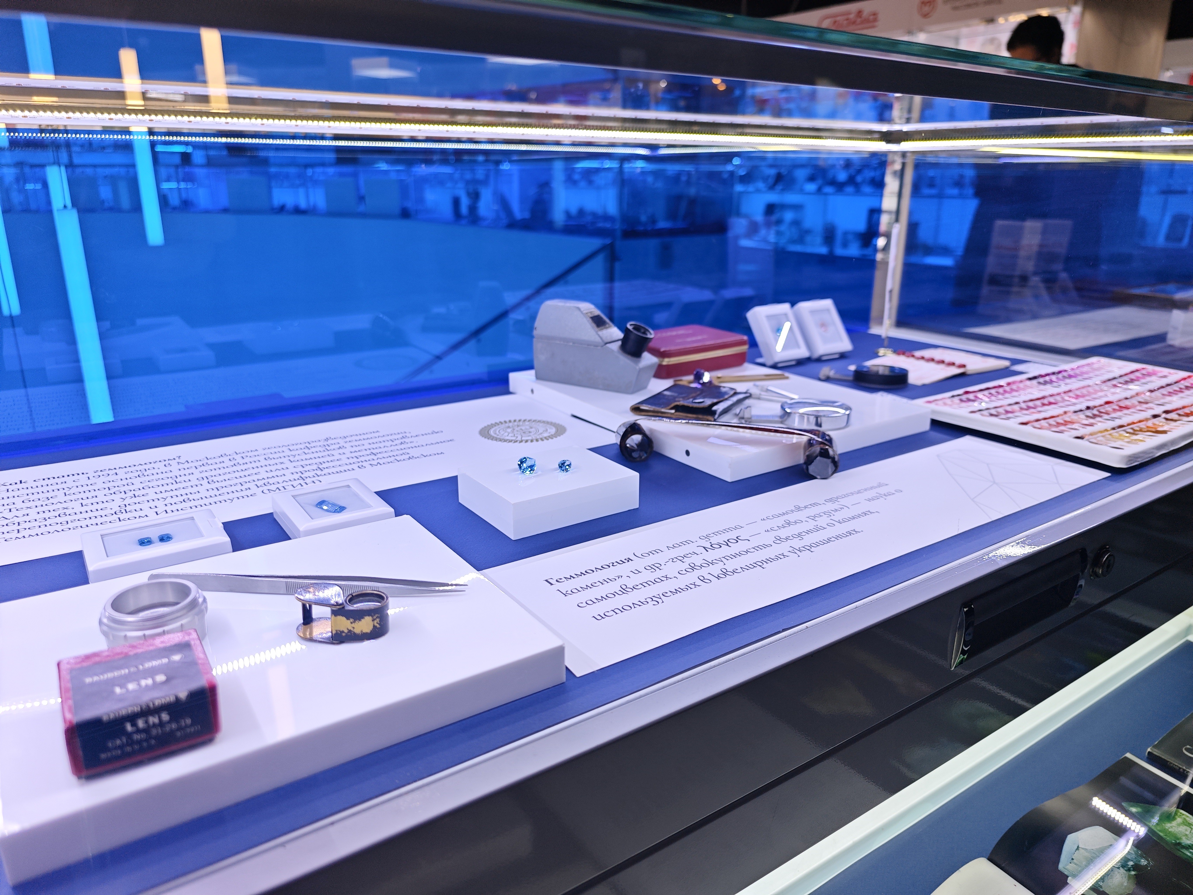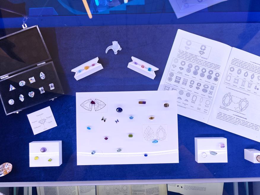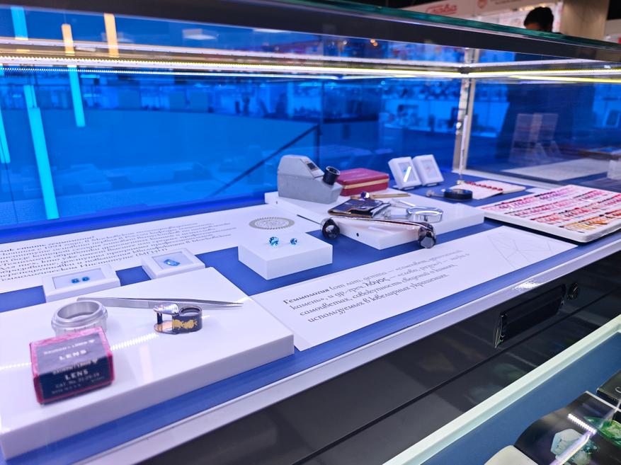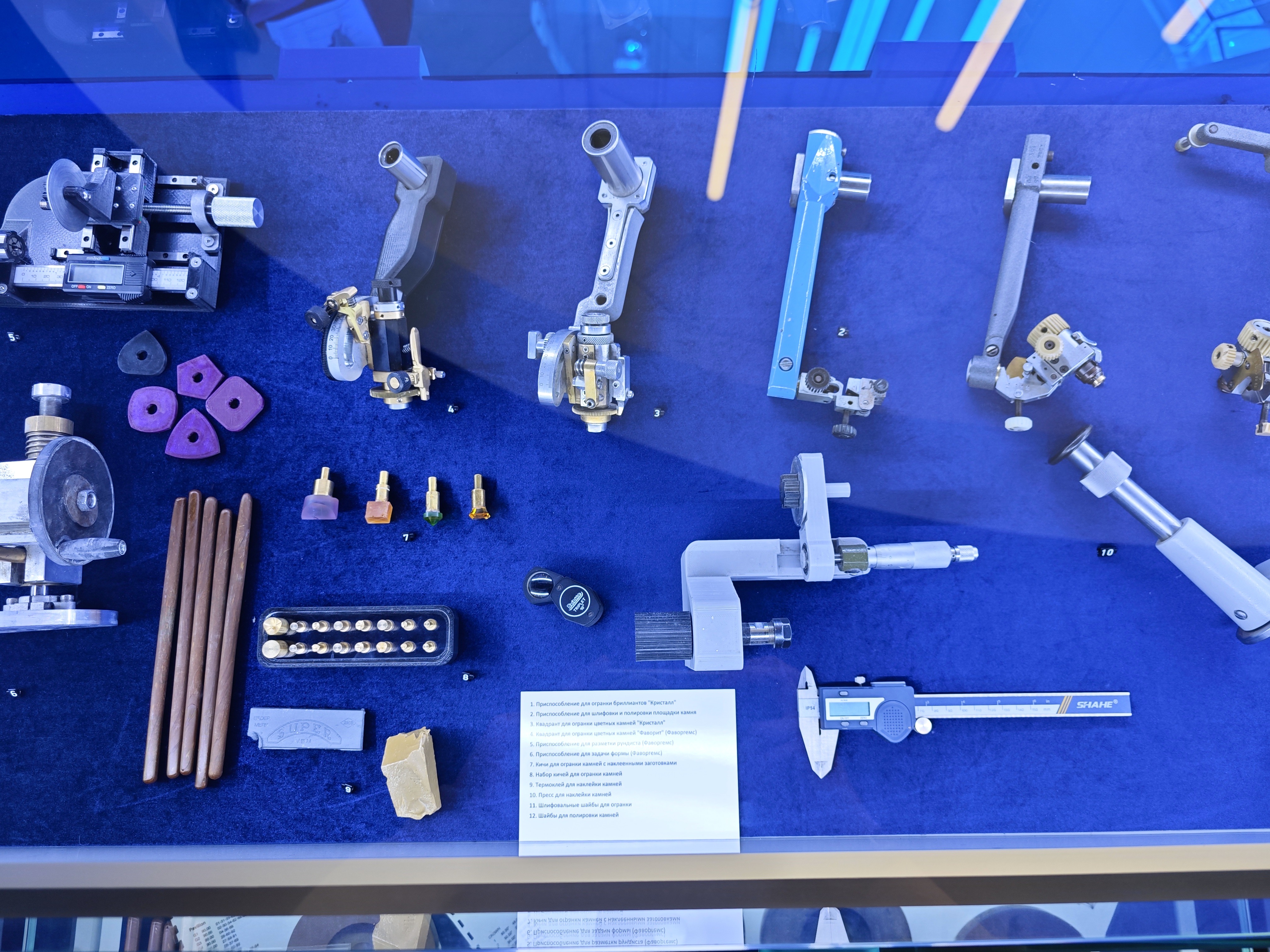 Витрины довольно быстро начинают сиять, но все же первая грань этой выставки методическая. Здесь демонстрируется инструмент, предложены материалы с перечислением и примерами типов огранки, показаны базовые примеры экспертных геммологических заключений.