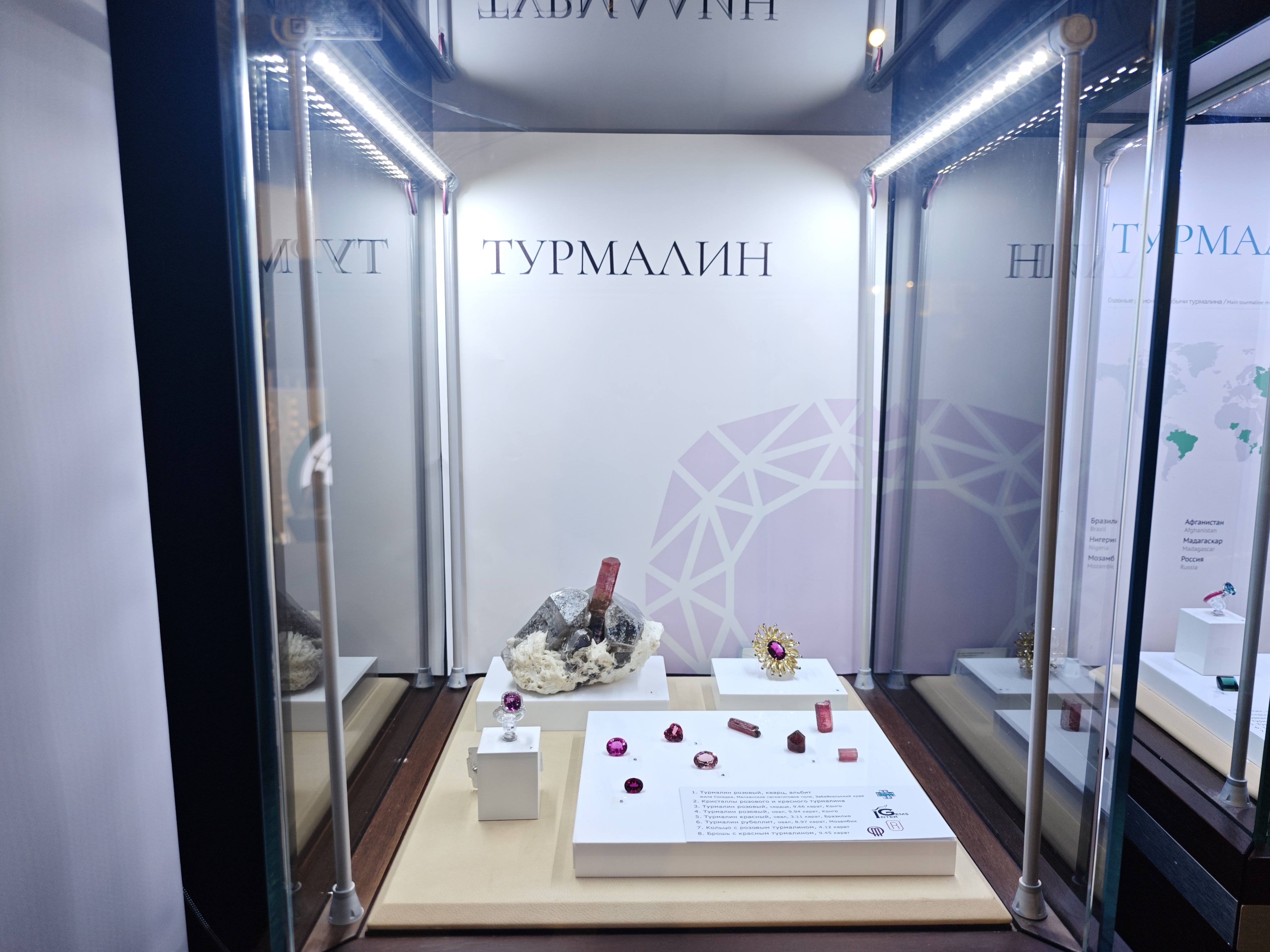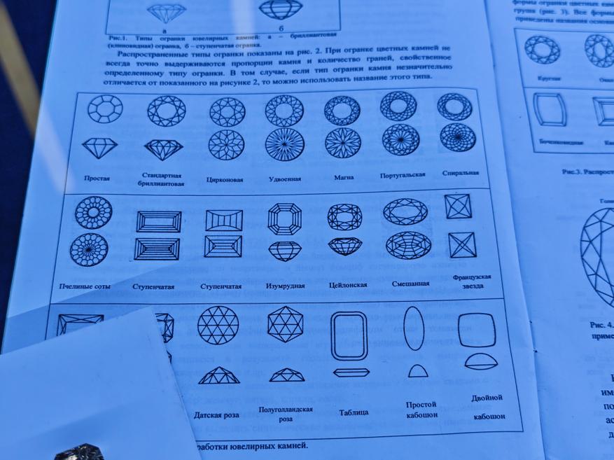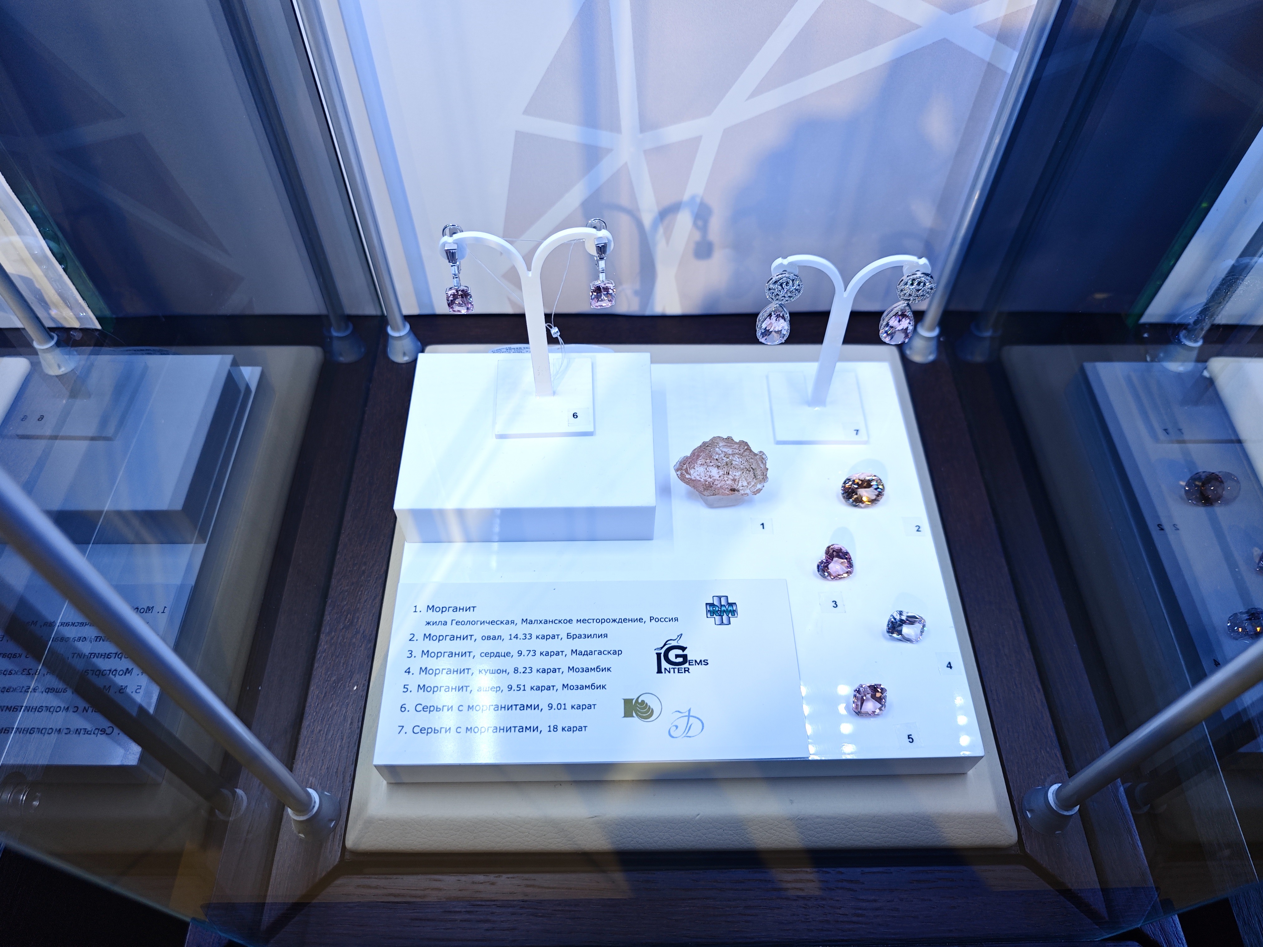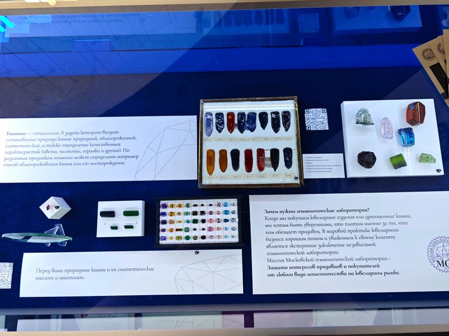 Витрины довольно быстро начинают сиять, но все же первая грань этой выставки методическая. Здесь демонстрируется инструмент, предложены материалы с перечислением и примерами типов огранки, показаны базовые примеры экспертных геммологических заключений.
