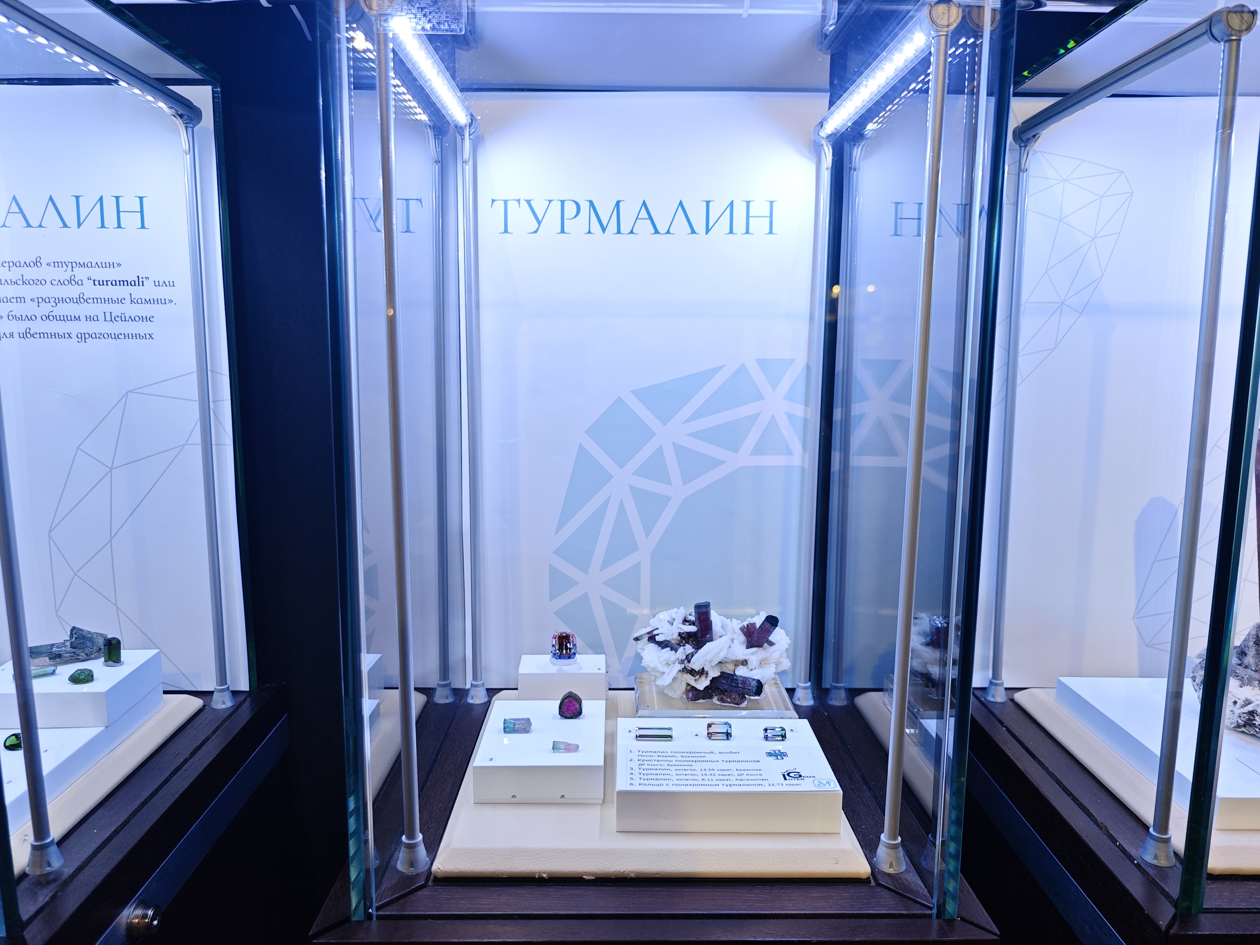 Экспозиция придерживается правила «Один минерал — одна витрина», однако некоторые наименования повторяются в виду их разнообразия. Так, например, количественным лидером явно оказался Турмалин: