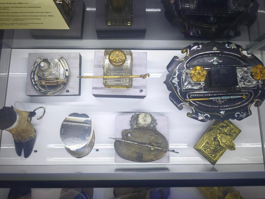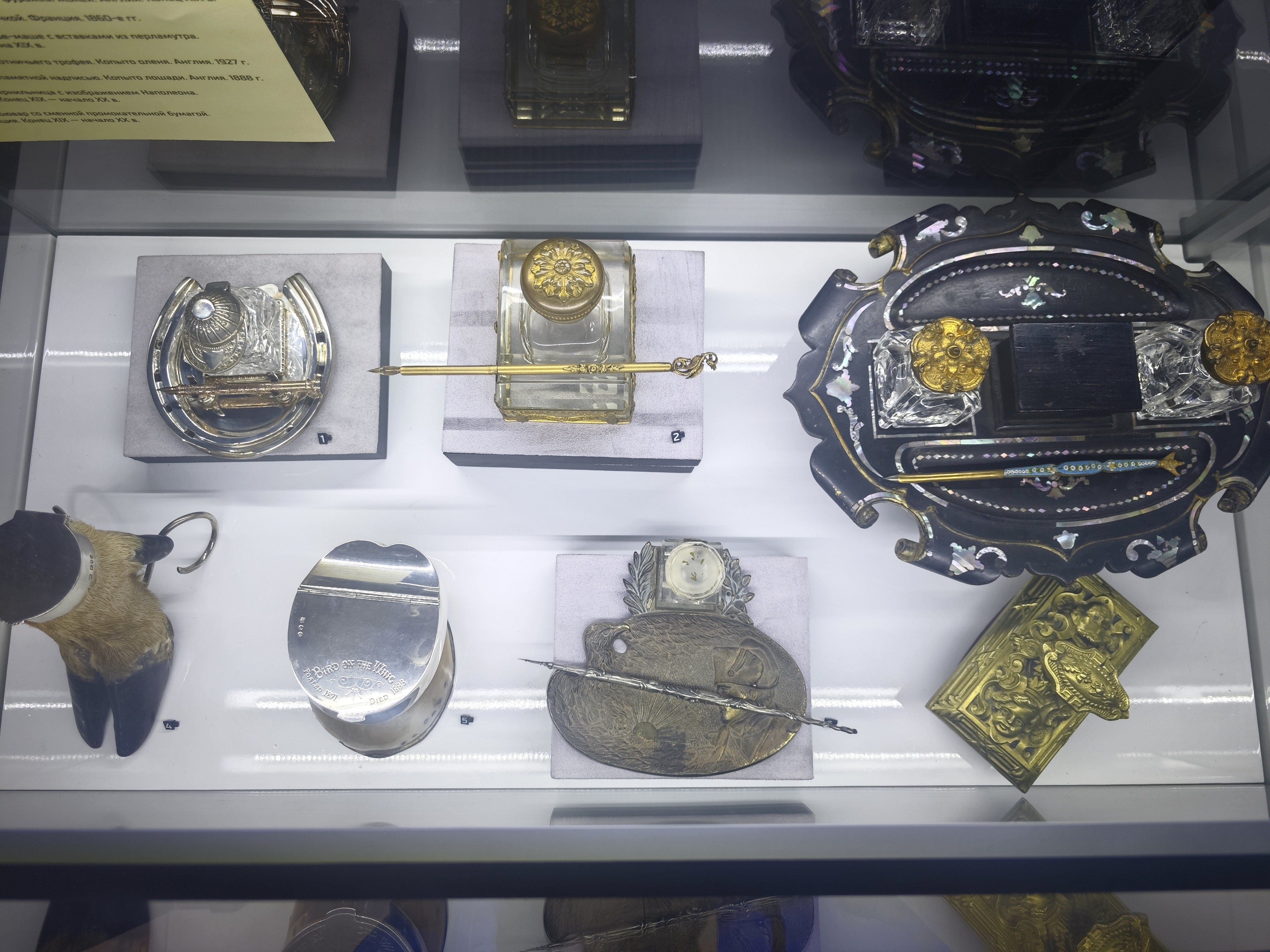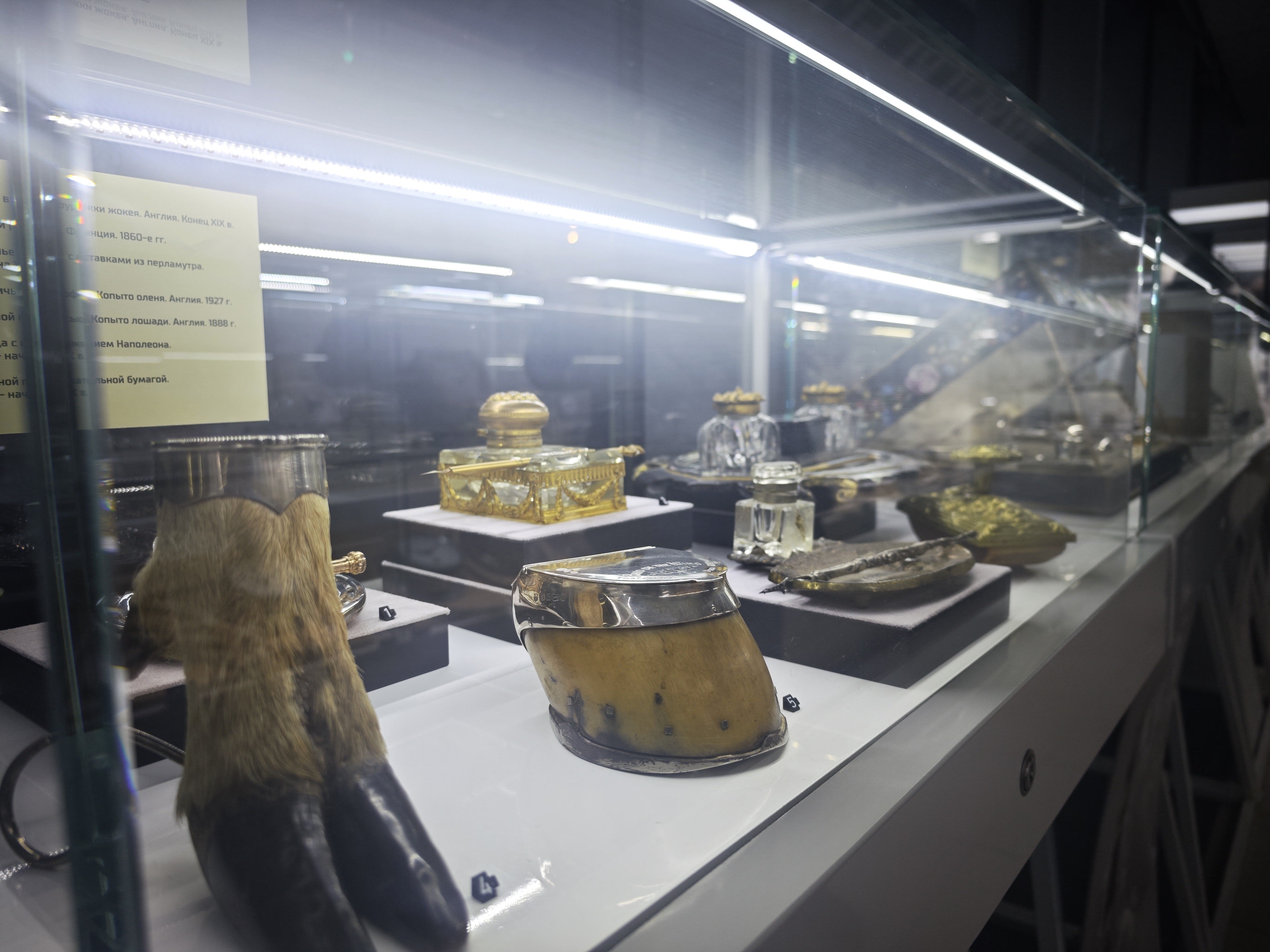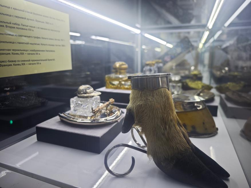 Экспонаты действительно мало похожи на утилитарные девайсы, а скорее являются предметами декоративно-прикладного искусства, которые отражают вкусы владельцев, вкусы эпох, ну и те или иные «обычаи». Так, например, заметив чернильницы из копыт животных, можно узнать, что подобные вещи — их называют трофейные — могли служить и как частная характеристика владельца в качестве хорошего охотника.