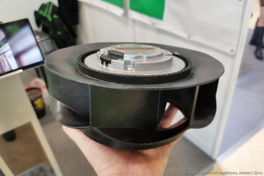 Ещё один лабиринтный шумоглушитель обнаружился на самом необычном стенде выставки: маленький стенд компании MC-SYSTEM из Ногинска явно делали сами, не прибегая к услугам дизайнеров. Рассказывал о своих «детищах» собственник компании Алексей. От него я узнал о принципиальном различии мотор-колёс центробежных вентиляторов: оказывается вентиляторы со множеством маленьких лопаток являются низконапорными, а большой напор дают вот такие вентиляторы с крупными лопатками.
