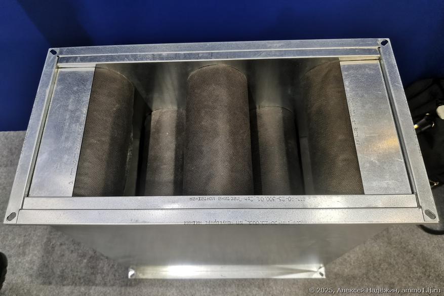 В двух местах увидел необычные шумоглушители. Компания Ventart показала два шумоглушителя собственной разработки — «Тихоня» в виде металлической коробки (лабиринтная конструкция) и вот такой экспериментальный шумоглушитель со множеством мягких валиков в прямоугольном воздуховоде (каждый валик покрыт минватой и слоем геотекстиля). По-моему очень интересная конструкция.