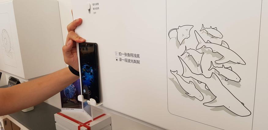 Так как компания очень гордится камерами своих смартфонов (надо сказать, не зря гордится), то в магазин установили и традиционные для выставок демо-стенды, похожие на крошечный вертепчик, накрытый крышкой, сквозь дырку которой можно что-то поснимать. Глазом не видно (впрочем, это из-за аккомодации, если поглядеть в темноту пару минут, то все получится разглядеть), мой штатный Samsung S8 ловит еле-еле, P30 молодец. Просто и наглядно.