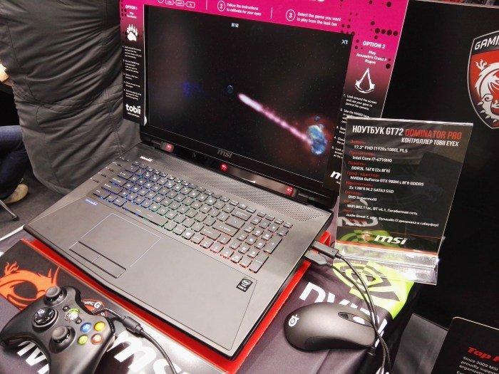 MSI также высоко ставит сегмент игровых ноутбуков. Центром притяжения на стенде стал MSI GT80 — первый ноутбук с механической клавиатурой. Но при ближайшем рассмотрении обнаруживались и более интересные экземпляры. Выше, например, вы видите GT72 со встроенной системой управления Tobii Eyex, отслеживающей направление взгляда (три красных «глазка» под дисплеем). Судя по различным демкам, система пока работает как вспомогательный элемент и с помощью движений глаз позволяет выбирать лишь крупные области экрана (например, элементы меню). Особой надежды, что выстрелит именно этот проект, нет, но инновационность и футуристичность, конечно, располагают к себе.