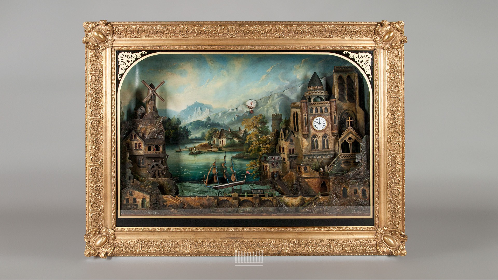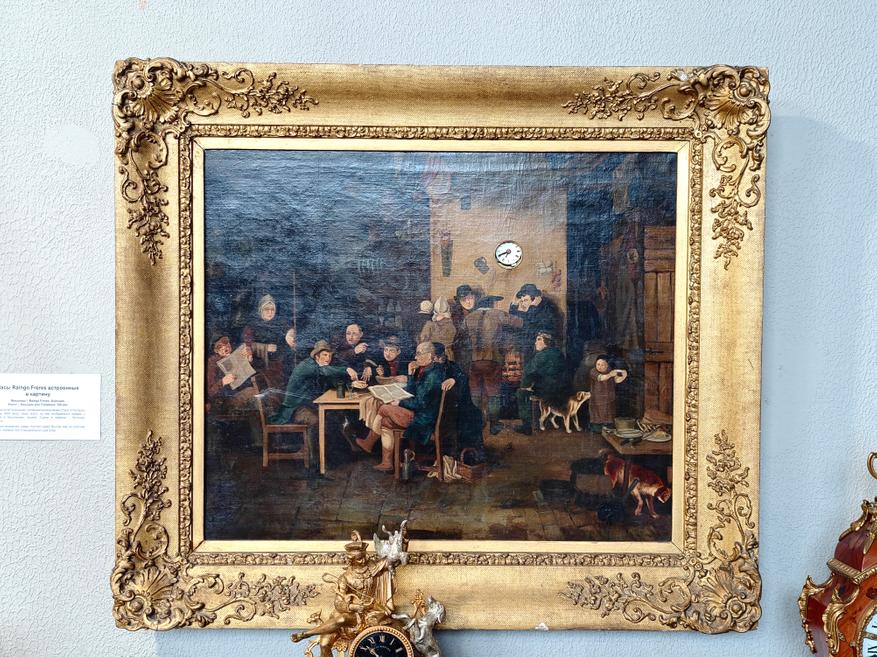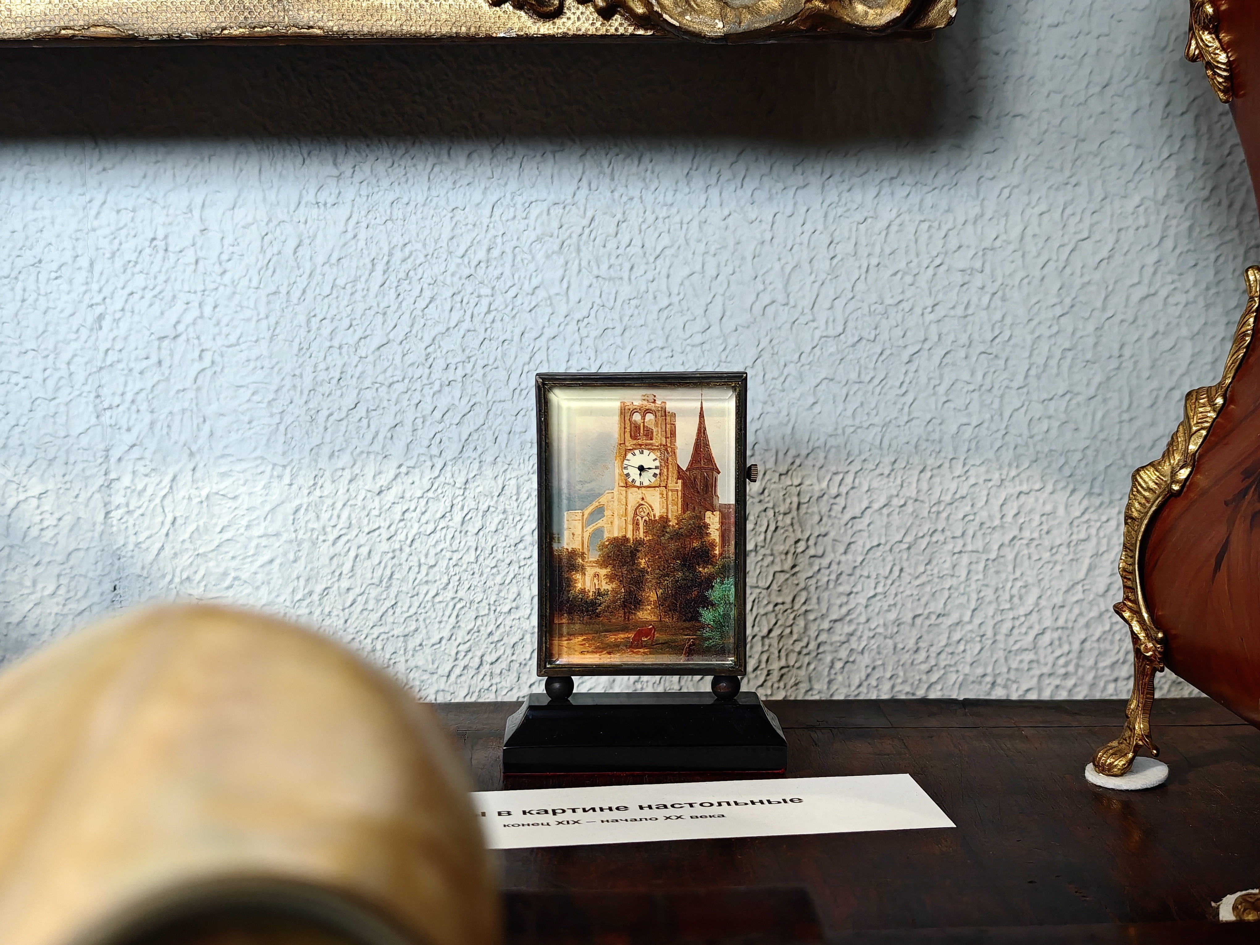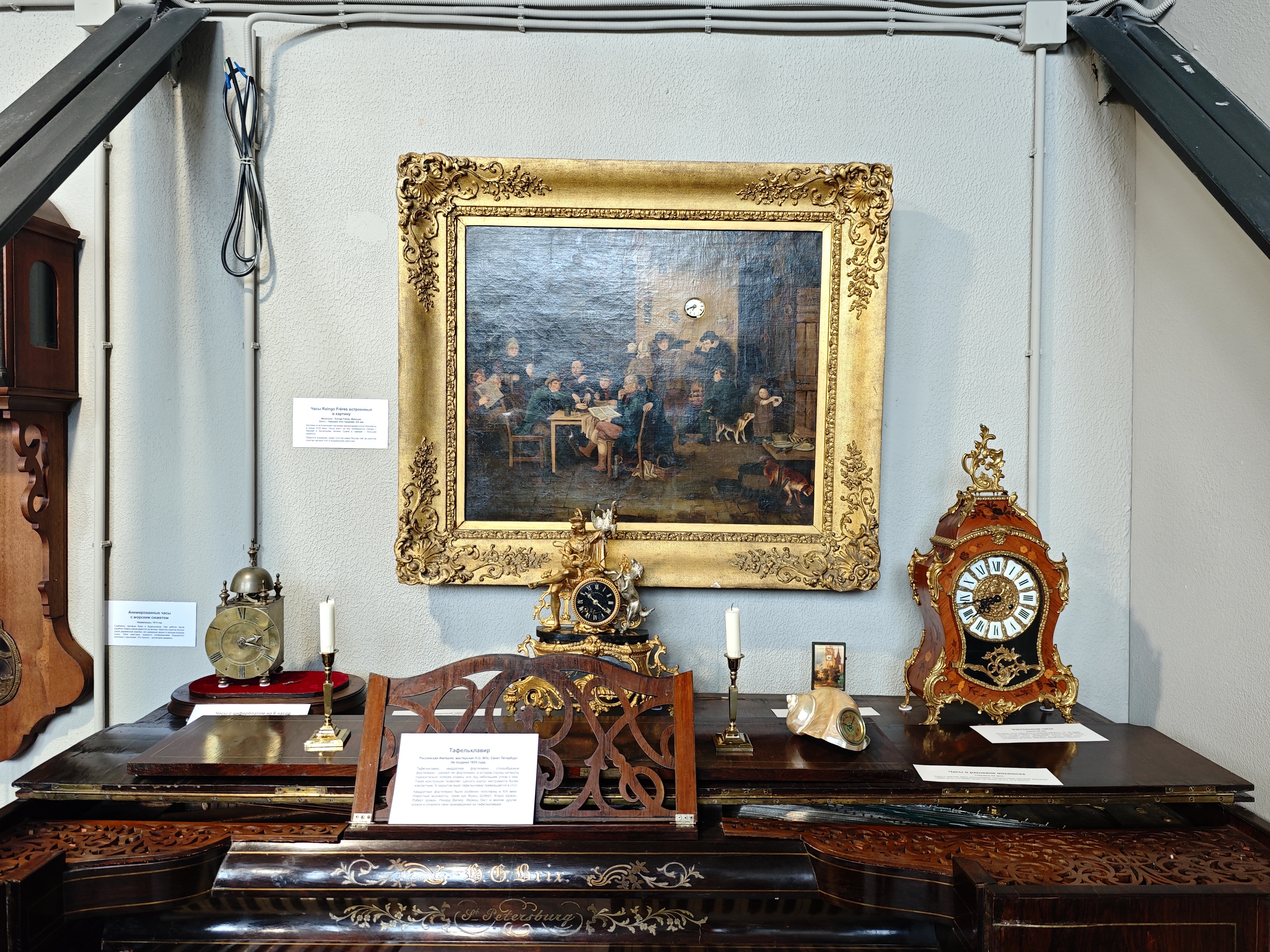 И все же наиболее интересный экземпляр — это часы-картина. Интересна она и с точки зрения «формата», и с точки зрения сюжета. Безусловно, такие картины — не редкость, и даже в этом музее «живописных» часов несколько: