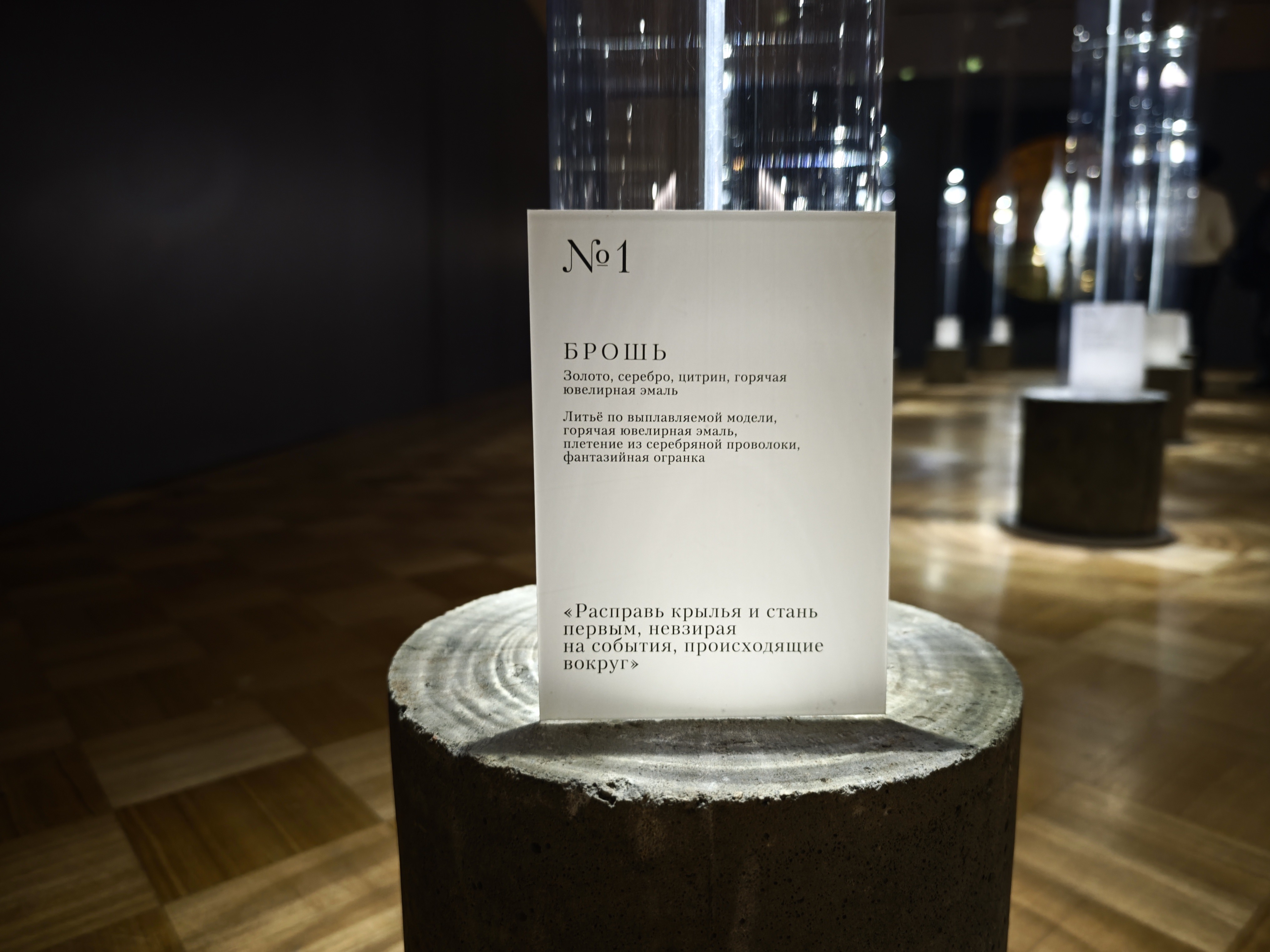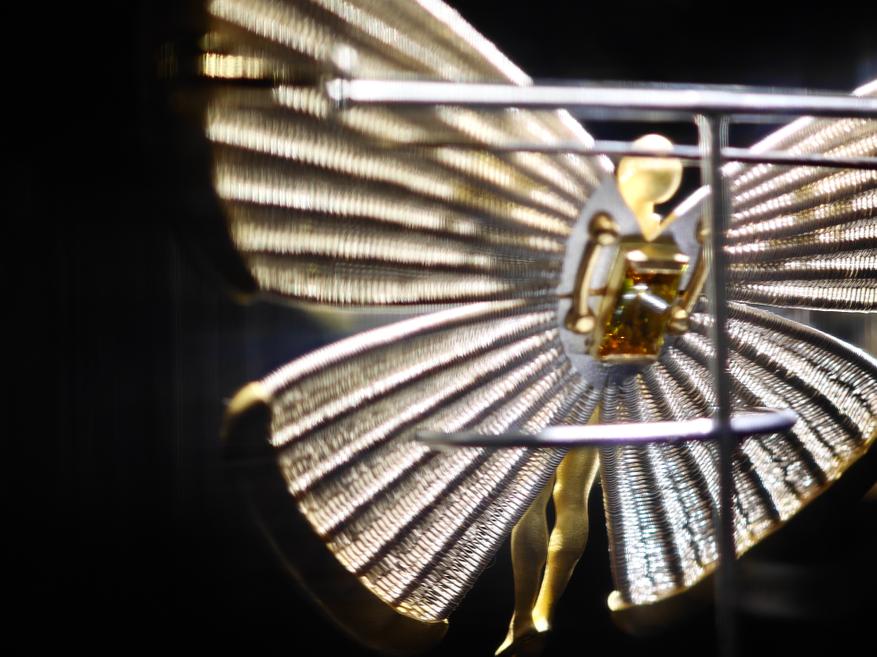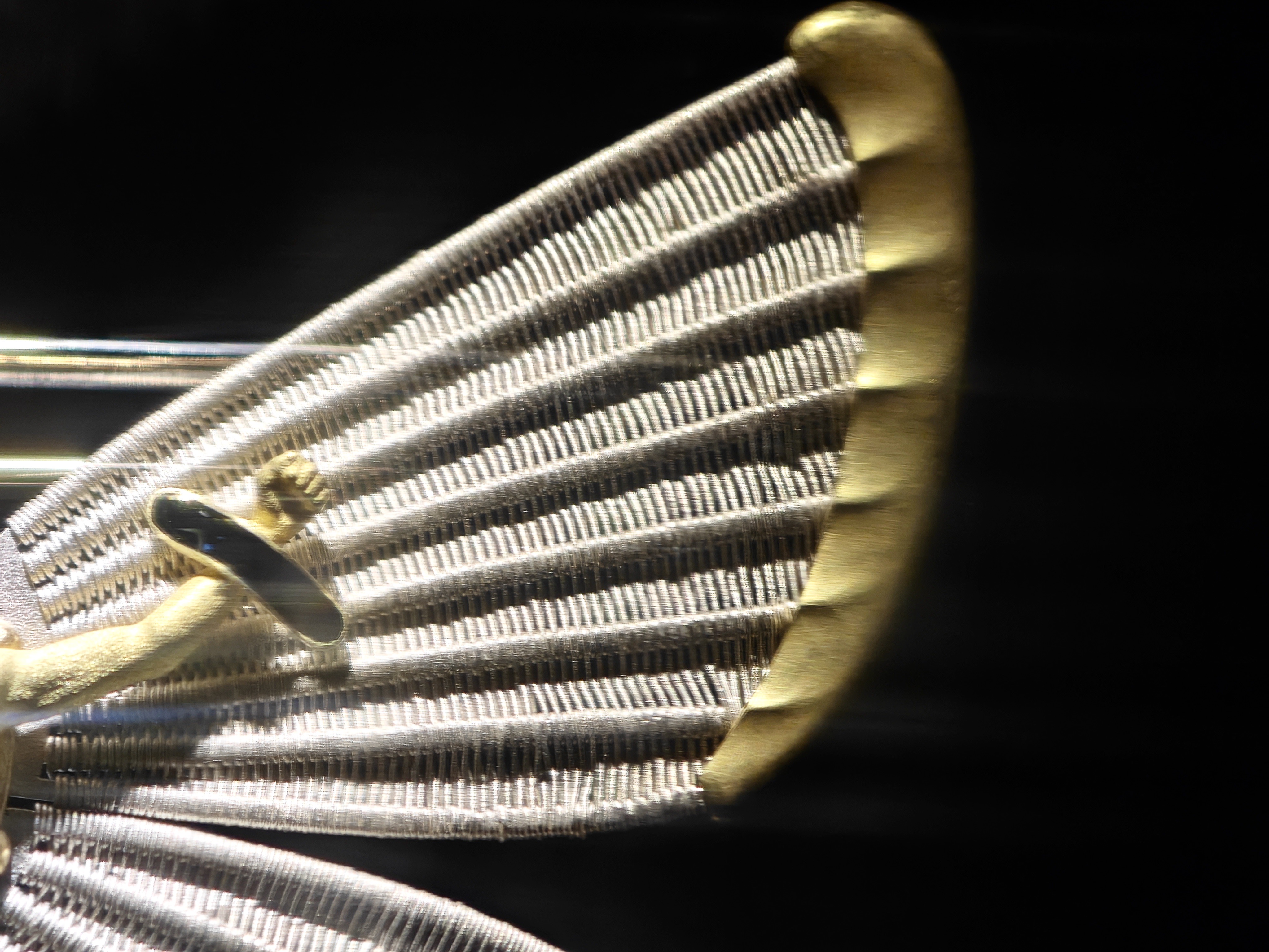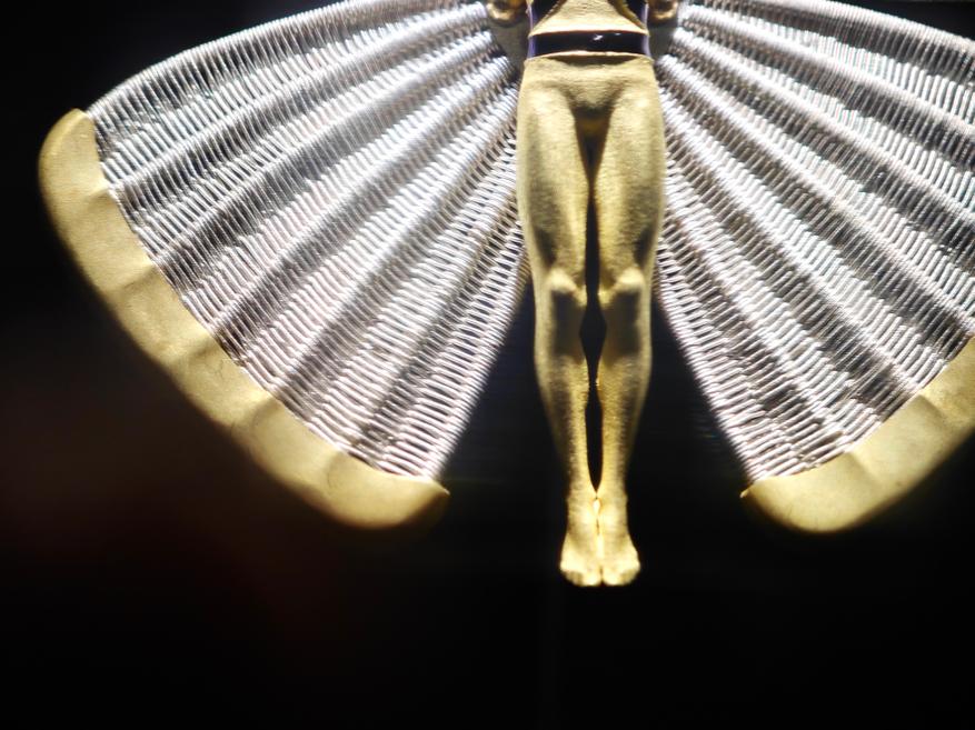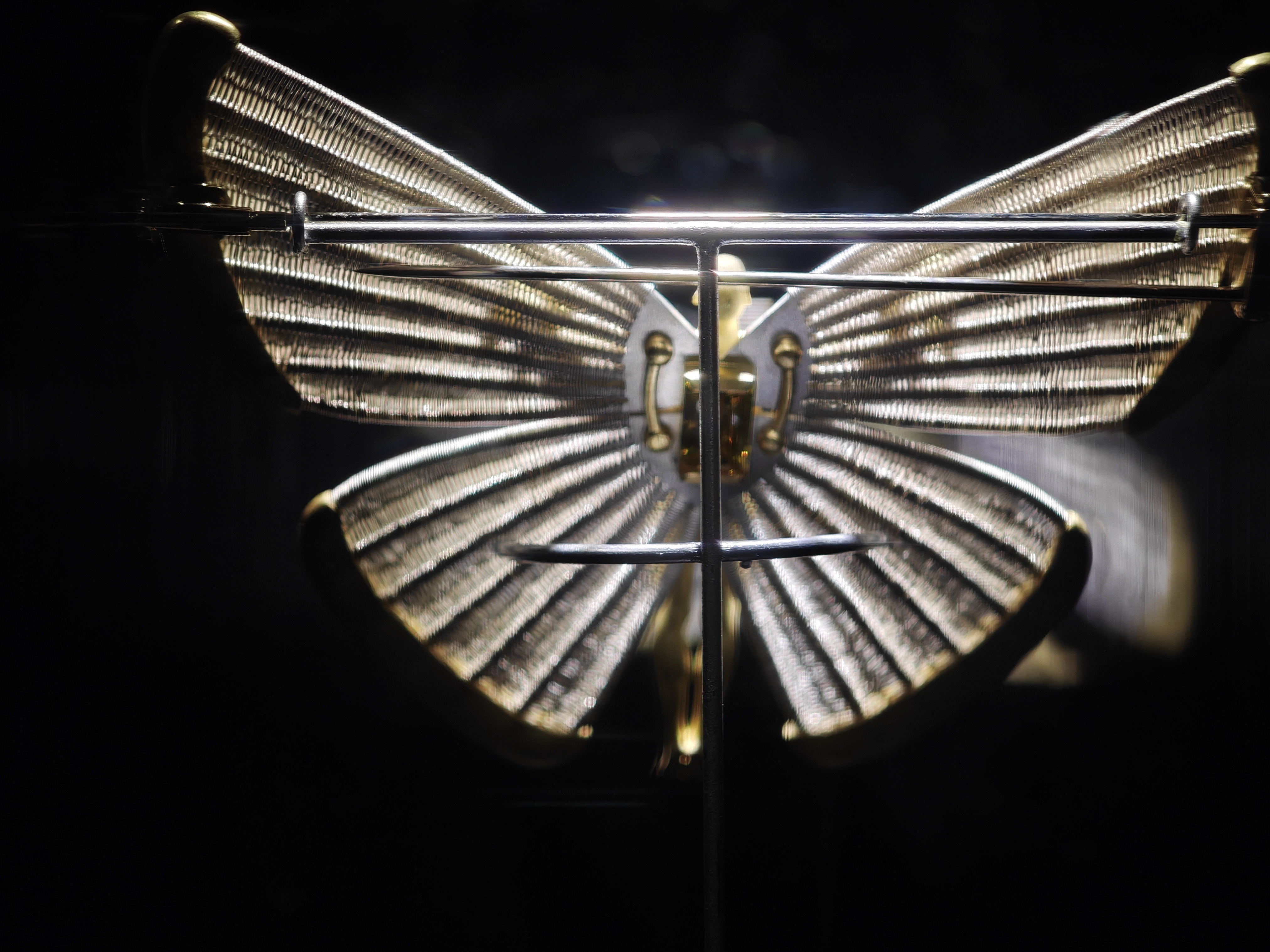 Никакого дополнительного декора, россыпи камней, а основной узор — плетение тончайших нитей в «восковой» оплетке. И, тем не менее, Икар — одна из самых сложных бабочек выставки, потому что, по сути, единственная живая.