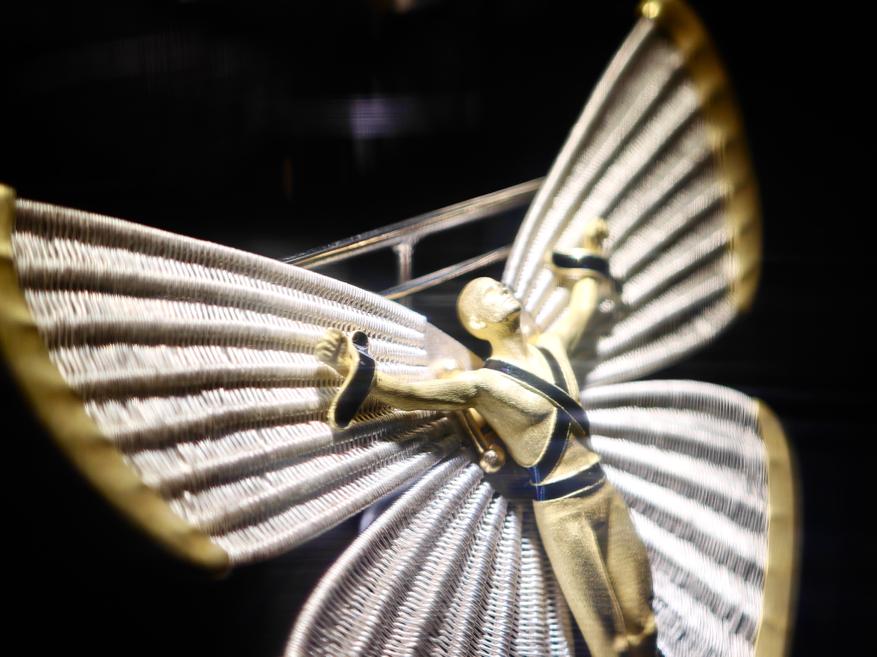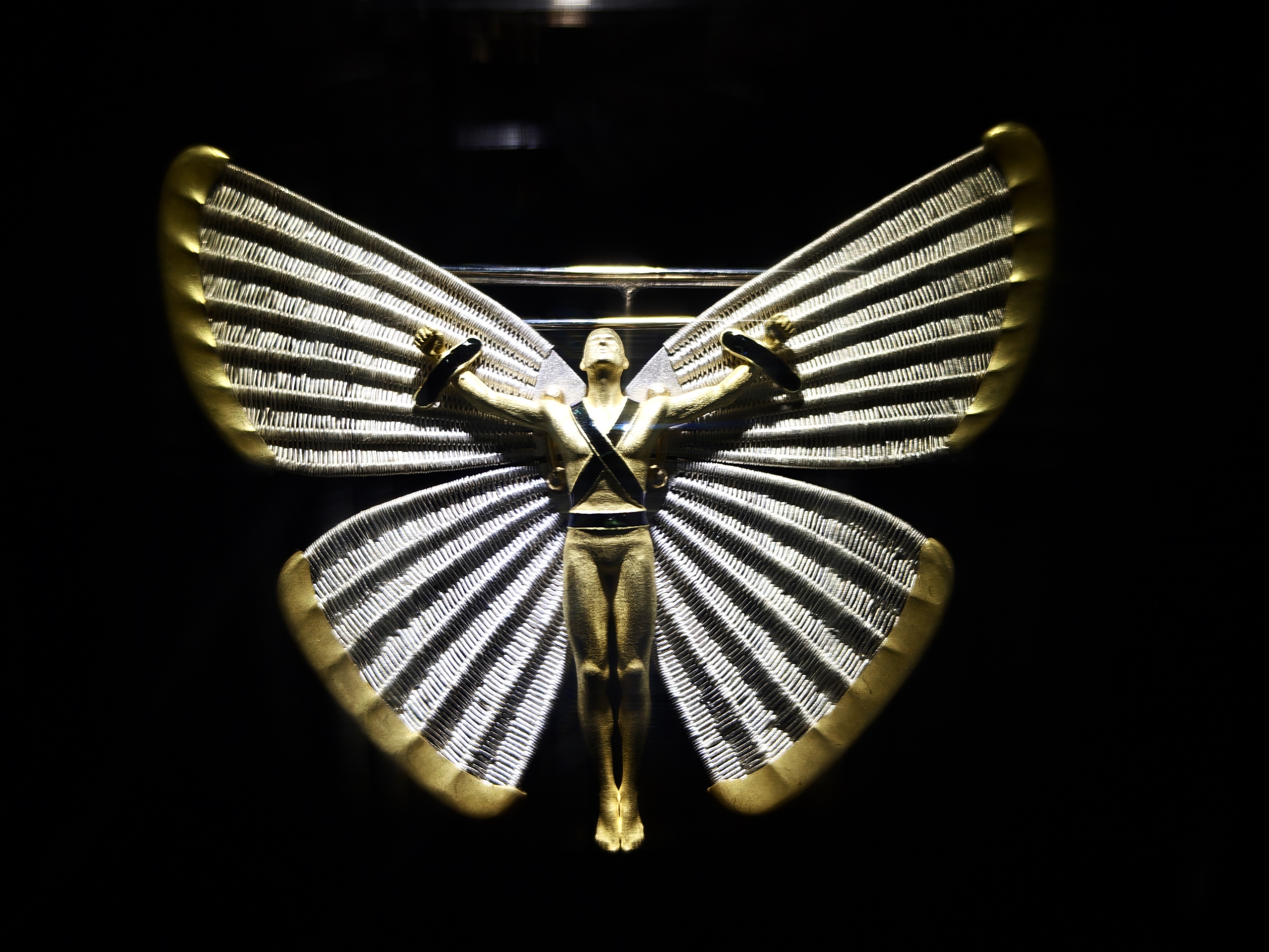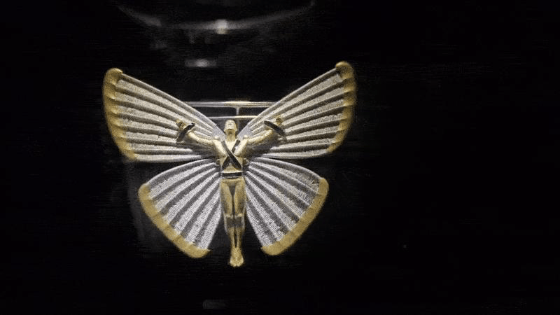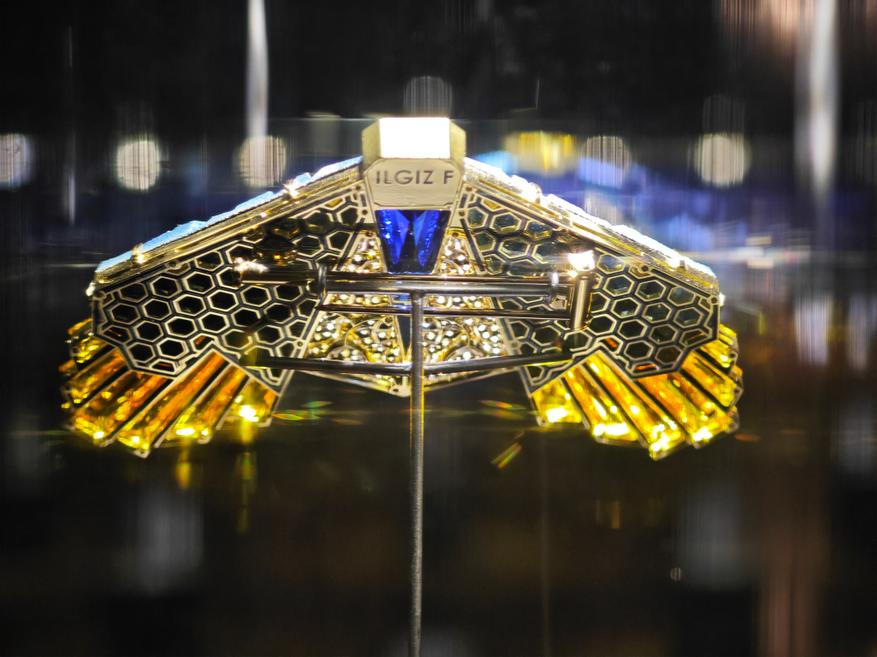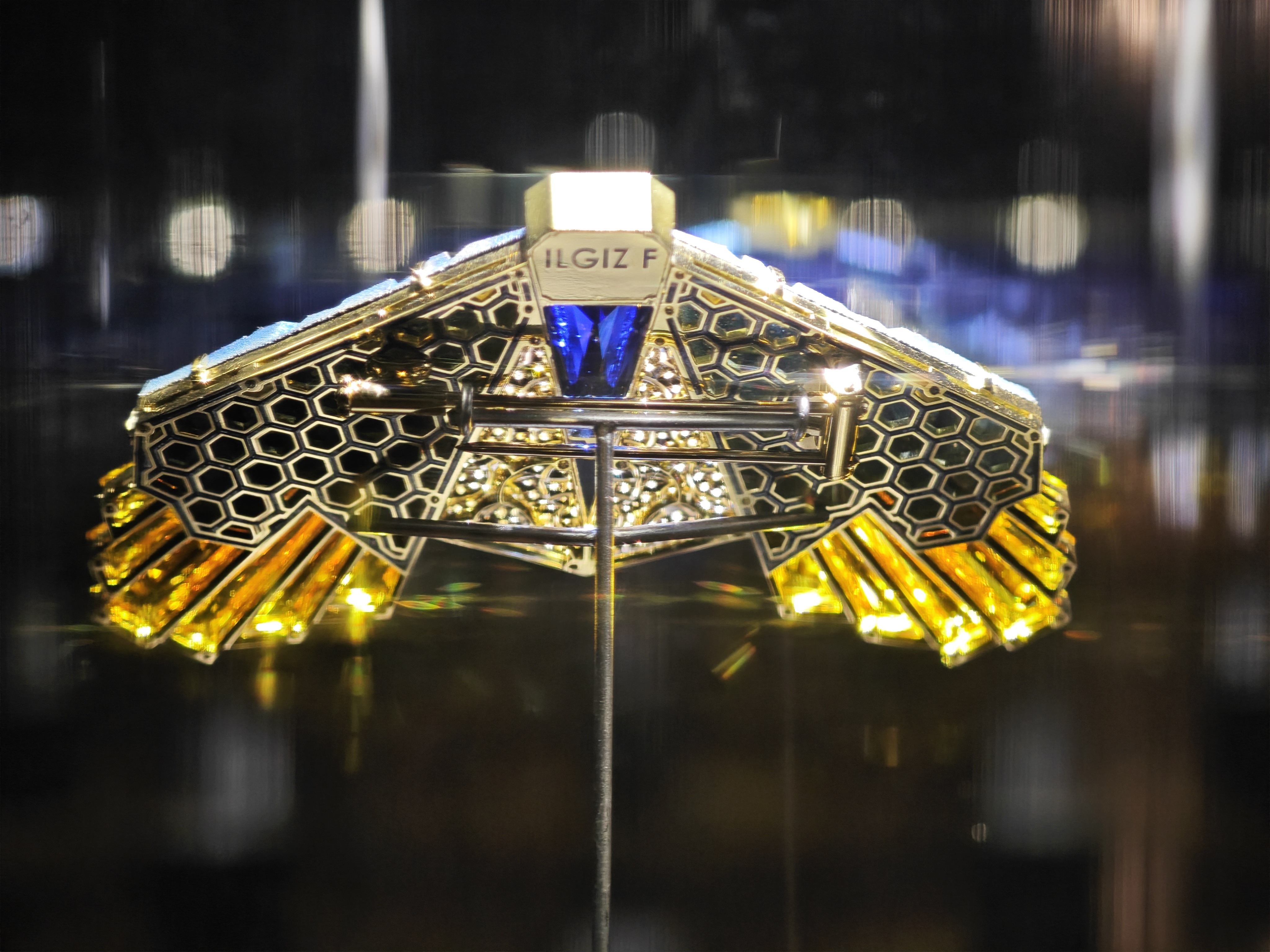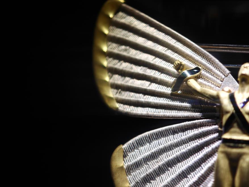 Никакого дополнительного декора, россыпи камней, а основной узор — плетение тончайших нитей в «восковой» оплетке. И, тем не менее, Икар — одна из самых сложных бабочек выставки, потому что, по сути, единственная живая.