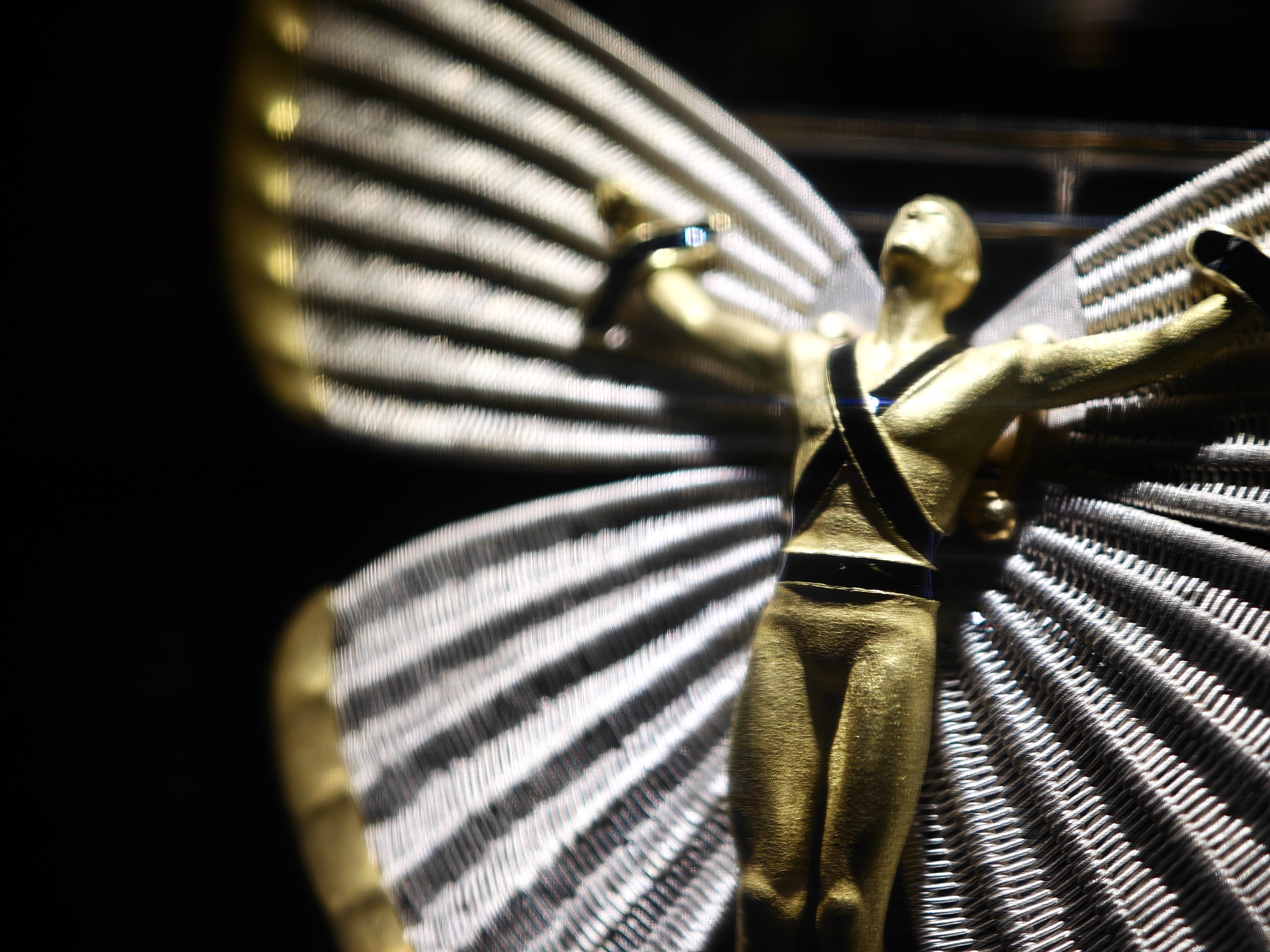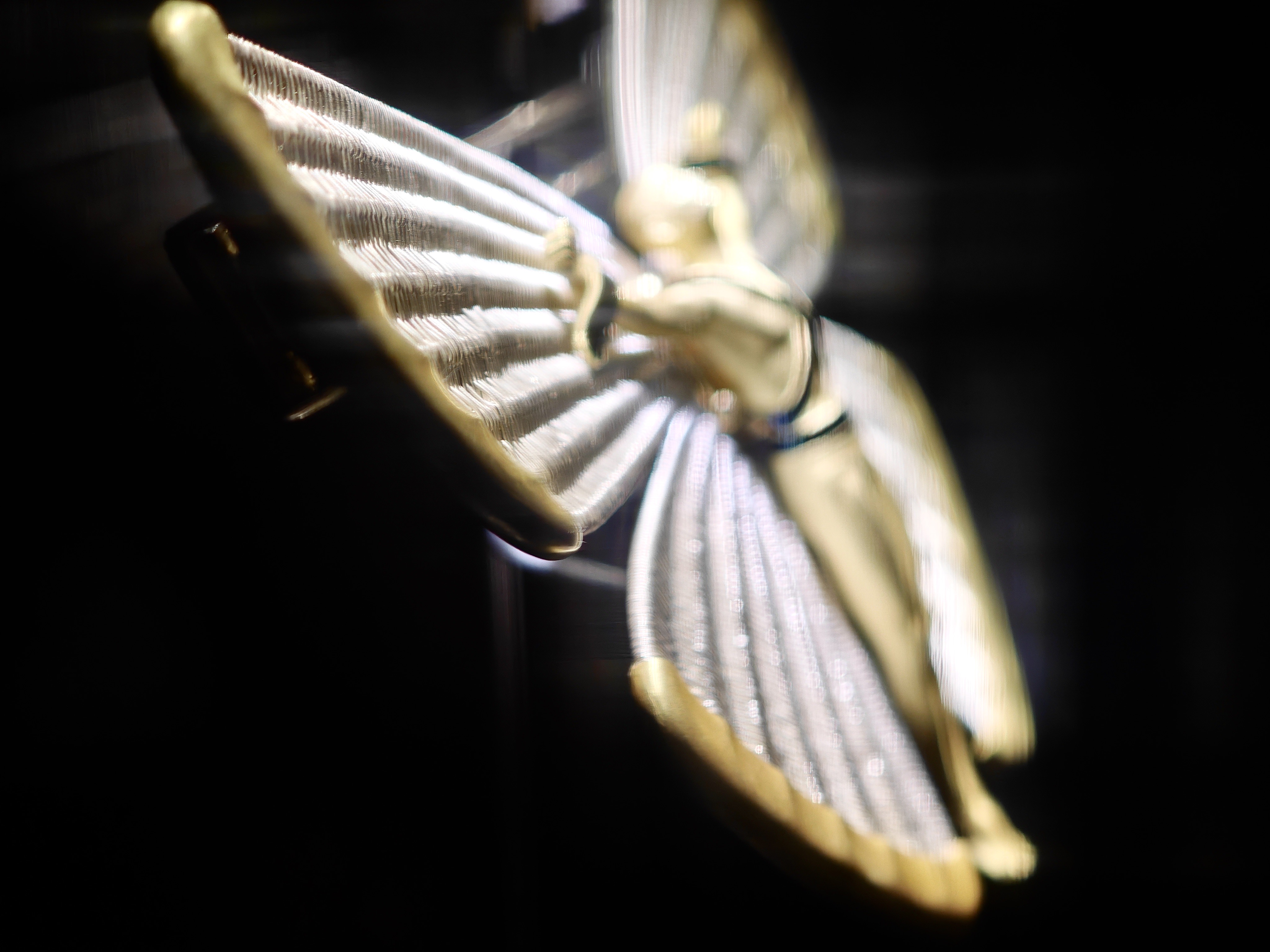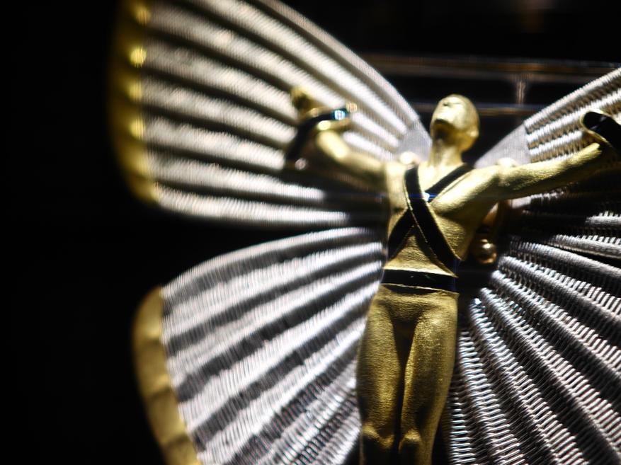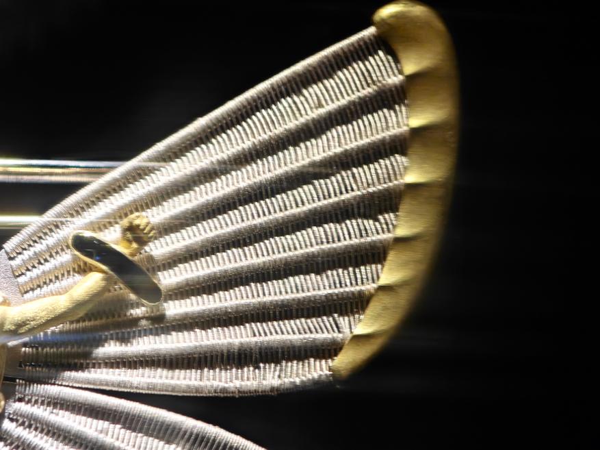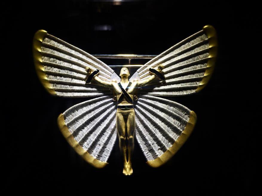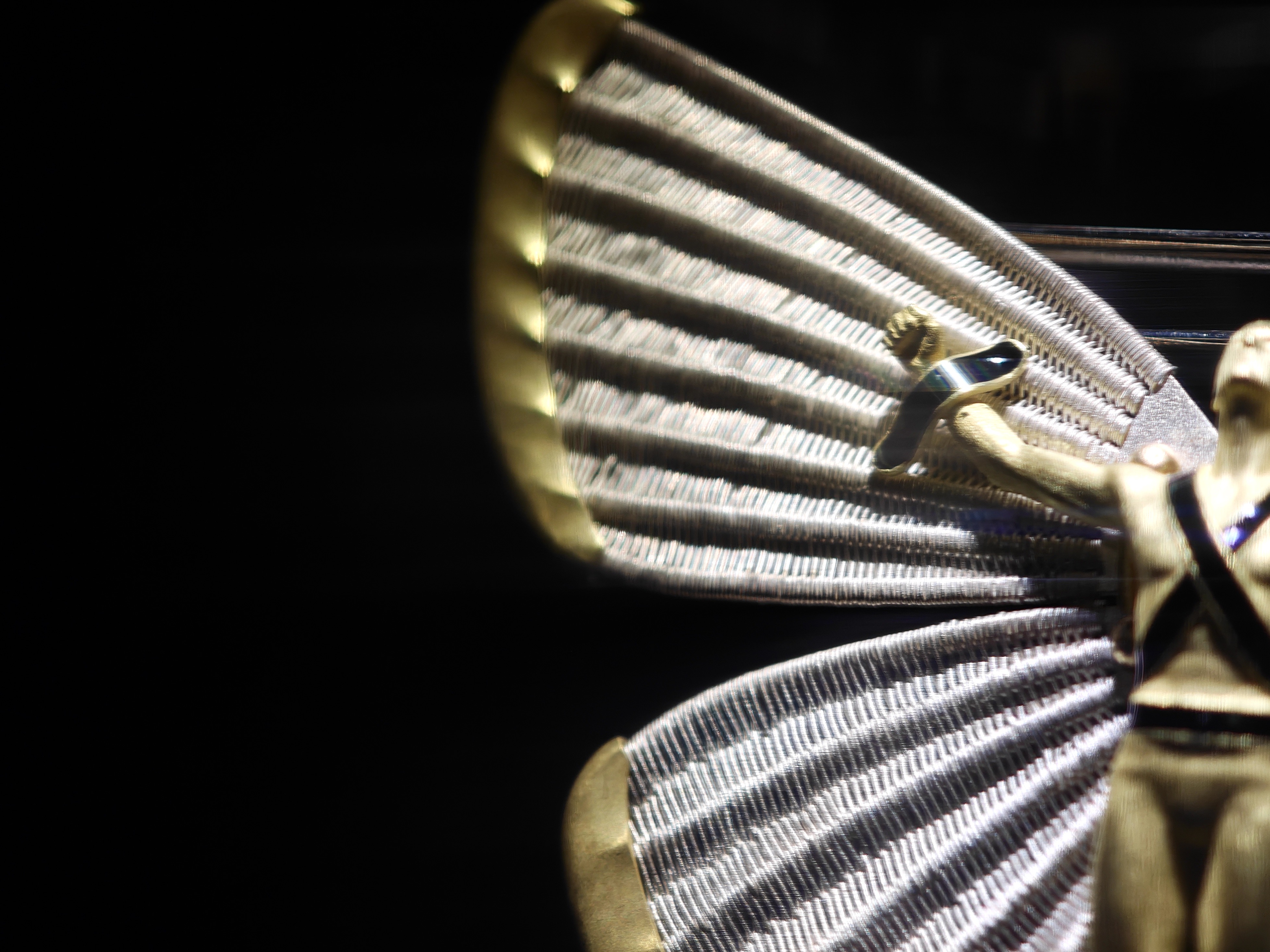 Никакого дополнительного декора, россыпи камней, а основной узор — плетение тончайших нитей в «восковой» оплетке. И, тем не менее, Икар — одна из самых сложных бабочек выставки, потому что, по сути, единственная живая.