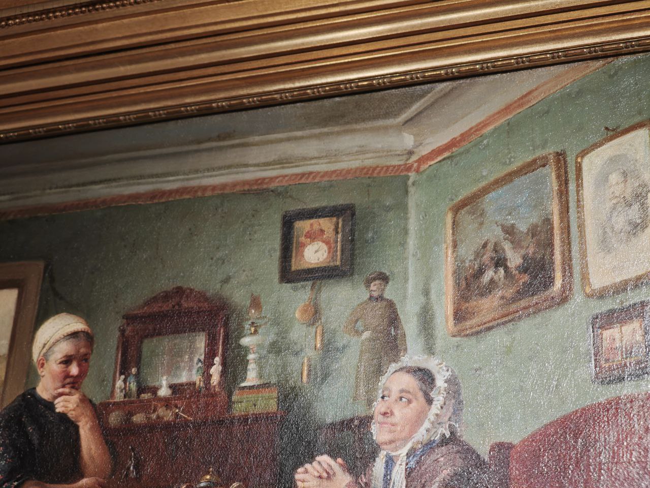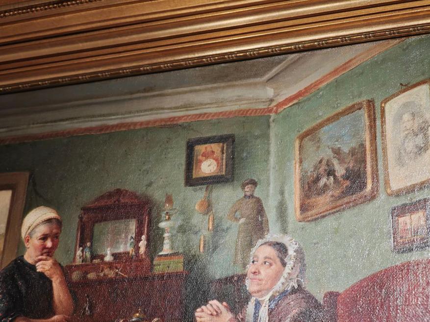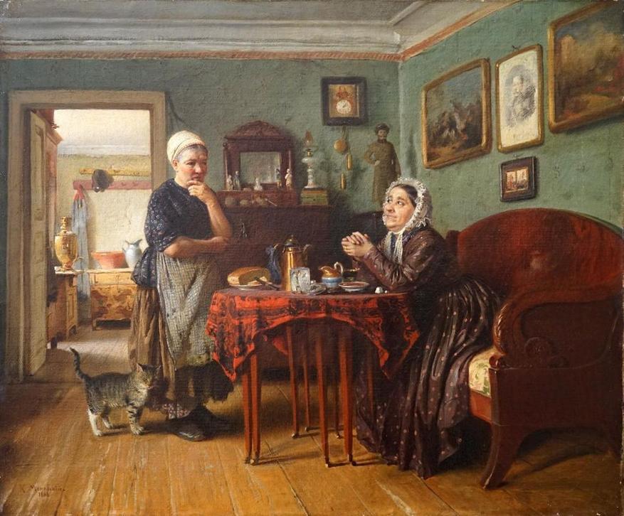 Дело в том, что с масштабированием Передвижных выставок, зритель стал куда более разнообразным, зачастую — куда менее образованным, поэтому и было необходимо писать четко, буквально, не оставляя двусмысленностей. Традиционно принято считать, что здесь обедневшая дворянка выдает очередное поручение прислуге, которую ей удалось сохранить после отмены крепостного права.