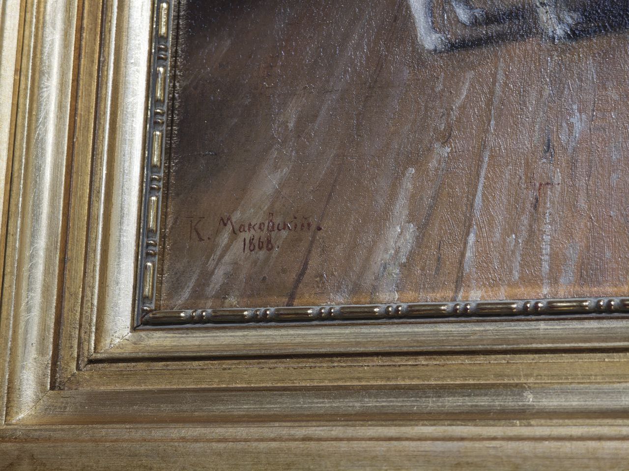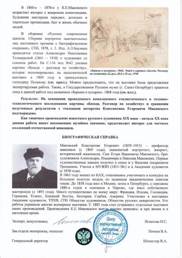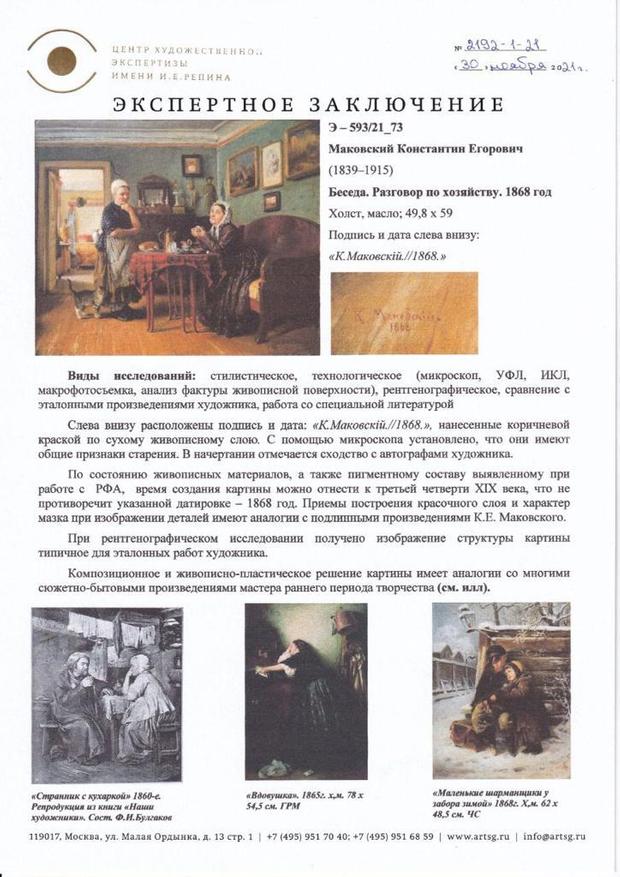 Иронично, но даже экспертное заключение к данной картине отдельно убеждает, что это все-таки Константин, уточняя, что интерес к бытовой живописи все-таки просыпался у него в 1860-х. Причем, чтобы уж совсем не оставить места сомнениям таким зрителям, как я, в приложении есть ссылка на ранний каталог произведений.