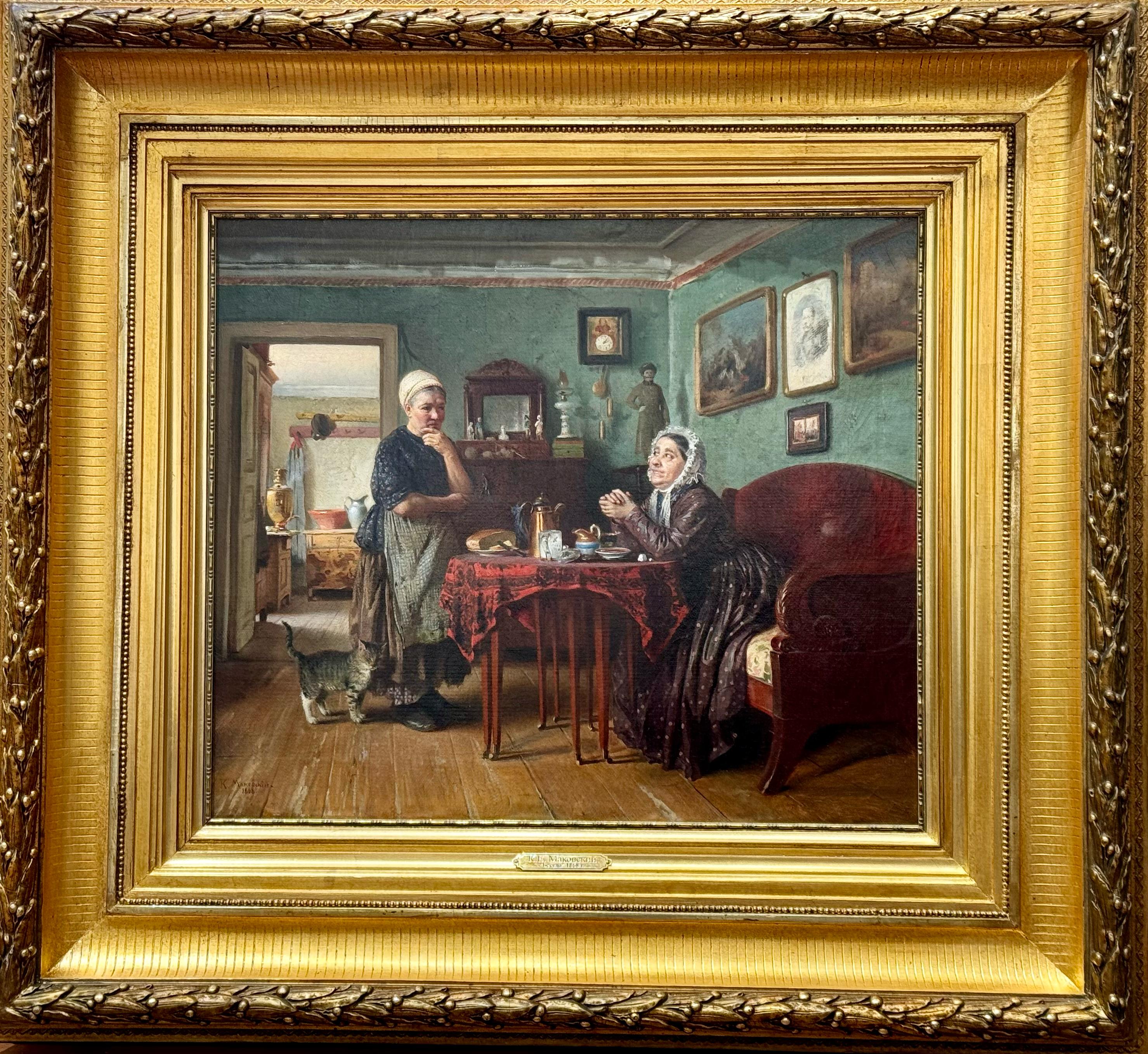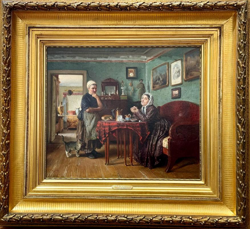 Моя привычка заглядывать в окна первых этажей на этот раз привела меня к интересной картине Константина Маковского, которая называется «Разговор по хозяйству».