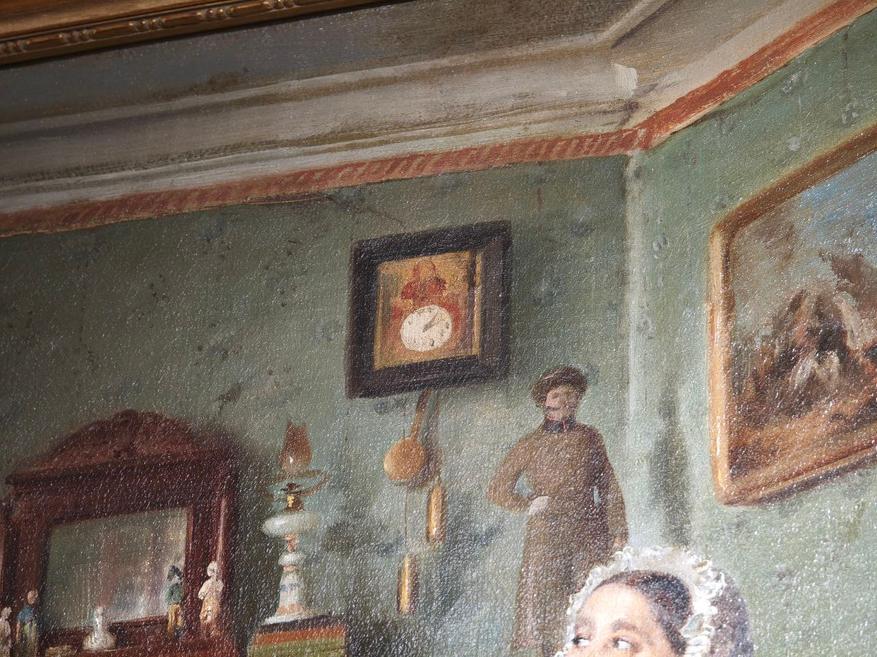 Судя по раме, это не просто часы, а весьма популярный тренд тех лет — «часы-картины», то есть часы, встроенные в картину буквально. Сегодня множество подобных образцов есть в коллекции Музея «Собрание», а один из них я показывал здесь, когда рассказывал о «картине из мема».