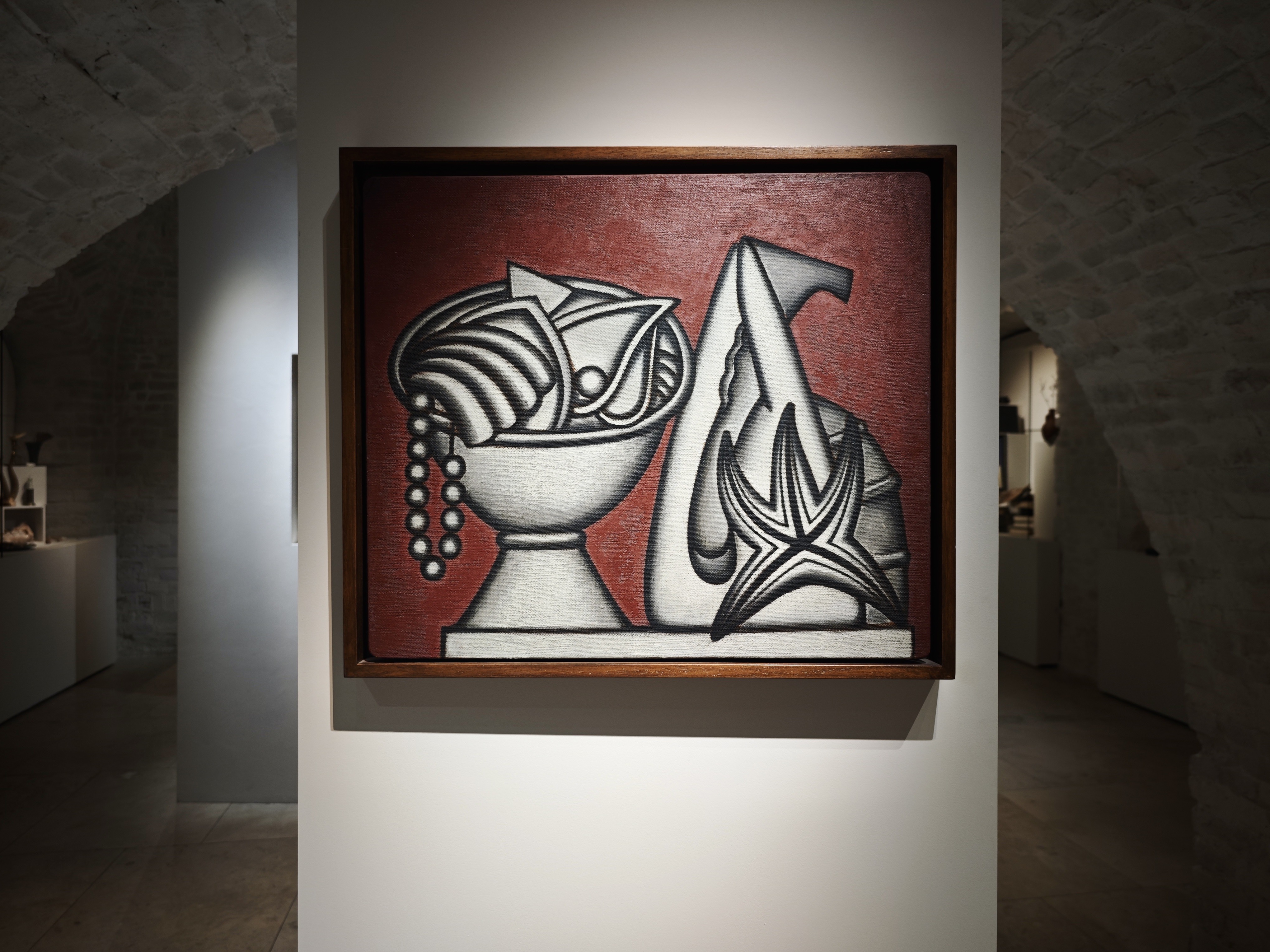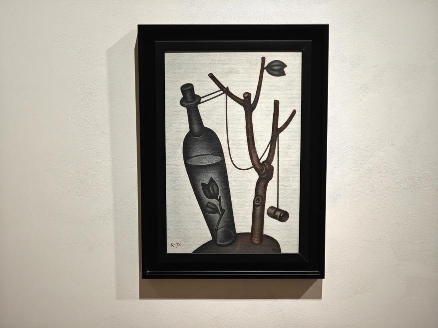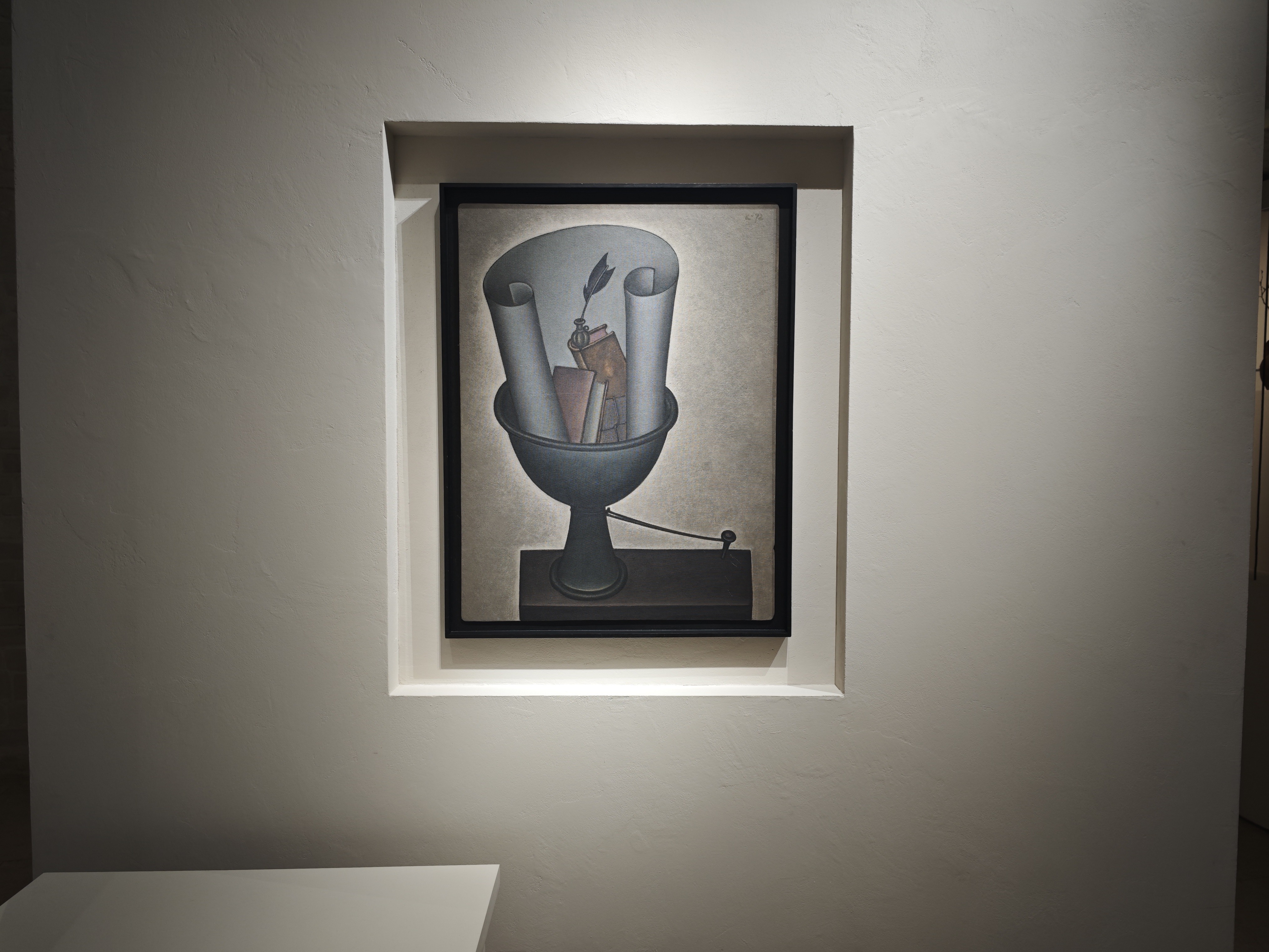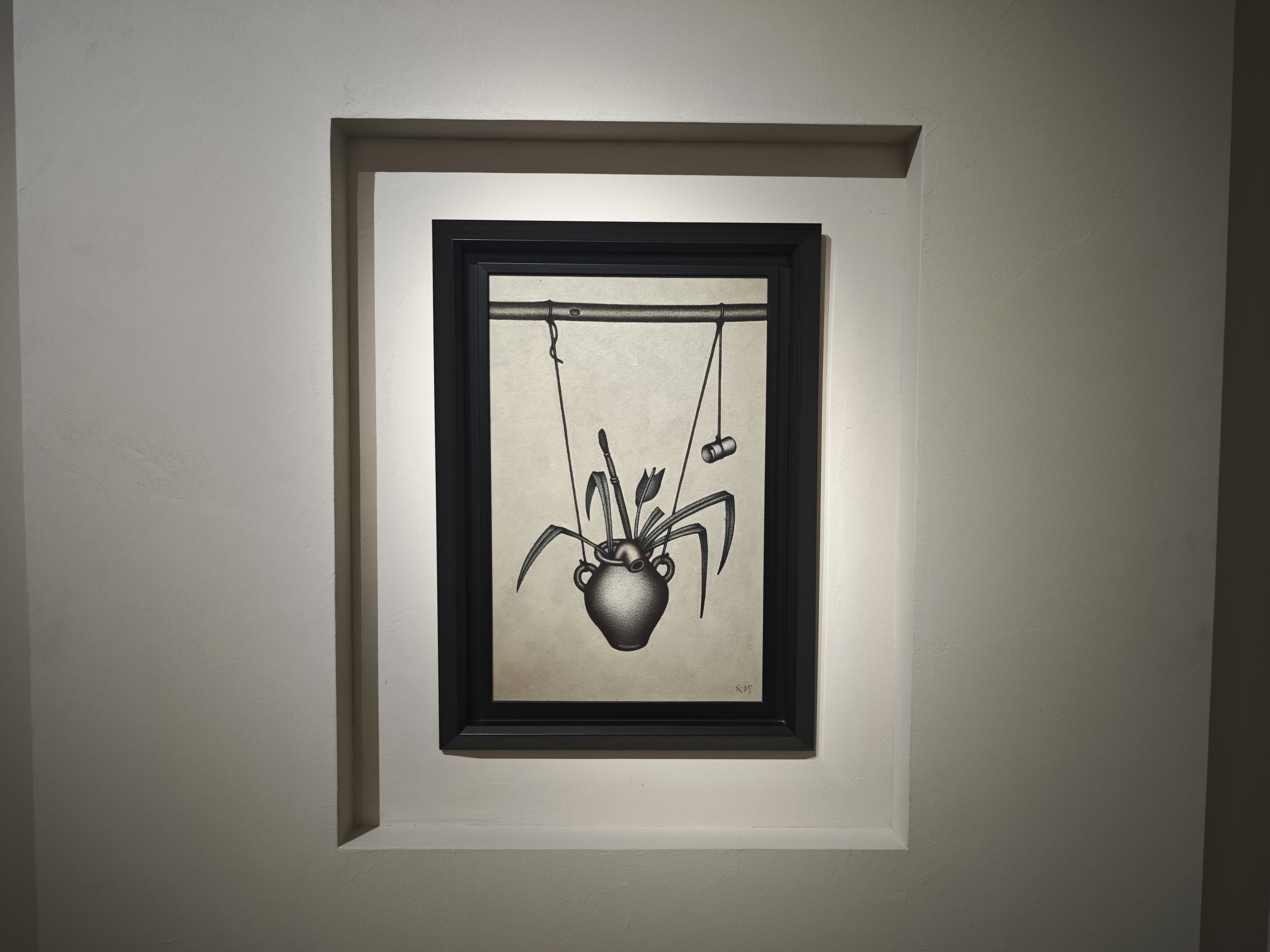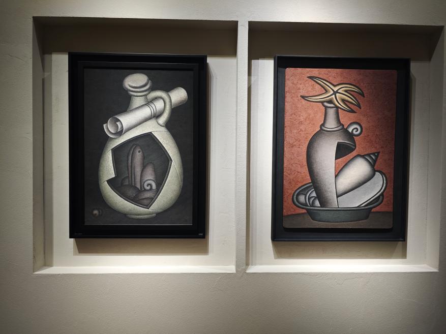 По мнению художника, в мире есть очень хрупкие красоты, которым необходимо придать жесткую форму. И это ровно то, что он и делает: перед нами жесткий, твердый рисунок, где мы видим хрупкие амфоры, листы бумаги, возможно, с поэзией или нотами, фрагменты раковин, листья растений. А это не просто недолговечные вещи, а еще и культурные символы недолговечности, хрупкости и бренности бытия.