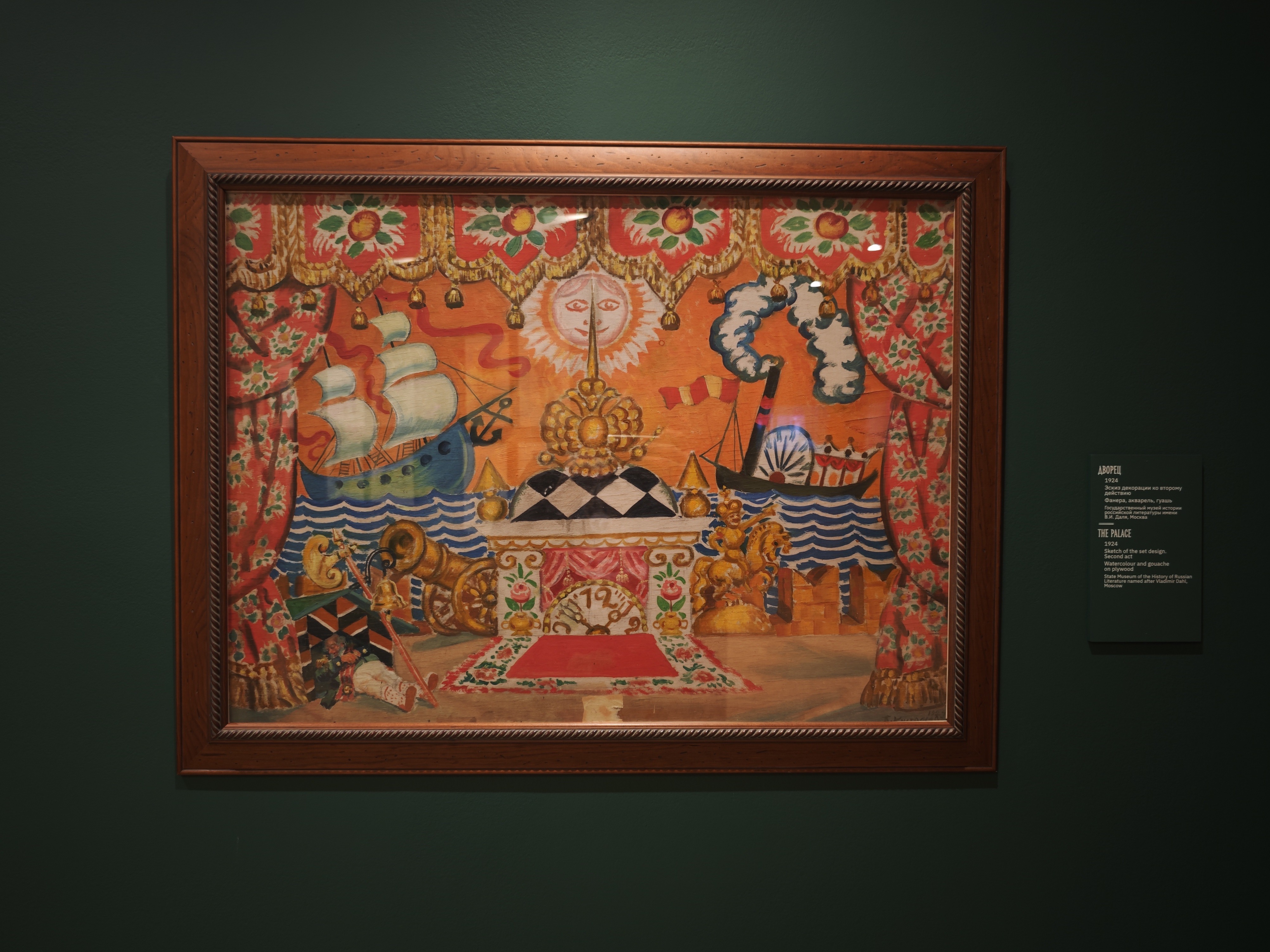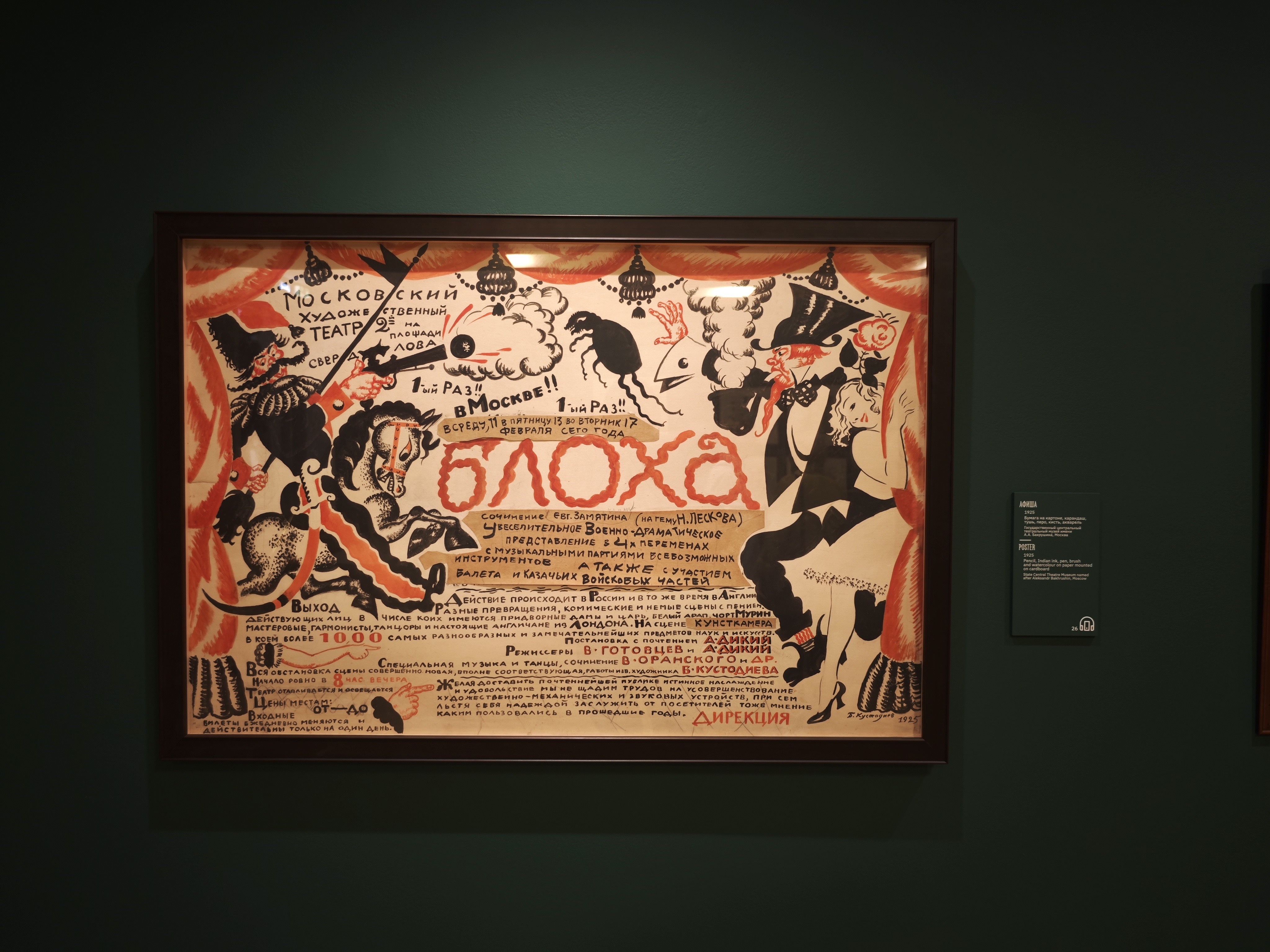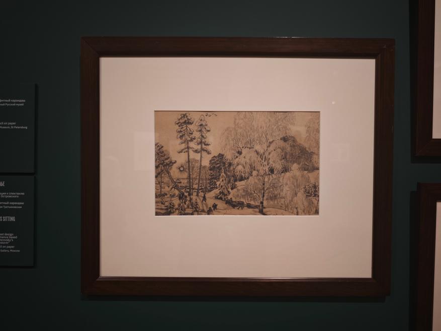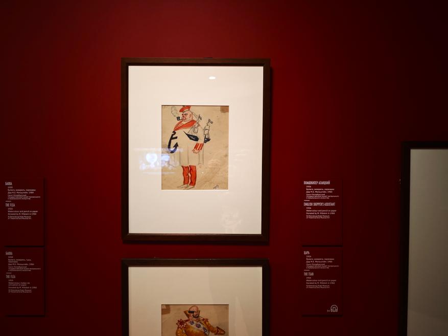 Большая заслуга Третьяковки на этот раз — подборка театральных эскизов к «Блохе». Здесь мы видим предложенные Кустодиевым декорации: