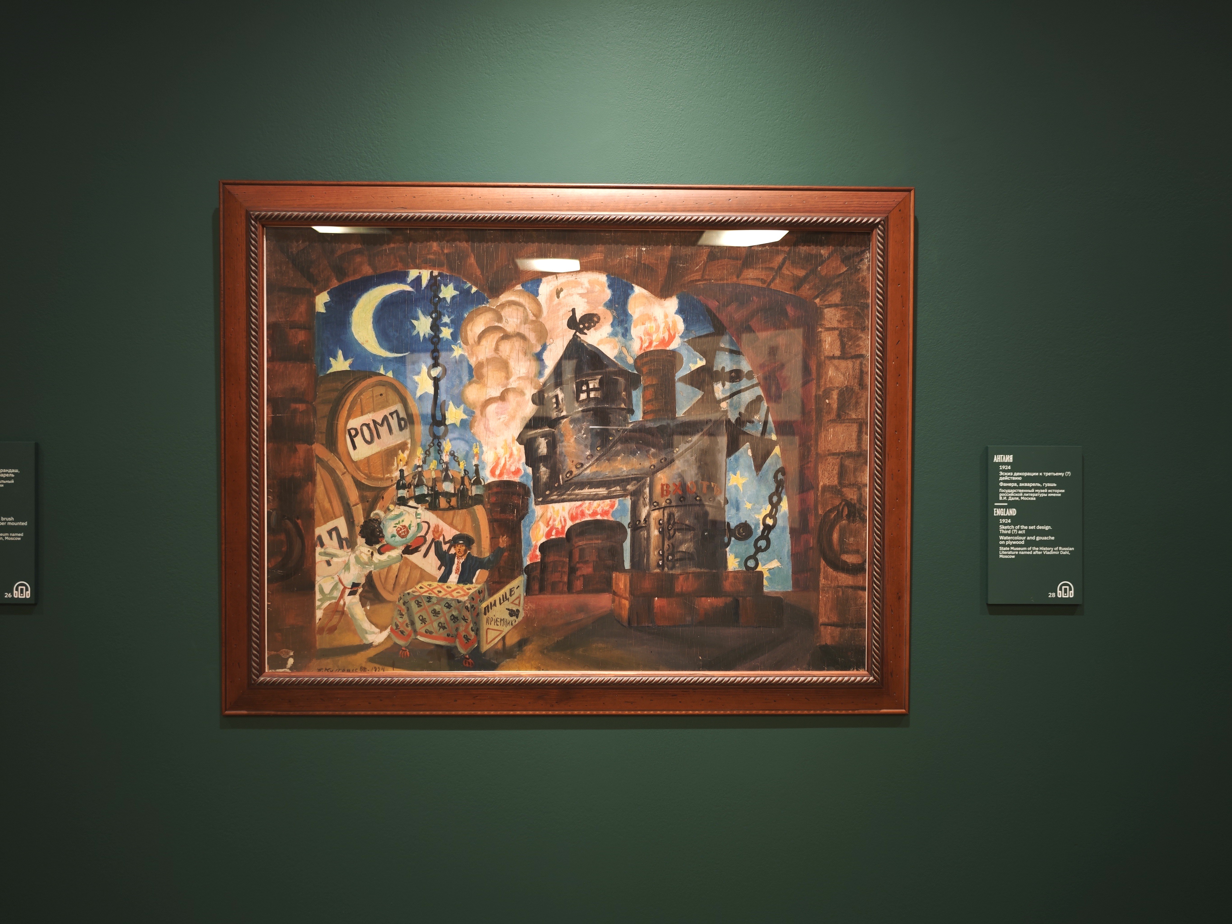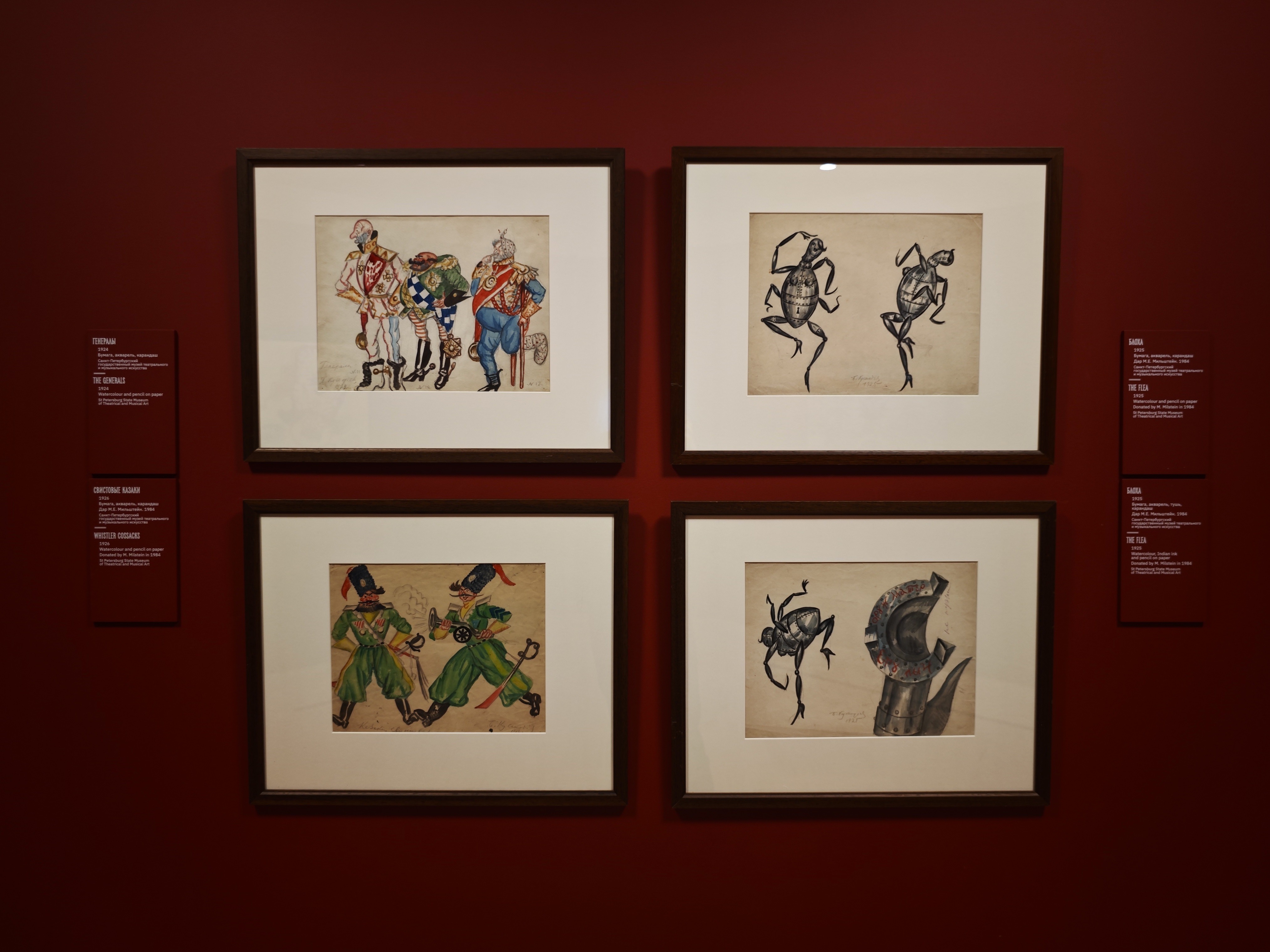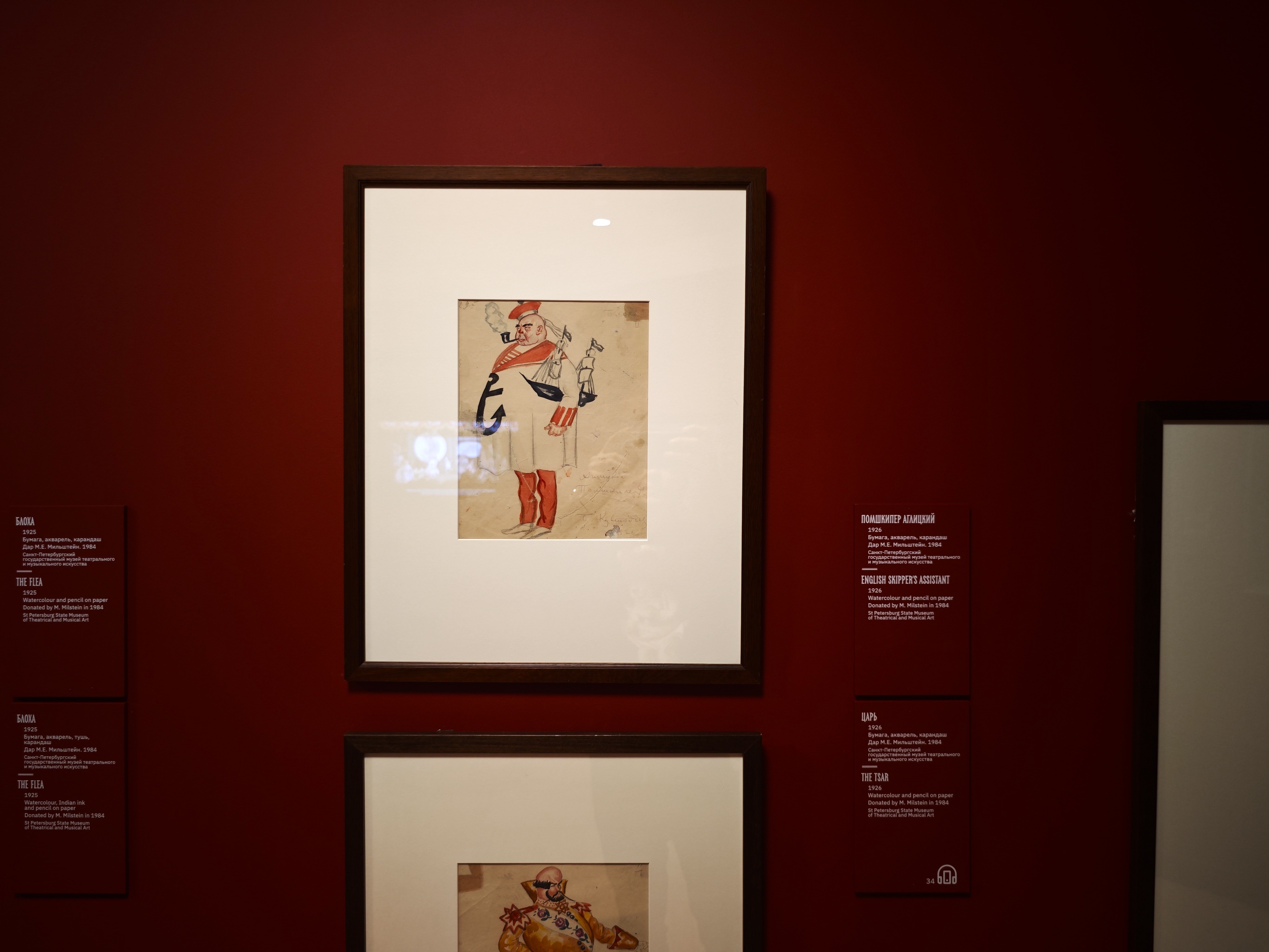 Большая заслуга Третьяковки на этот раз — подборка театральных эскизов к «Блохе». Здесь мы видим предложенные Кустодиевым декорации: