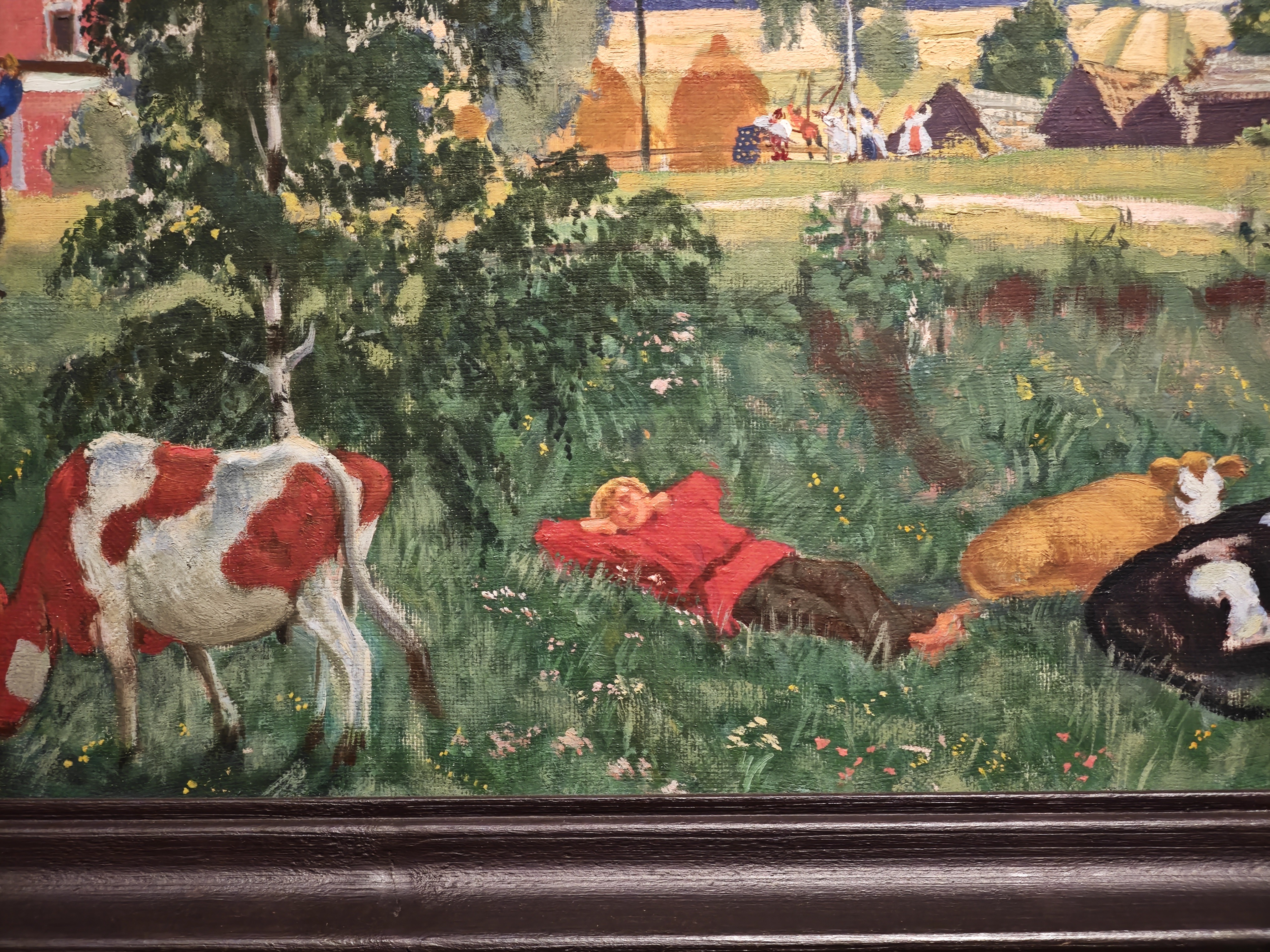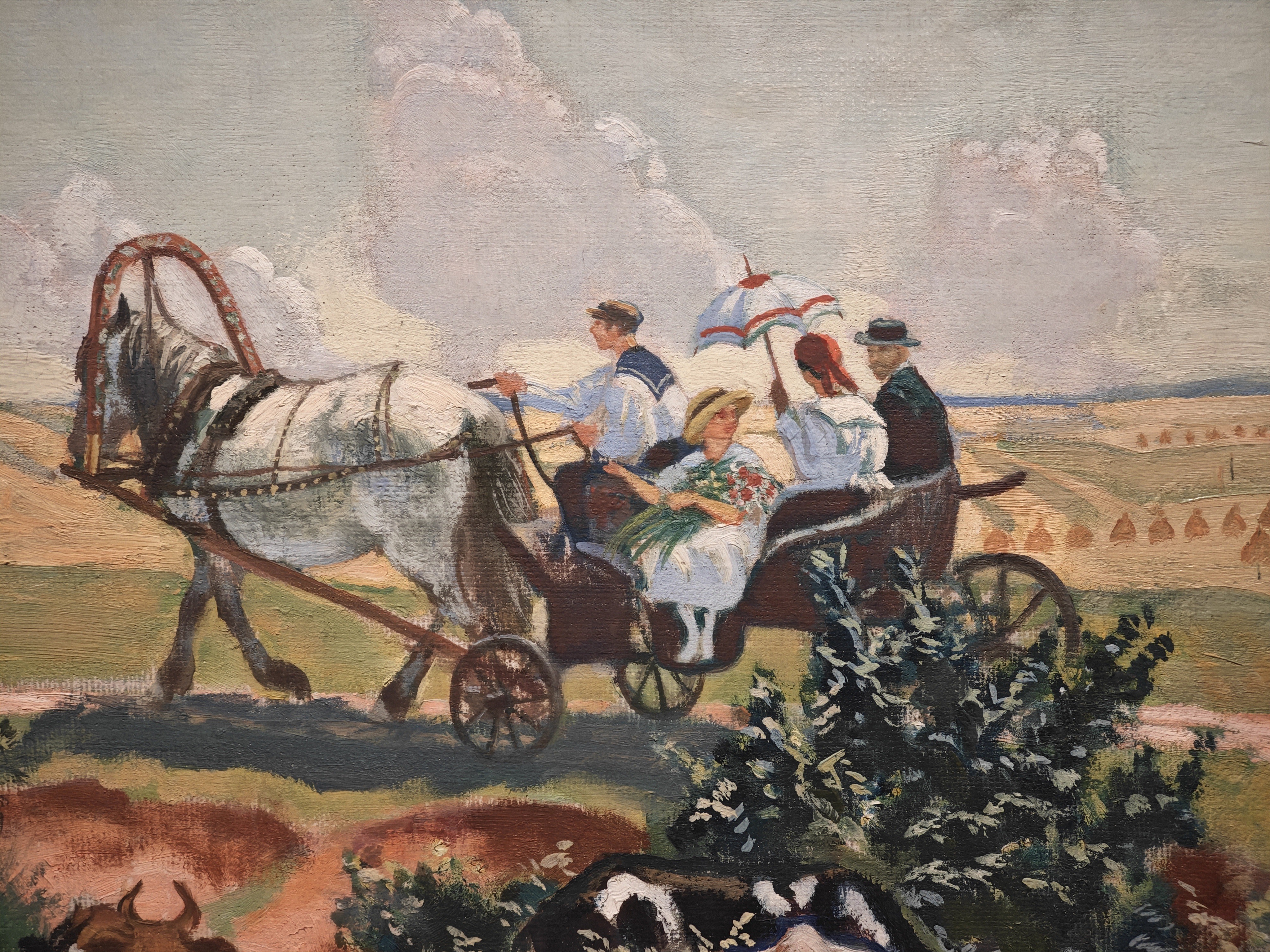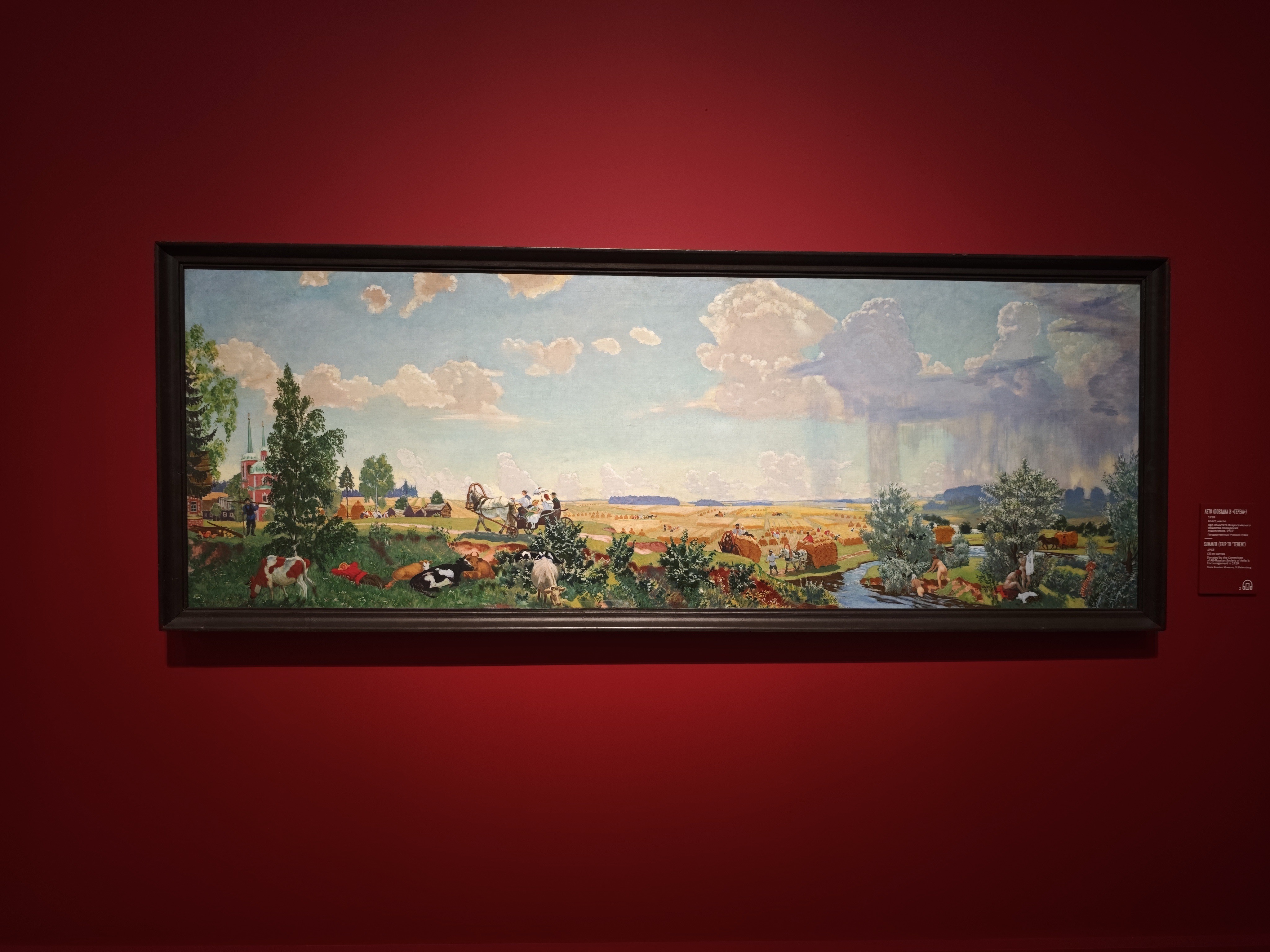 Борис Кустодиев, вероятно, тщательно следил за тем, чтобы манера соответствовала изображенной ситуации. Умел он рассказывать истории, и в этом случае даже холст он подбирал соответствующий, «эпичный», протяженный: