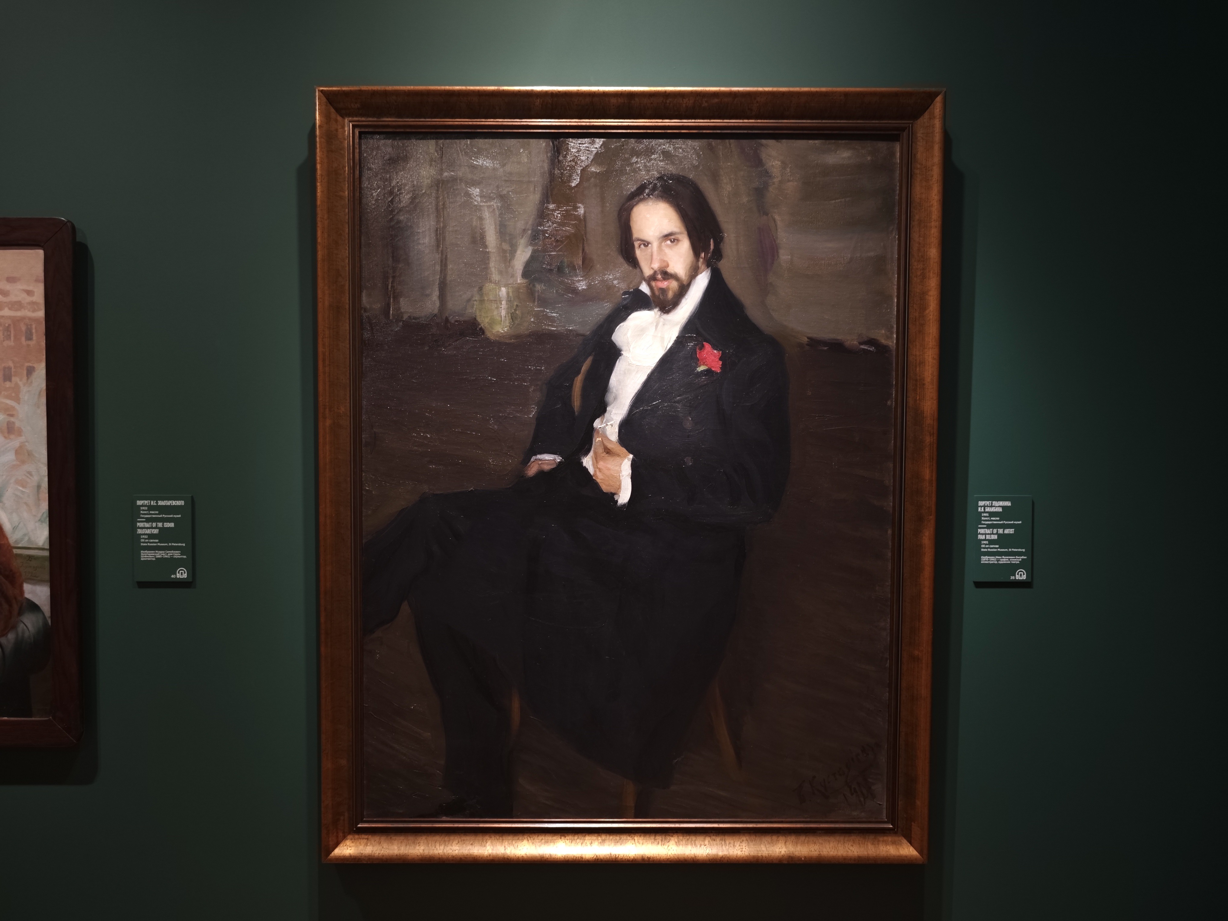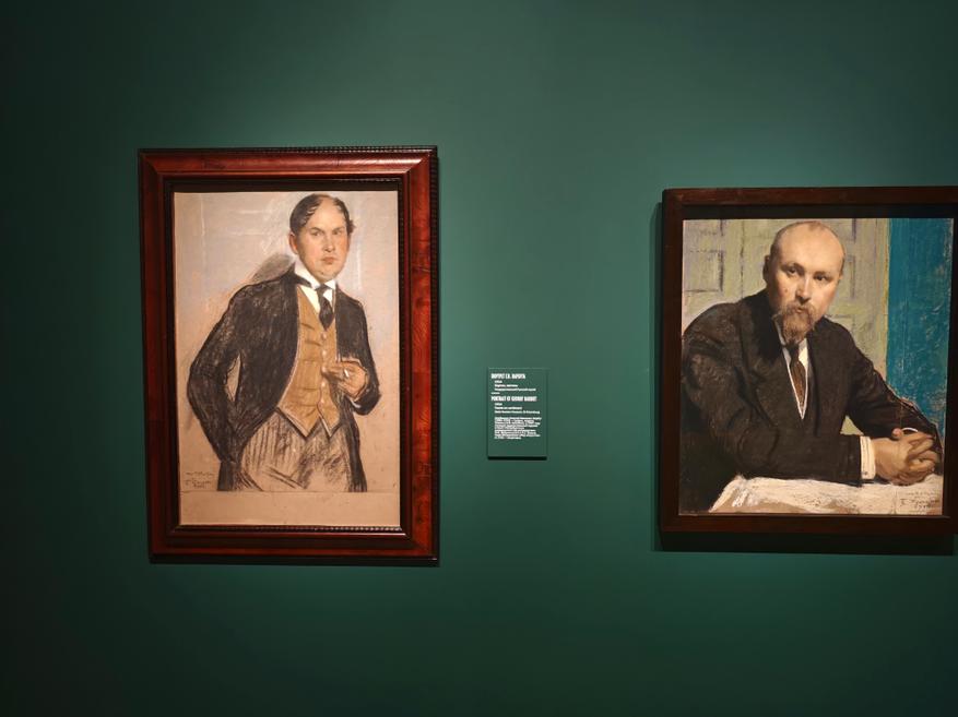 Которые окружены другими портретами друзей и известных современников, где, пожалуй, жемчужиной является великий портрет великого Билибина, тоже, конечно, очень «театральный»: