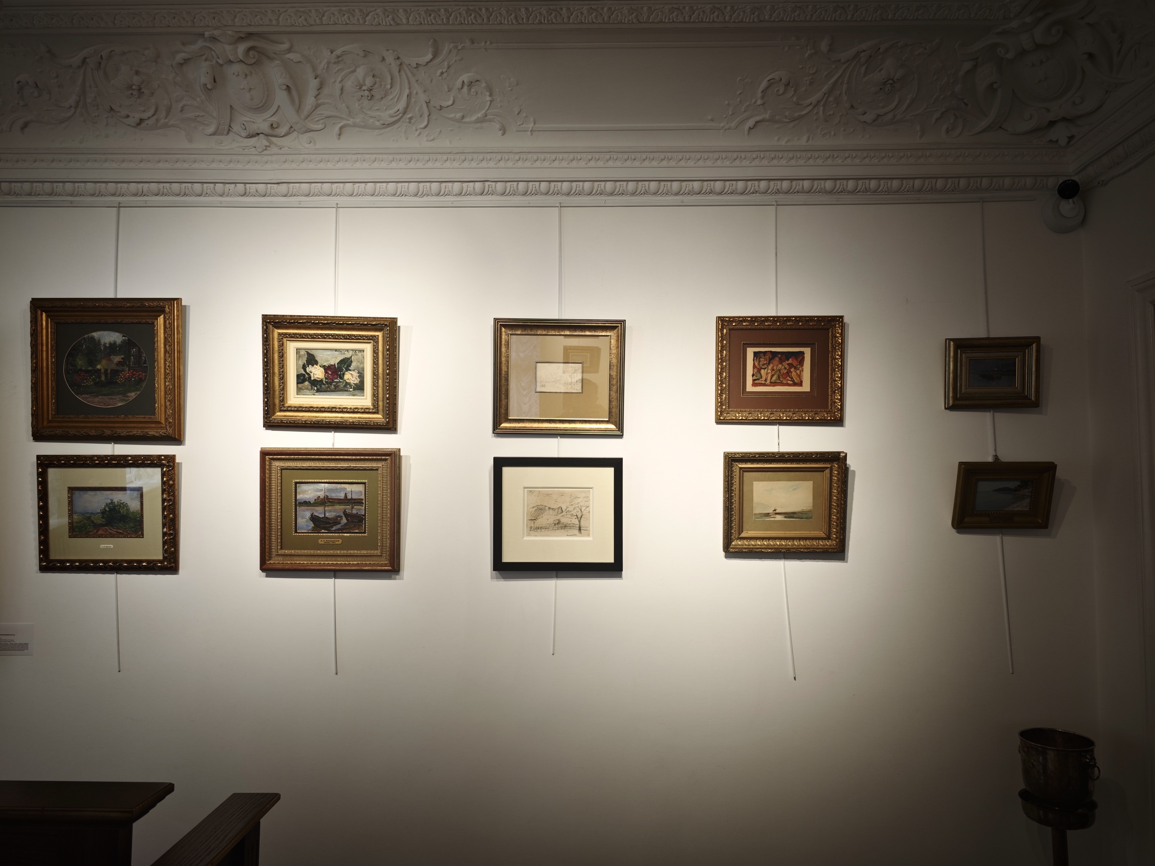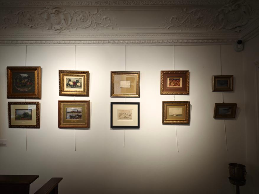 Работы по традиции занимают основной, выставочный, зал Московского аукционного дома, однако на этот раз беглый осмотр из середины комнаты ничего не даст. Картины (ну или картинки) действительно крошечные: