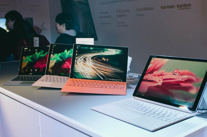 И, наконец, традиционная гордость тайваньцев, ASUS Transformer. На этот раз версии 3 Pro (хорошо, что они не назвали его как в свое время «Билайн» Pro 3). Линейка знакомая, гибридное мобильное устройство «2-в-1». Условно говоря, это планшет со встроенной подставкой + полноценная клавиатура на магнитах. В комплекте идет ручка. Заявленная стоимость 93 990 (о боже мой).
