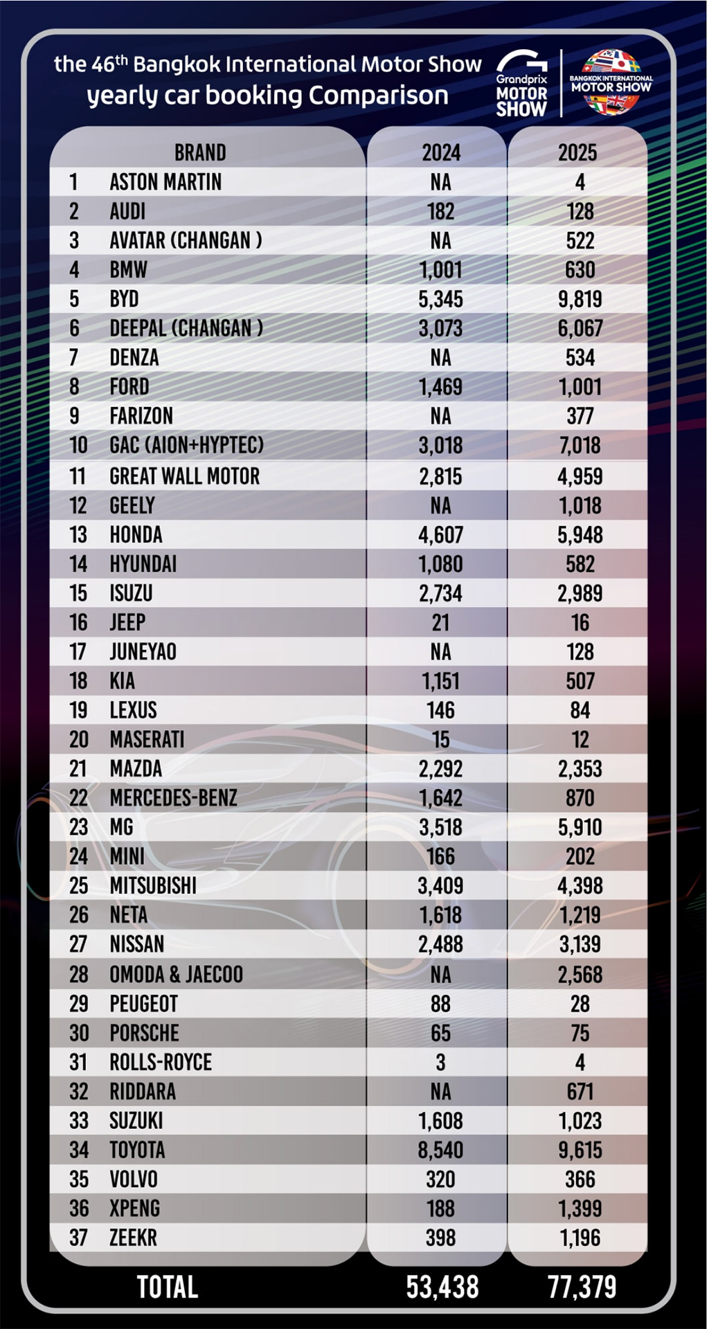 На основании собранных данных о бронированиях на мероприятии пятерка автопроизводителей с наибольшим количеством бронирований транспортных средств выглядит следующим образом: BYD возглавил рейтинг с 9819 бронированиями, за ним следуют Toyota с 9615 бронированиями, GAC с 7018 бронированиями, Deepal с 6067 бронированиями и Honda с 5948 бронированиями.