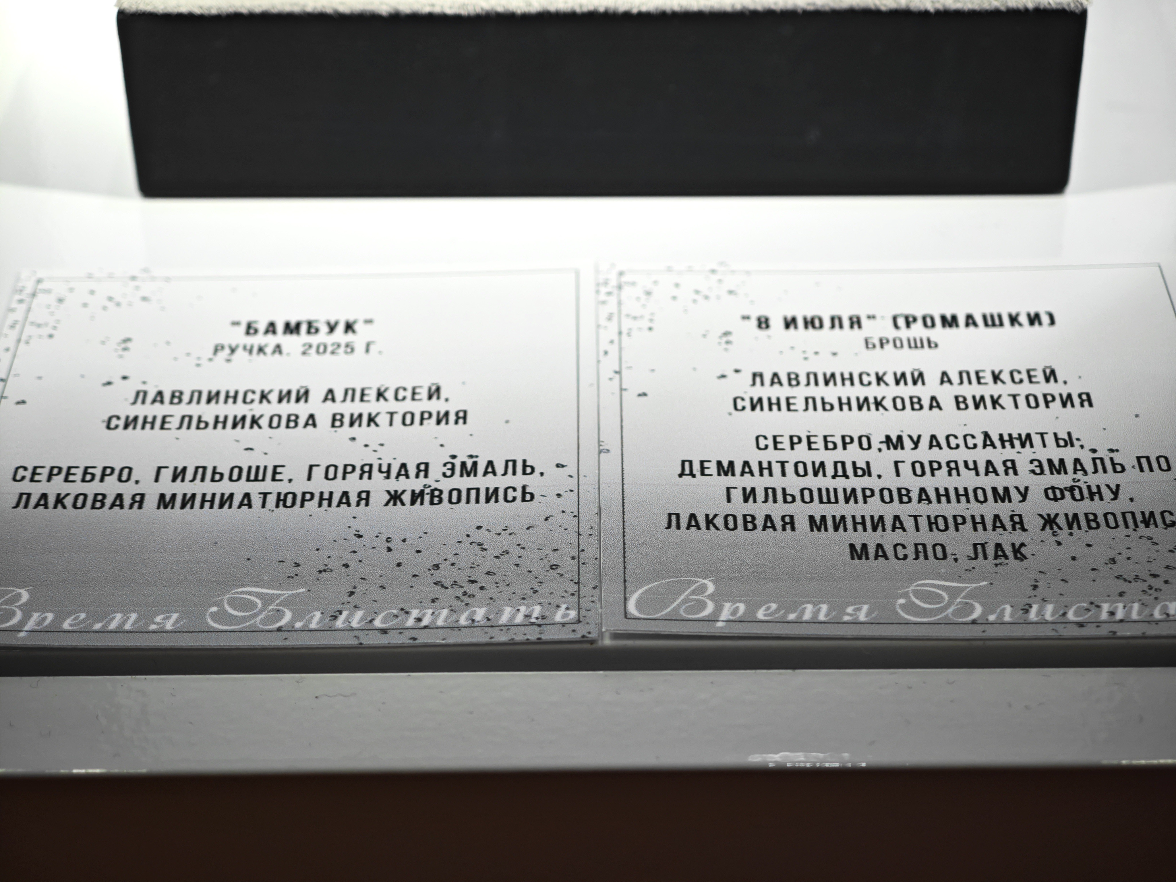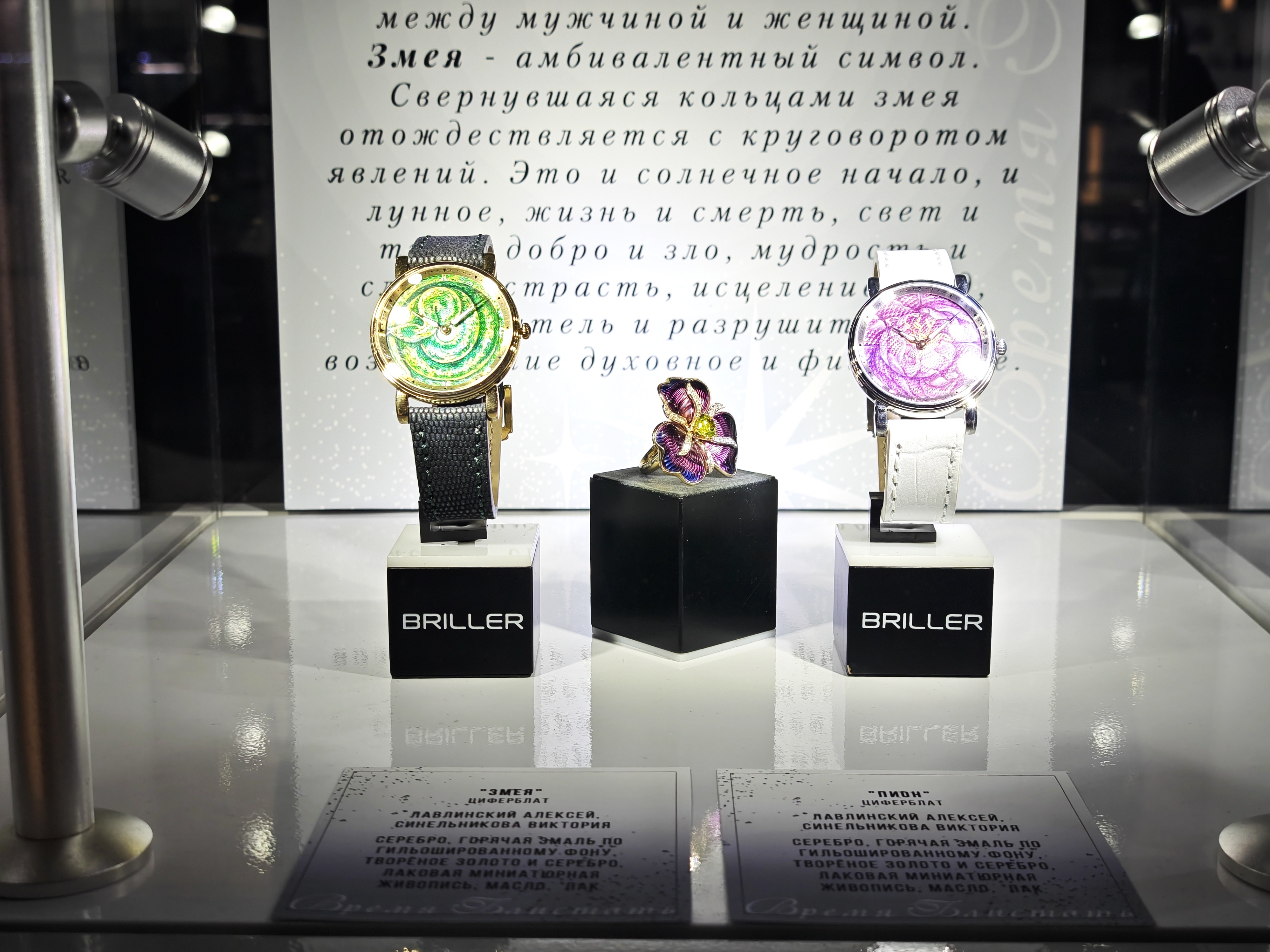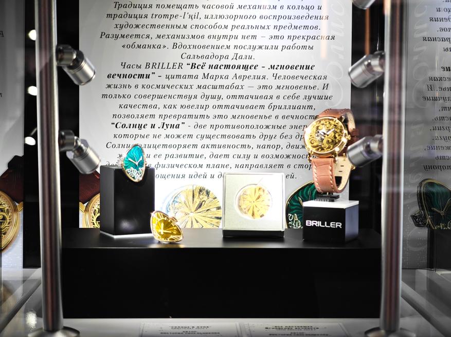 Название выставки — «Время блистать» — прямая отсылка к ювелирно-часовому бренду Briller, чей слоган в переводе с французского и переводится таким образом. Работы именно этого бренда открывают и закрывают экспозицию двумя витринами: