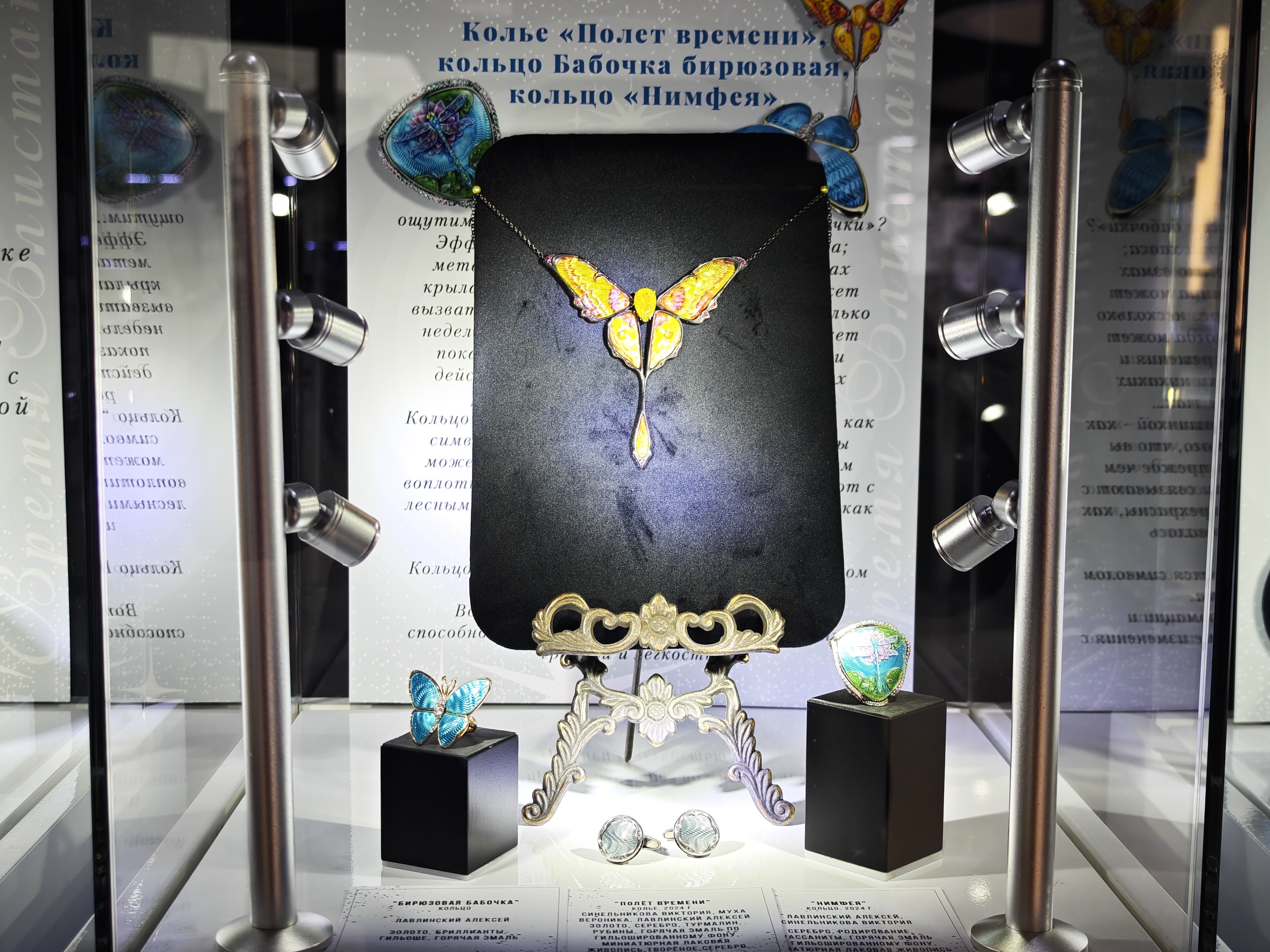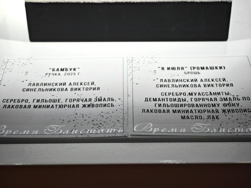 В выставке также принимают участие известные современные мастера: Виктория Синельникова, Алексей Лавлинский, Наталья Орлова. Их работы зритель уже мог видеть на различных ювелирных мероприятиях, в собраниях музеев, например, в ГИМе.