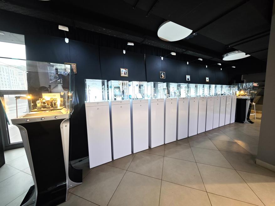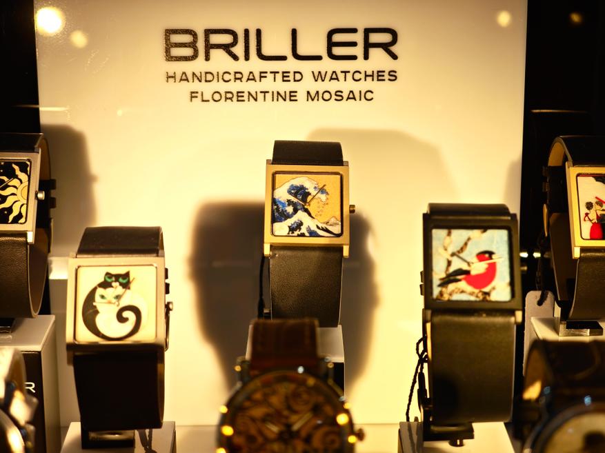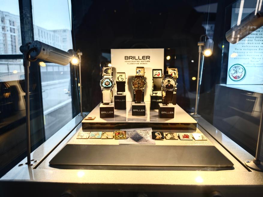 Здесь же, над витринами, можно увидеть и картины, выполненные в технике Флорентийской мозаики, которые дублируют циферблаты наиболее популярных часов из коллекции Briller: