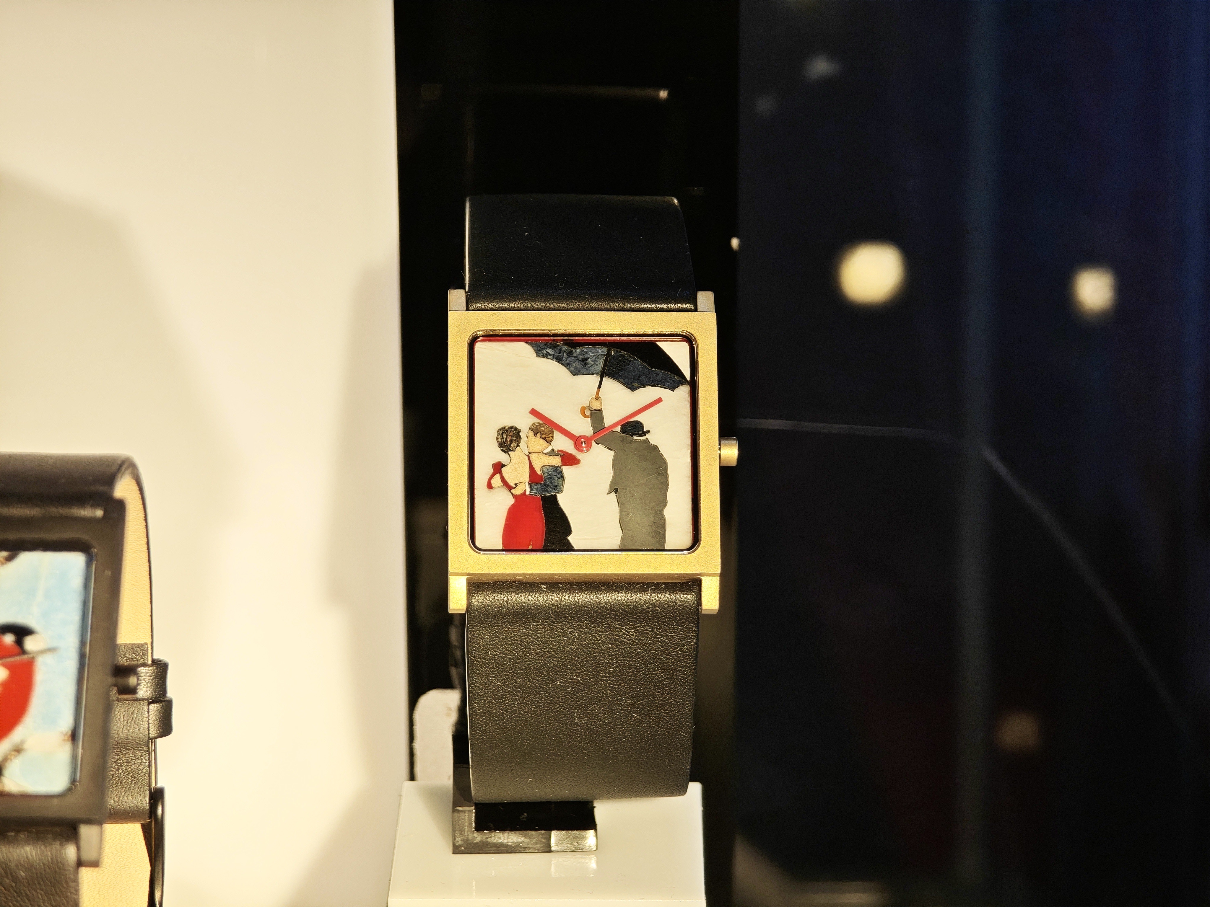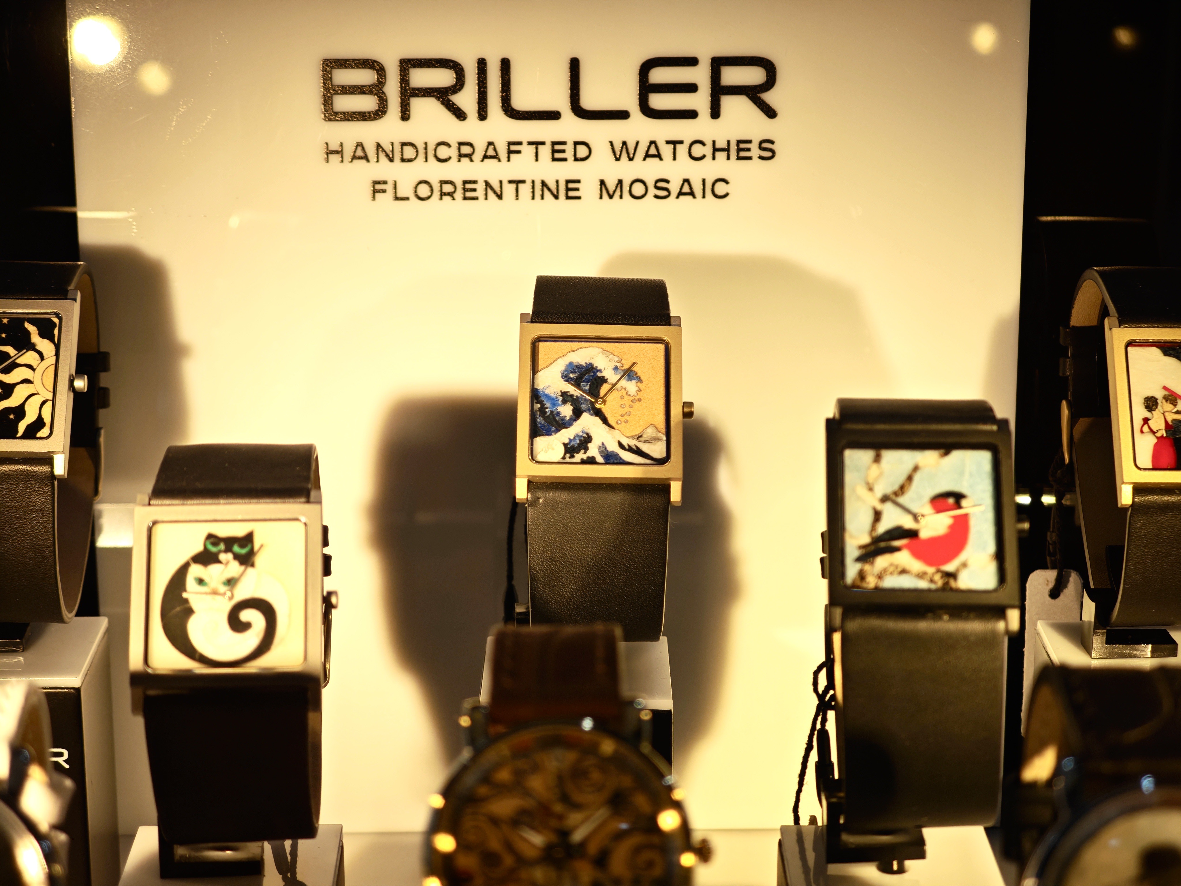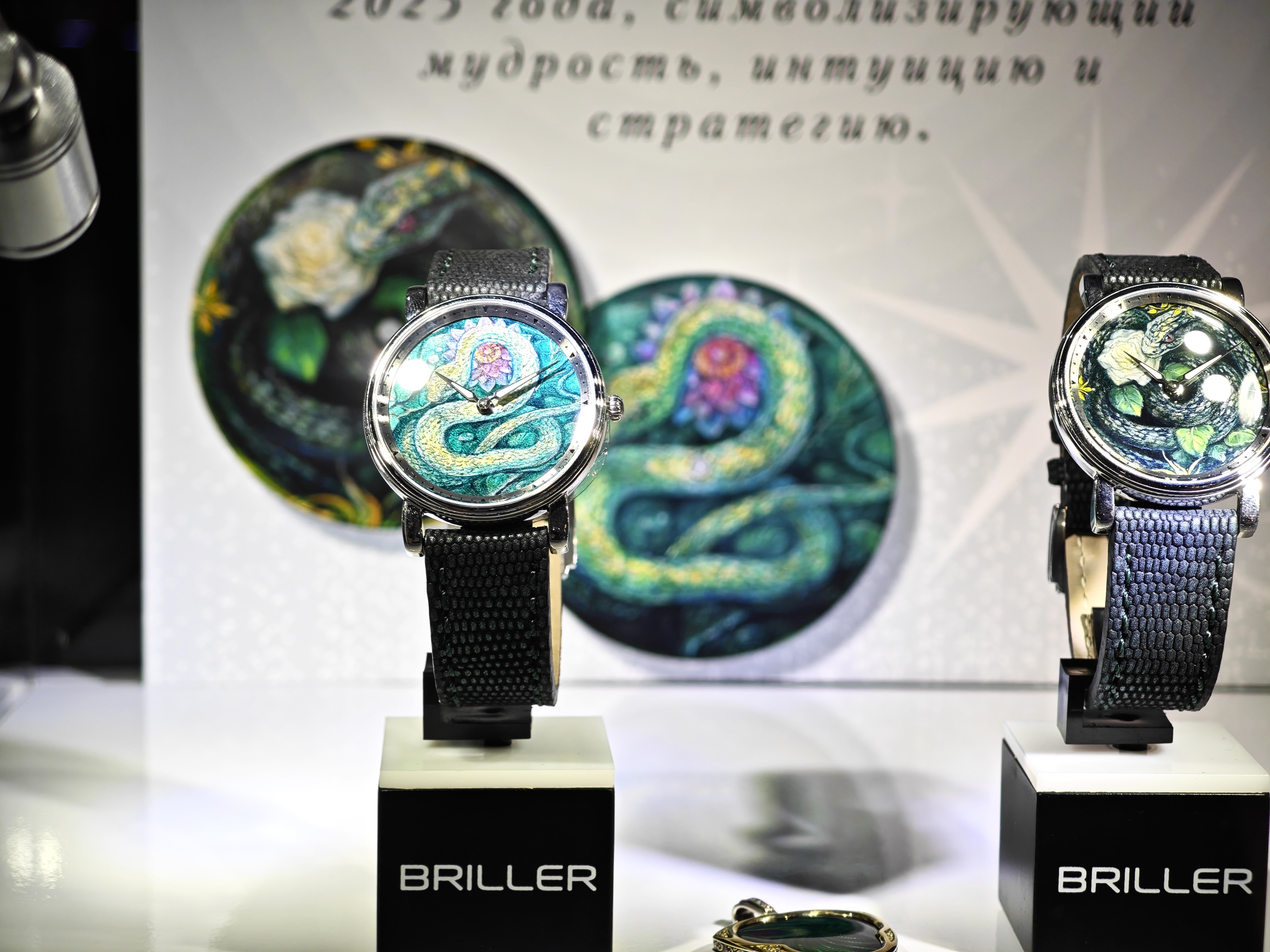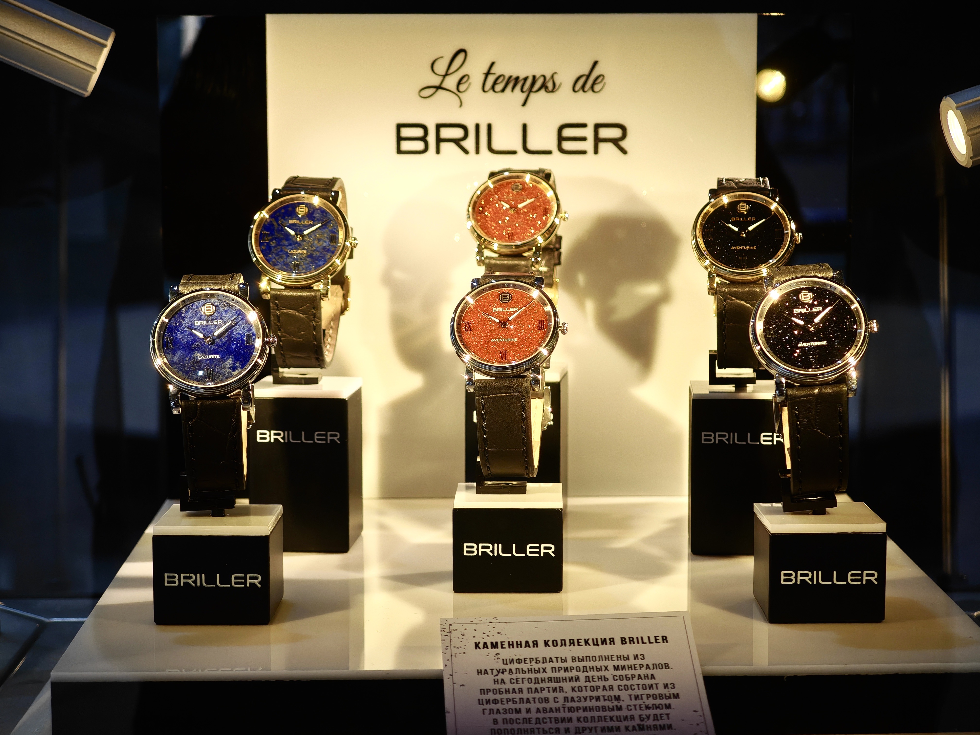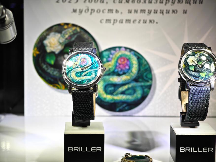В первой витрине можно видеть часы и отдельные циферблаты, которые выполнены в технике Флорентийской мозаики. С этих часов пару лет назад и стартовал Briller, впервые показав ассортимент на московской часовой выставке.