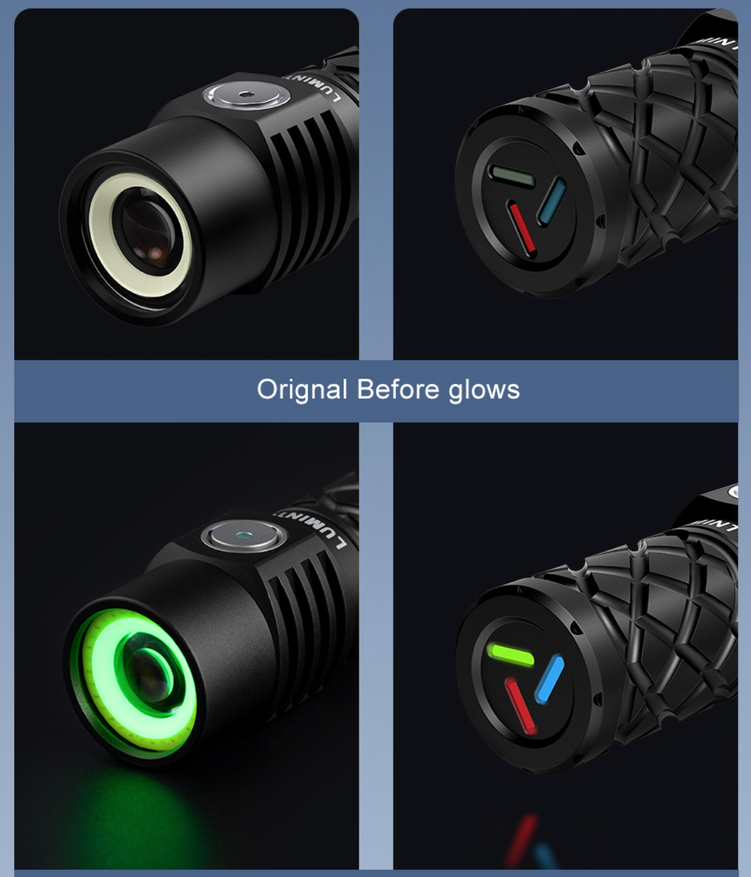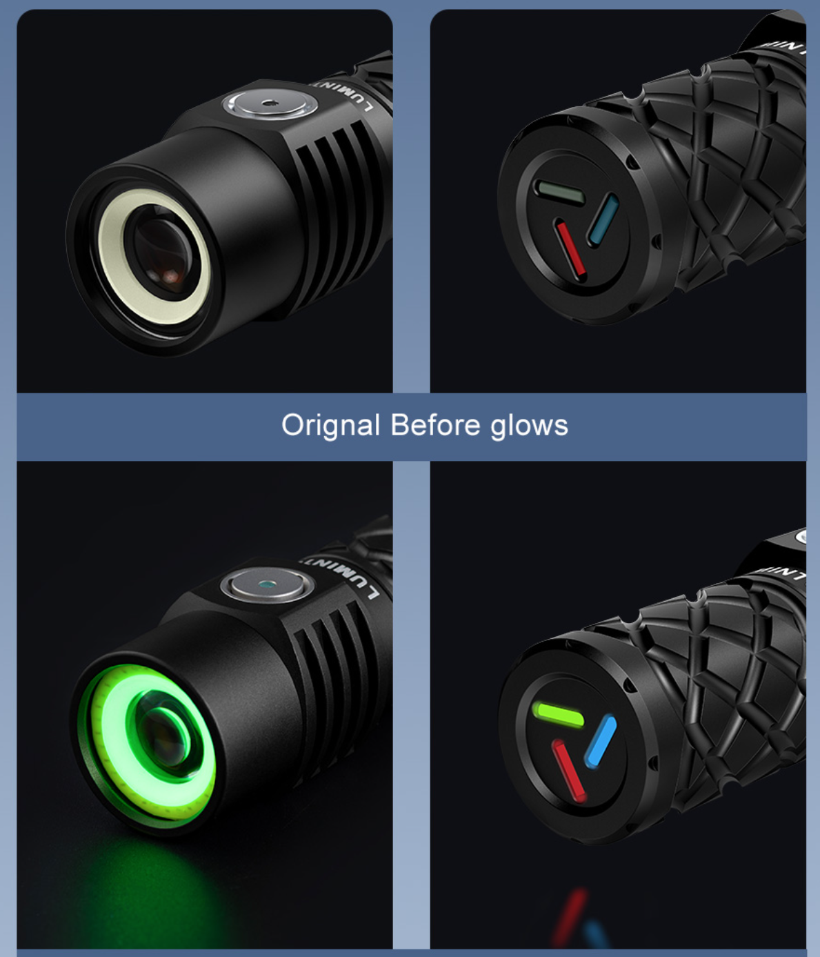 Как можно увидеть на фото выше, под кольцом COB-светодиода находится светонакапливающий круг, который светится после выключения фонарика и позволяет с большей лёгкостью найти его в темноте. Также для этой цели в хвосте Lumintop W3 находятся три посадочных места под колбочки с популярным в EDC-сообществе светящимся радиоактивных газом тритием (или обычными фосфоресцирующими того же размера).