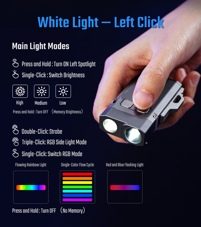 Только единственный вариант света в аккумуляторном фонаре это не всегда практично для разных сценариев применения. Современный тренд в EDC фонарях — добавлять разных вариантов света, помимо основного белого. Компания из Гонконга MecArmy представила на «Кикстартер» свой вариант компактного фонаря для разных задач (масса 70 г.). Модель SGN8 выпускается с основным белым свечением на 1100 люмен с температурой 5700K, либо УФ светом для специальных задач, плюс рассеянный свет с TIR линзой, и дополнительная боковая COB полоска RGB (она же работает наглядным индикатором заряда аккумулятора).