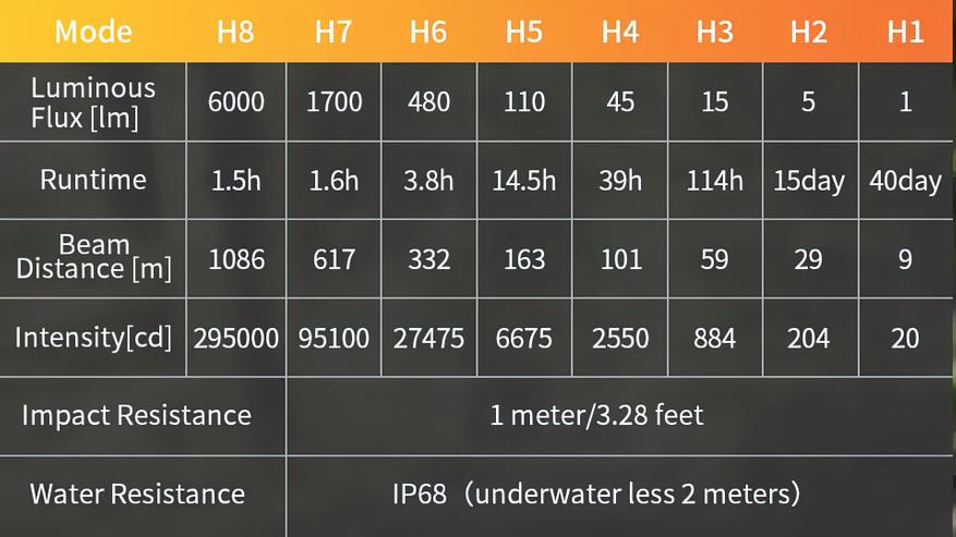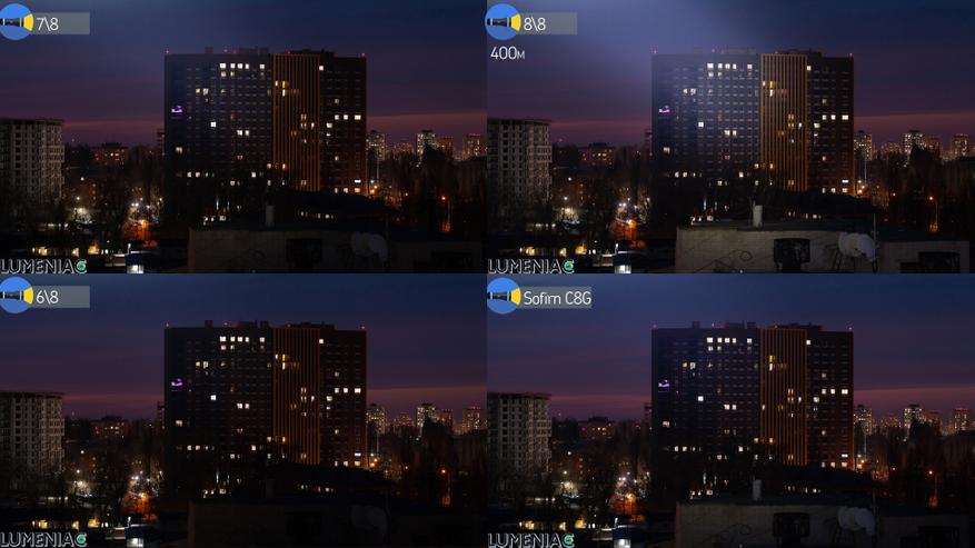 Между прочим, тот же старший 7\8 режим по яркости сопоставим с турбо режимом для Sofirn C8G, но будет светить дальше и работать ощутимо дольше. А 5й режим позволит вам кое-как, но пробить пару сотен метров и он будет работать почти 20часов!