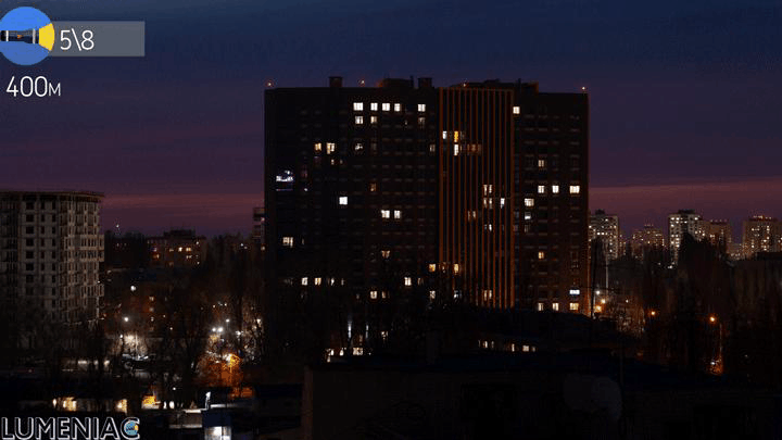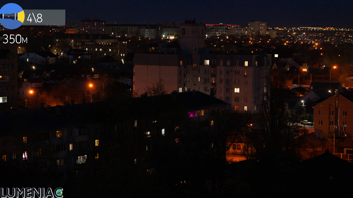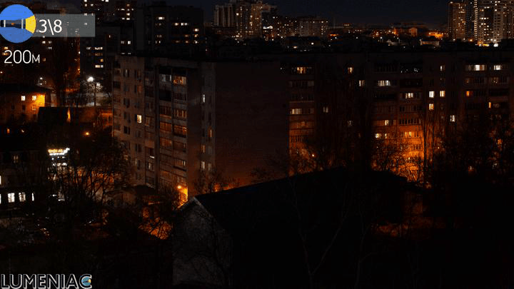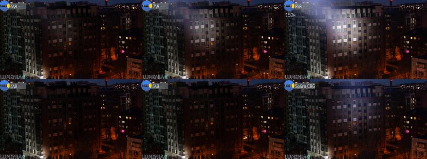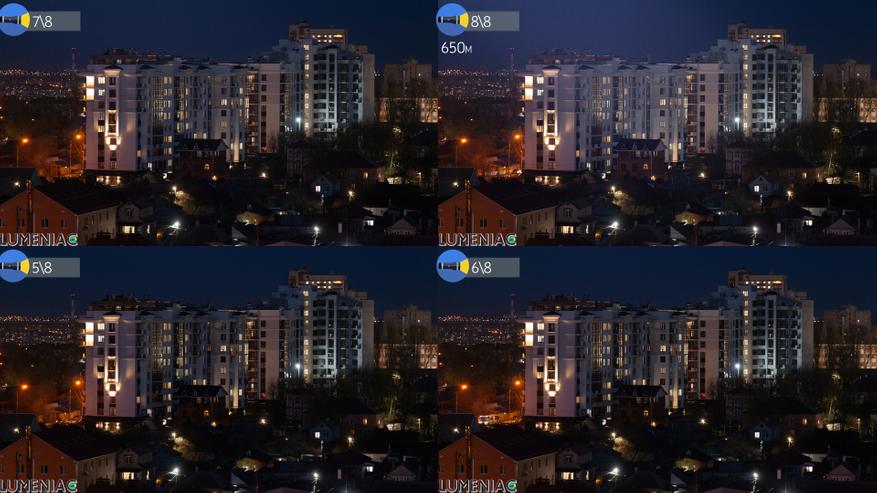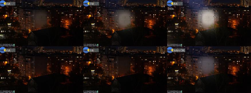 Первые 4 режима годятся лишь в пределах полусотни метров, 5\8 может дотянуться этак за сотню метров, на гифках и фото видно, что деревья подсвечиваются.