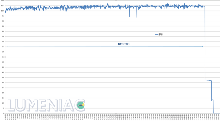Вот смотрите, первый график. На улице при +15 без ветра я увидел 6 минут. А вот в помещении всего-то 30 секунд… Впрочем, кому нужен сугубо дальнобойный режим в комнате? Кстати, тут разница в яркости между аккумуляторами уже сводится к ~5%.