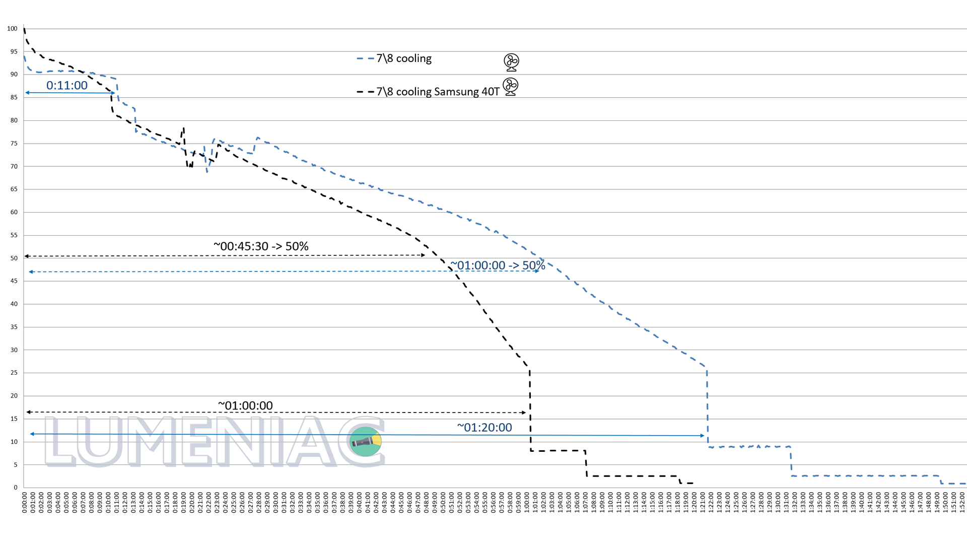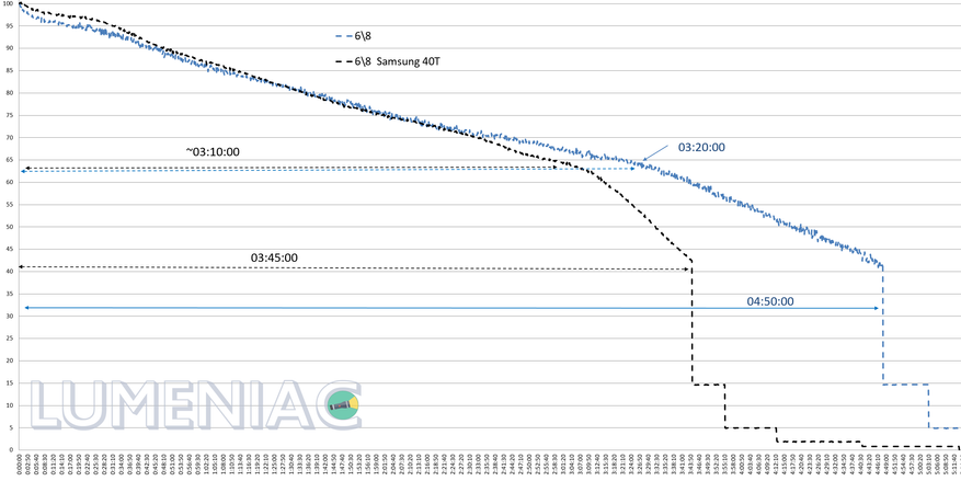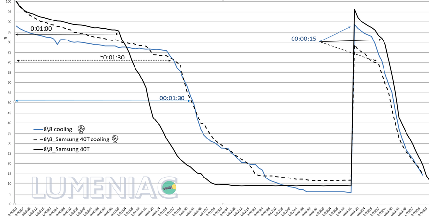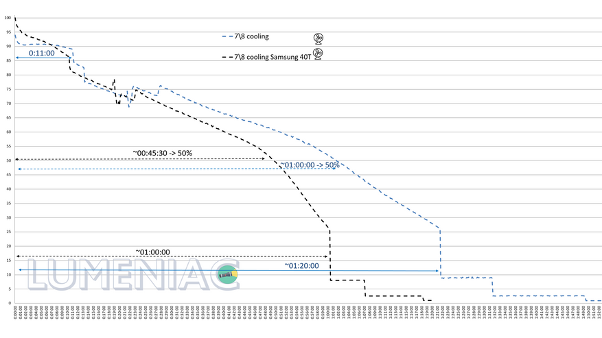 Стоит же на улице включить лёгкий обдув вентилятором и время работы ощутимо меняется. Samsung 40T выигрывает в яркости лишь в самом начале. В дальнейшем комплектный 21700 предпочтительнее за счёт прироста ёмкости и времени работы.