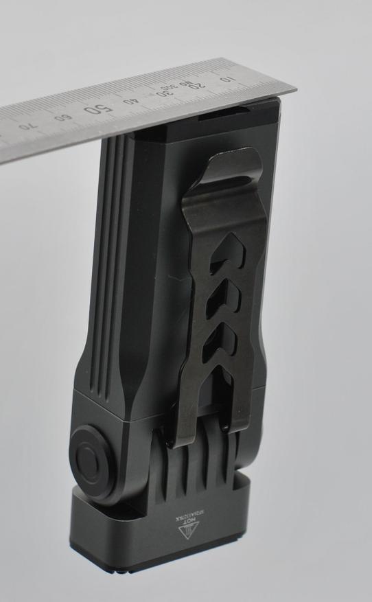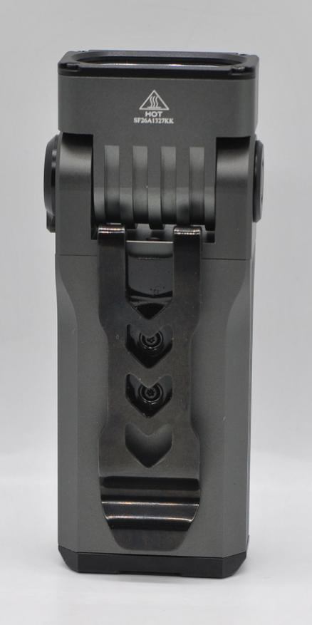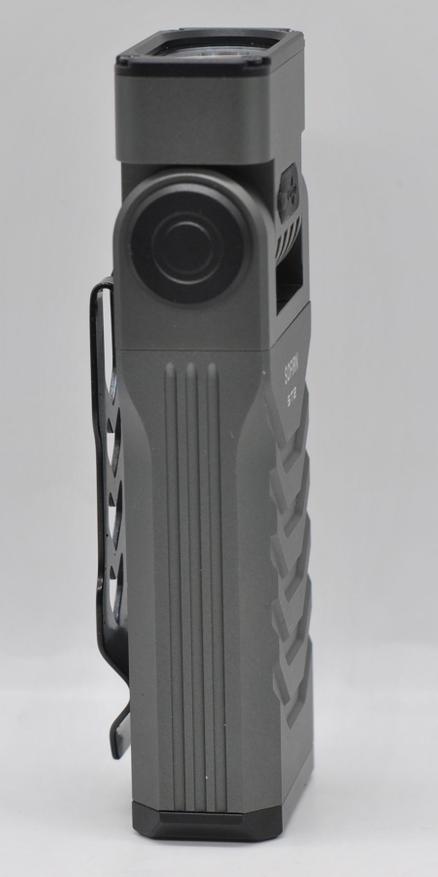 Фонарь ST2 напоминает брутальный алюминиевый брусок с прорезями. Анодирование качественное, основное серо-стальное и черные вставки. Отдельного упоминания достойна клипса, тут скорее «клипсища», посадка глубиной 5,5 см, ширина 2,2 см. Зарядный порт с резиновой защитой расположен на поворотной верхней части.