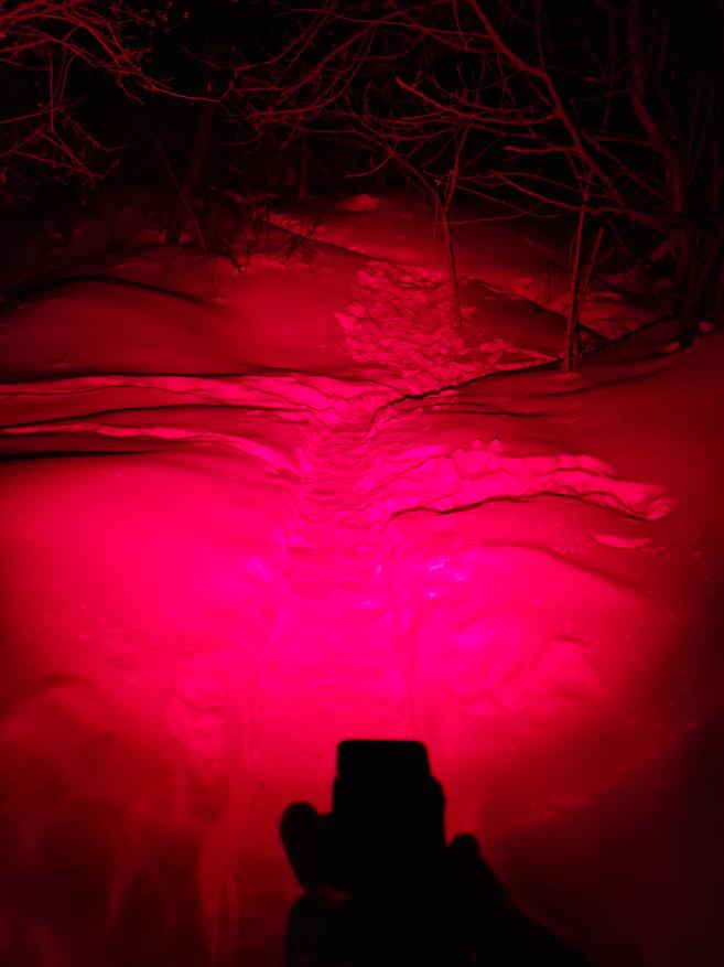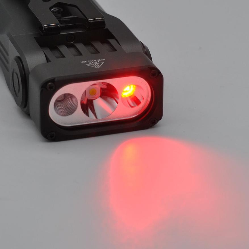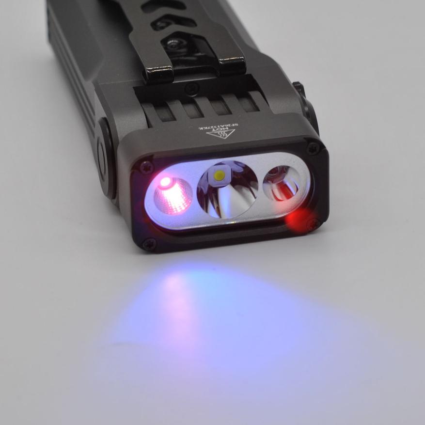 Основной белый с хотспотом (работает как дальний) и стабилизацией яркости в независимости от напряжения аккумулятора, турбо на 1 минуту, далее сброс до стабильных 650 люмен. Красный очень яркий (130 люмен), такой сигнал будет заметен издалека. УФ с небольшой мощностью для бытовых задач (вроде проверки камней и маркировки банкнот).
